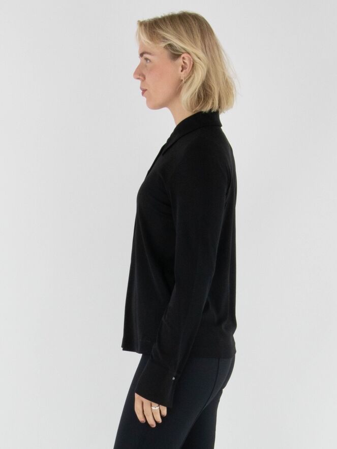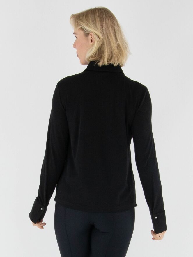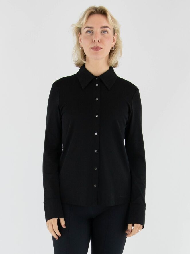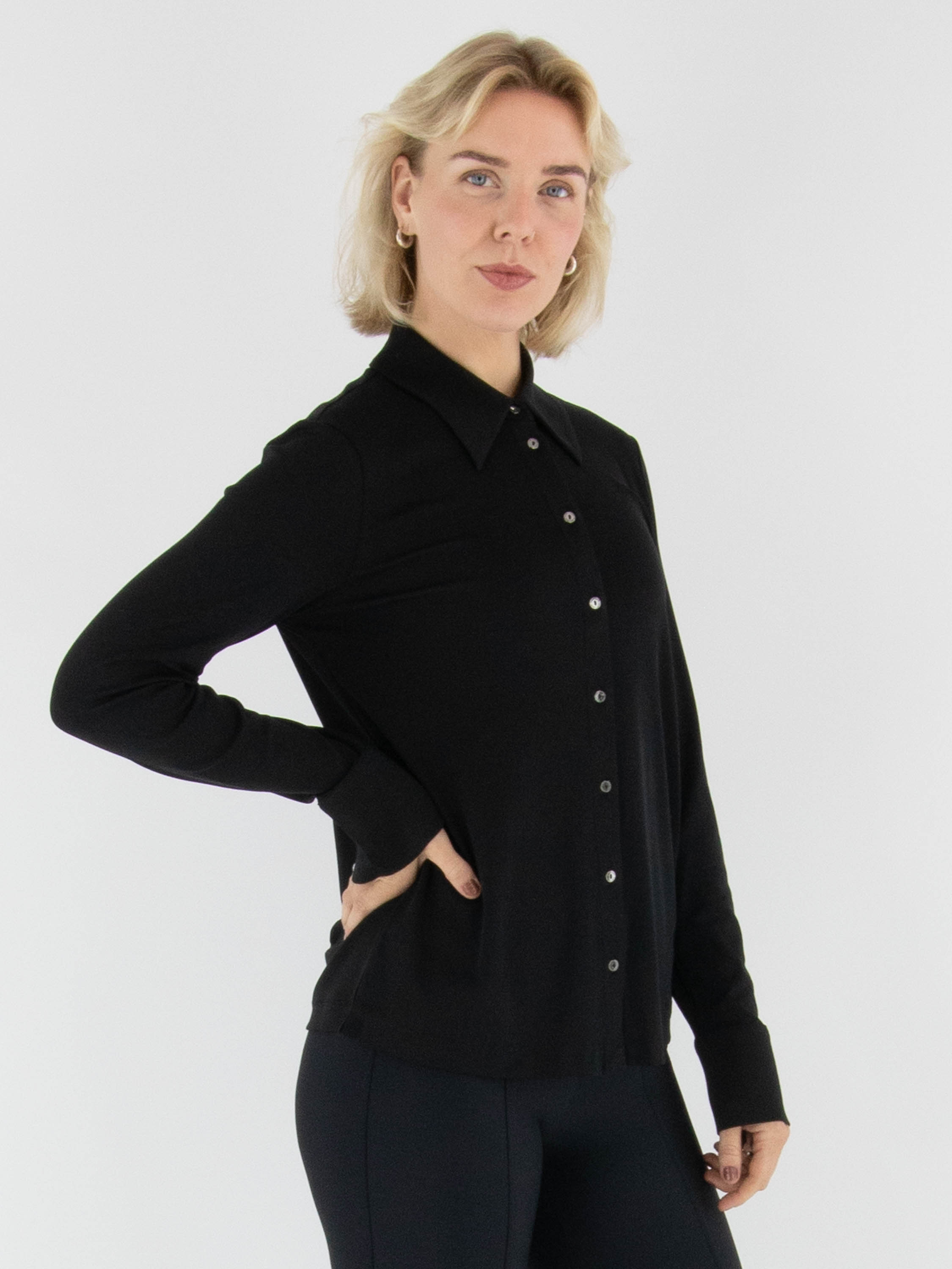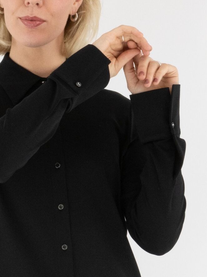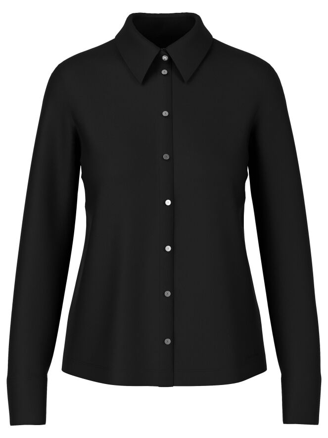 Marc Cain blouse in black. The fastening features silver-coloured buttons, and the cuffs of the sleeves each have a button adorned with a rhinestone. This blouse can be washed at 30 degrees.