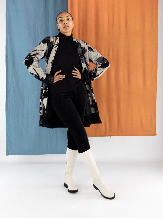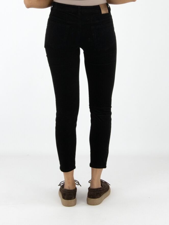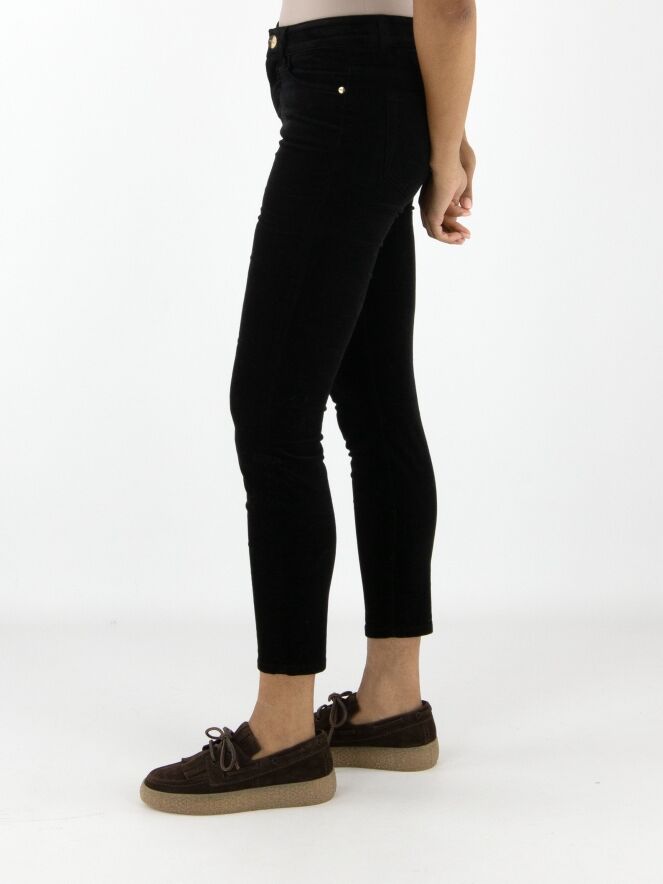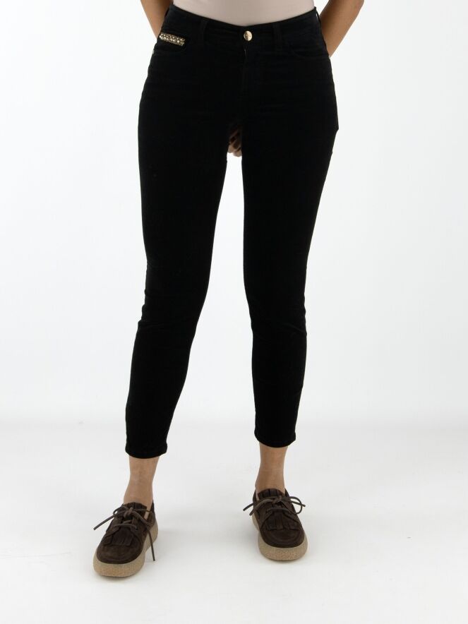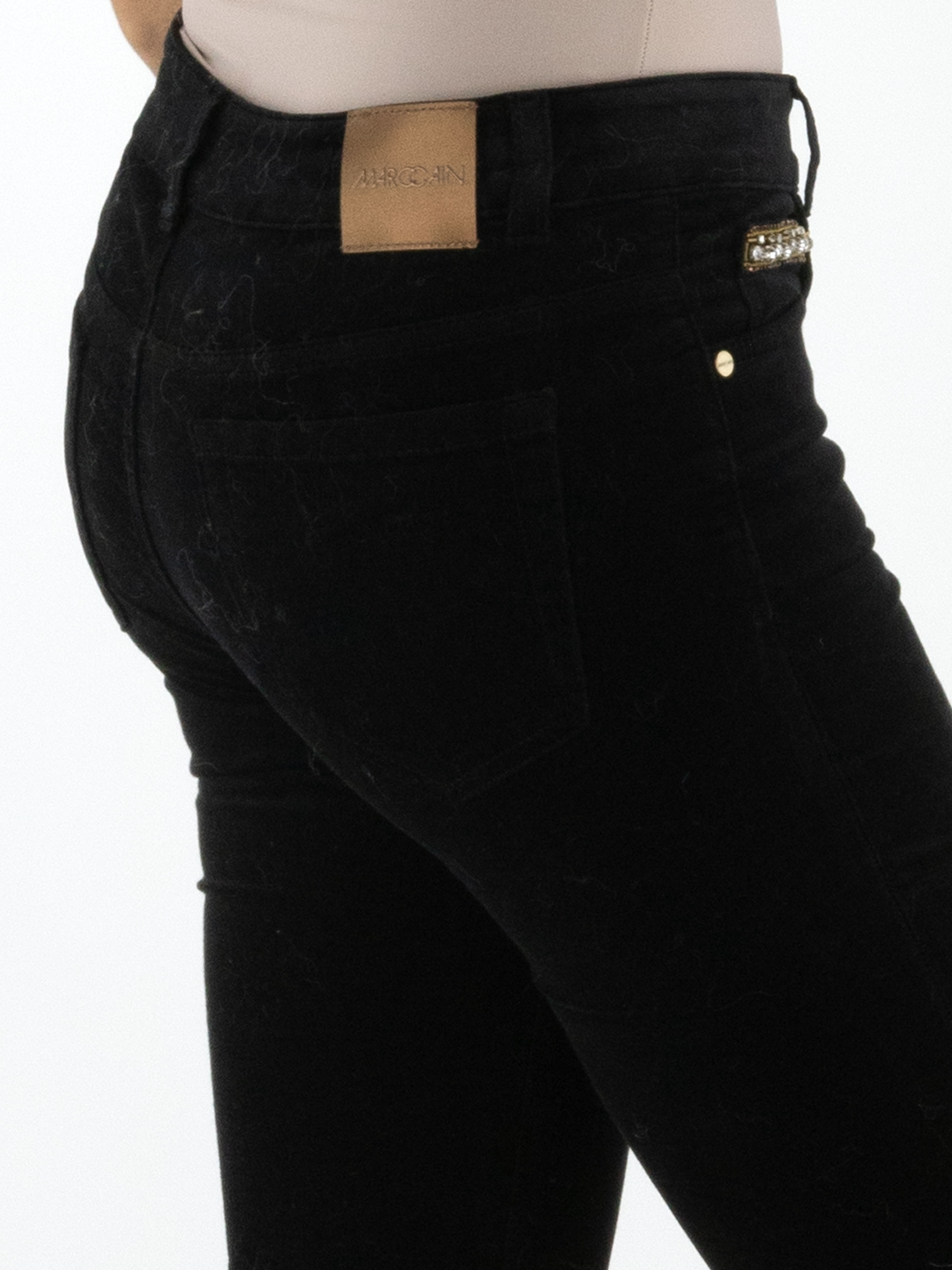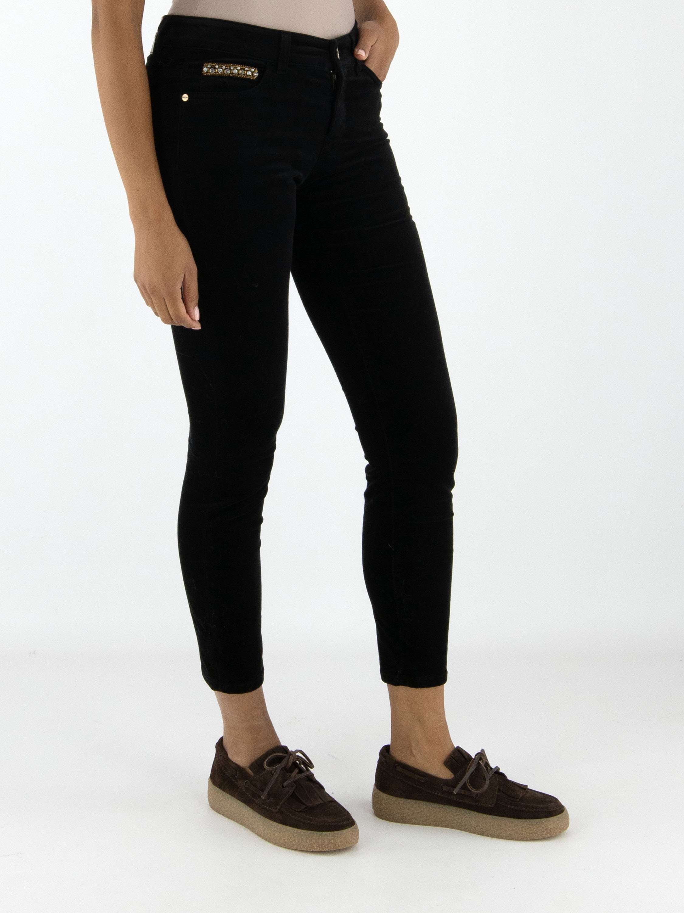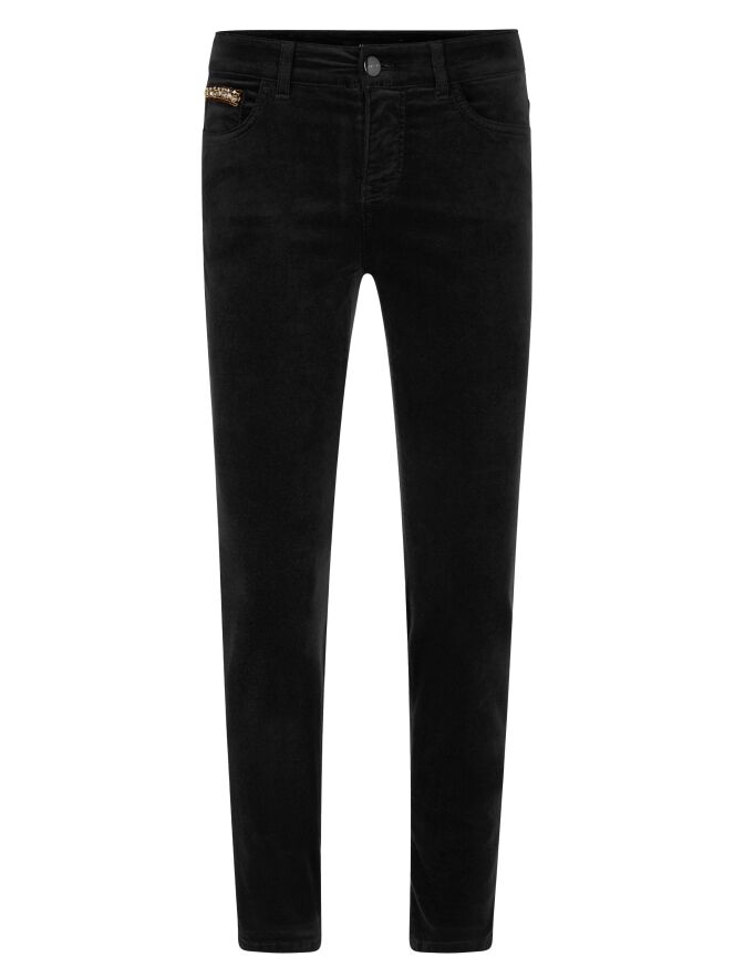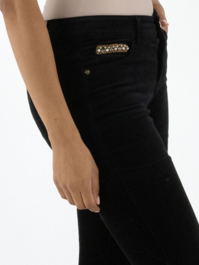 Velour trousers by Marc Cain in black. Designed in a 5-pocket style, they are embellished with rhinestones along the edge of the small front pocket. These trousers can be washed at 30 degrees.