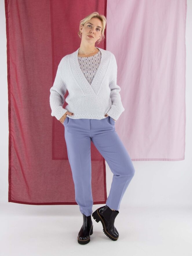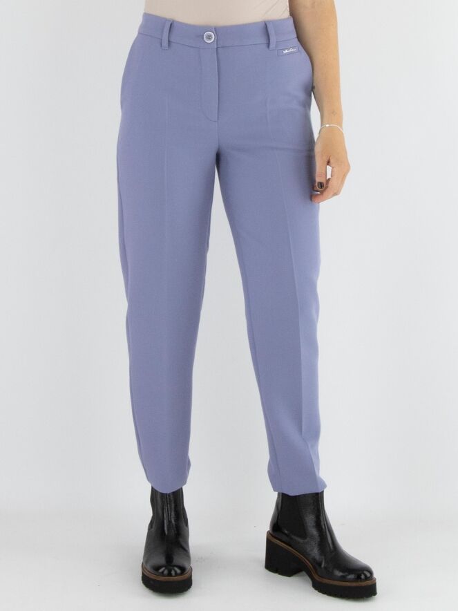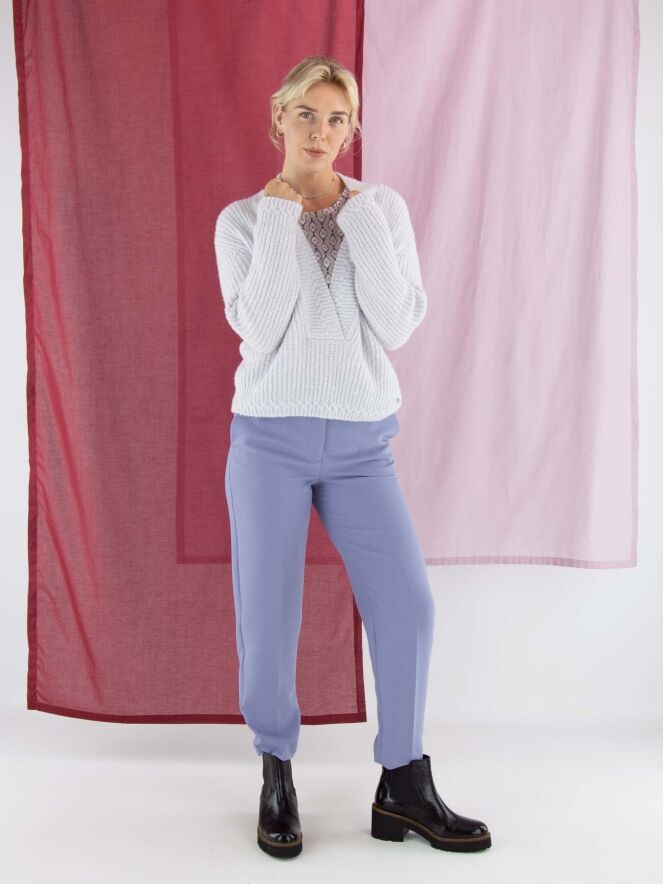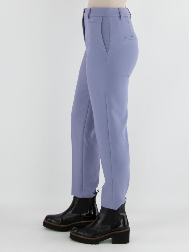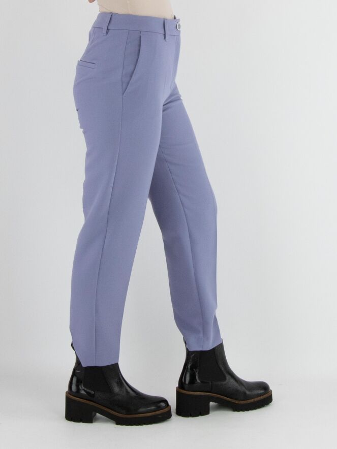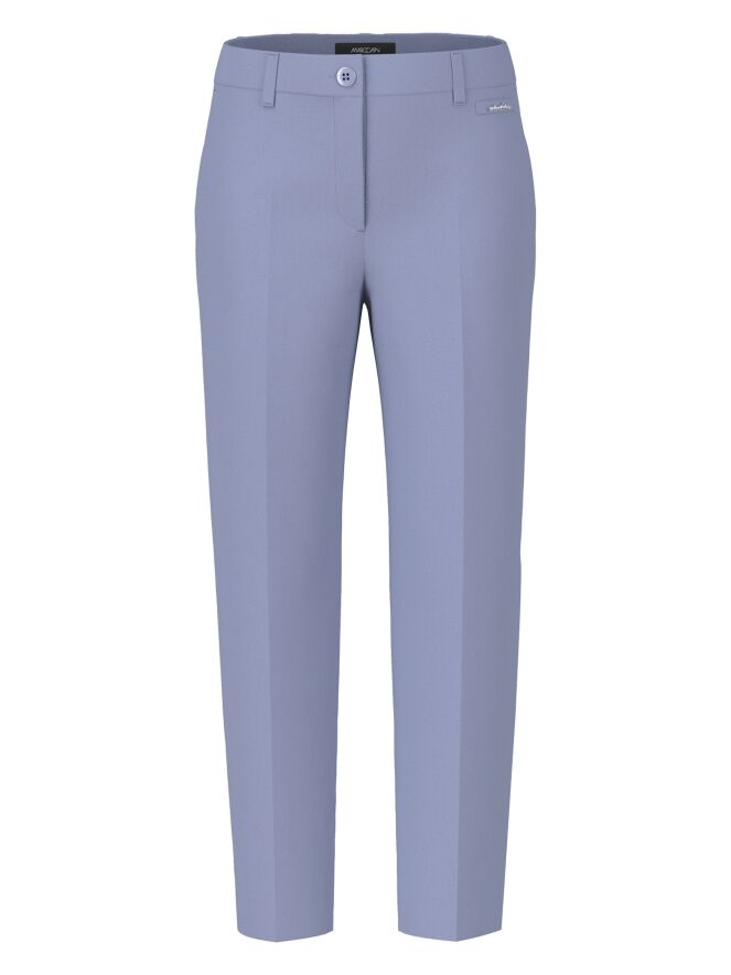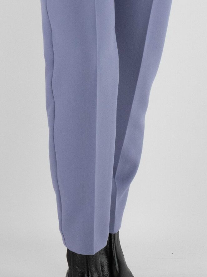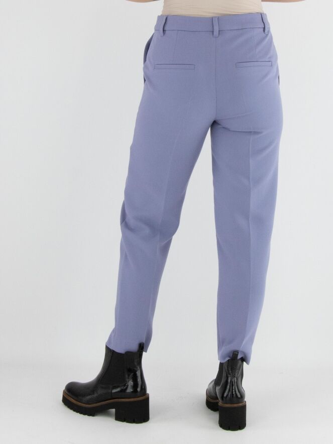 A pair of trousers by Marc Cain in lilac. A pressed crease runs down the front centre of the legs. The trousers feature side pockets and can be washed at 30 degrees.