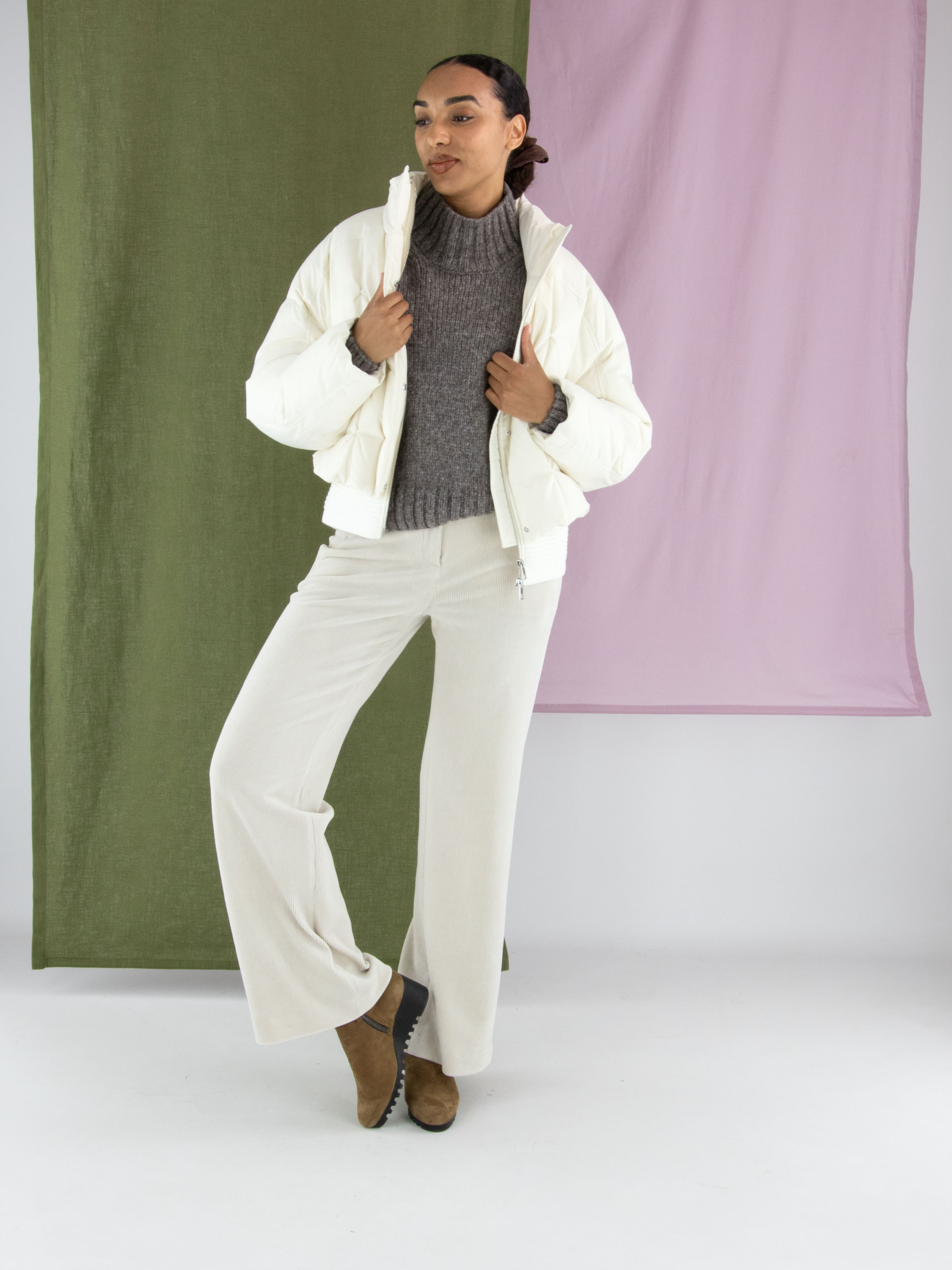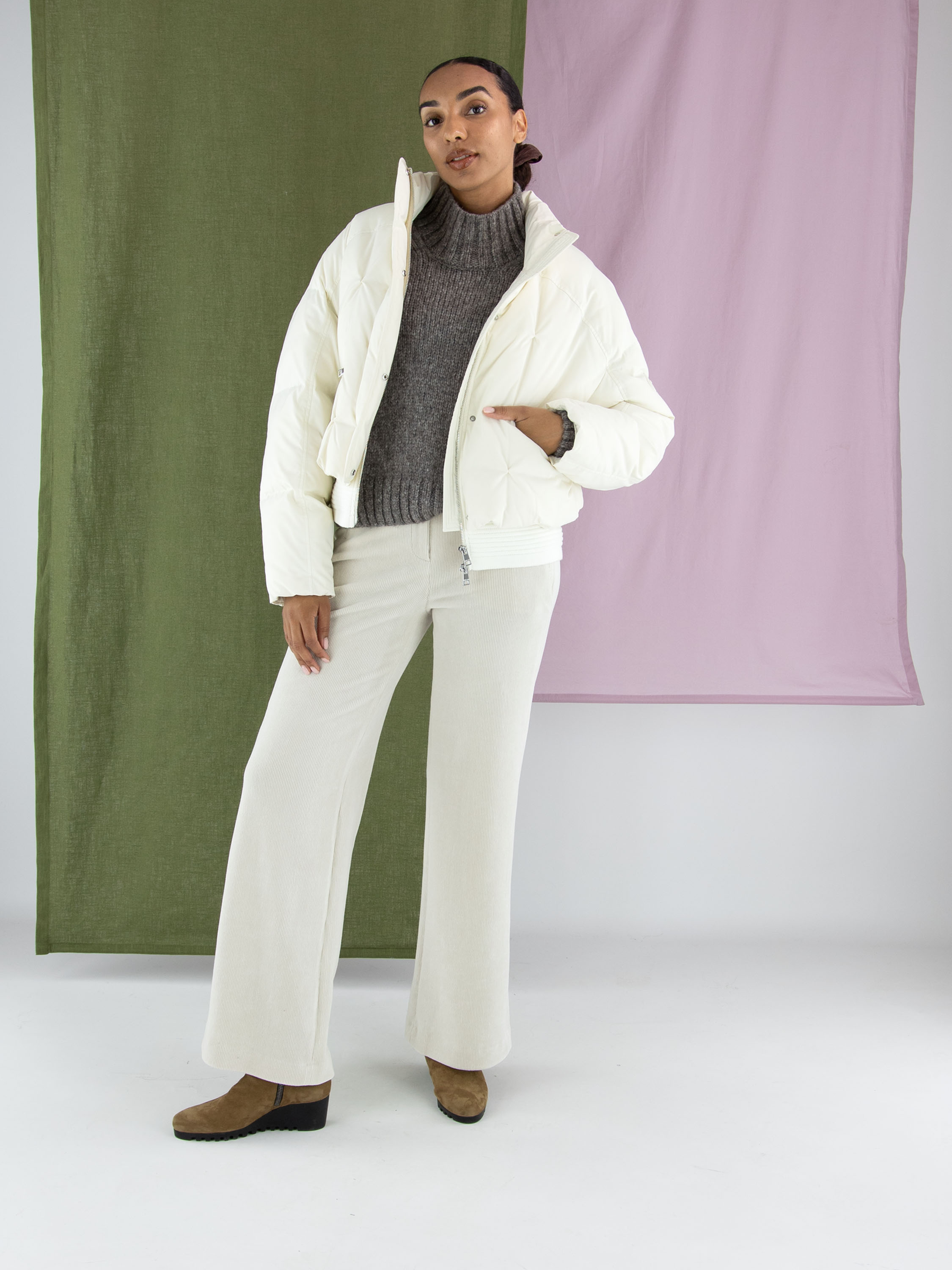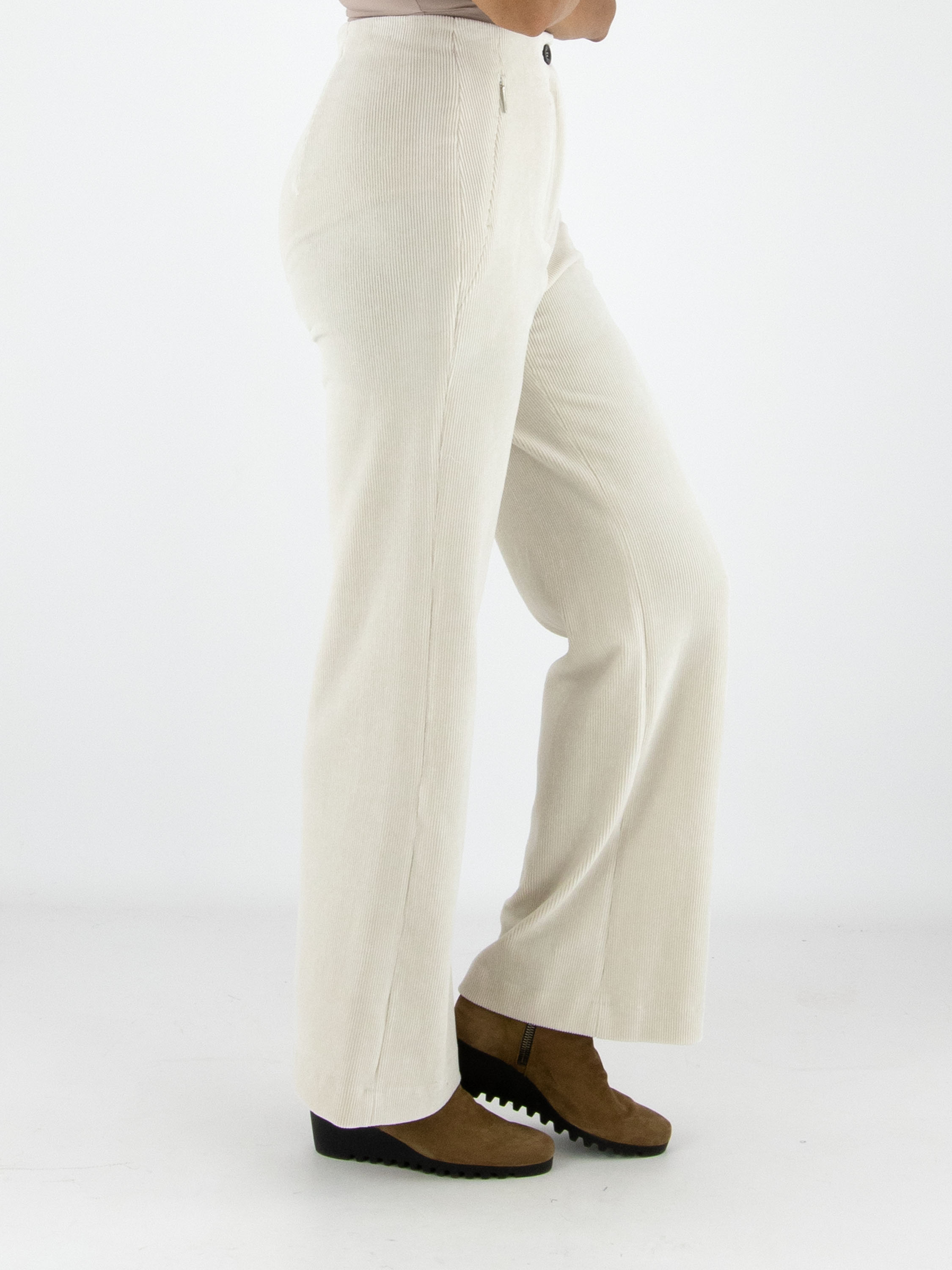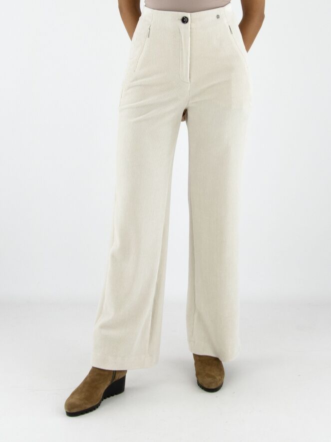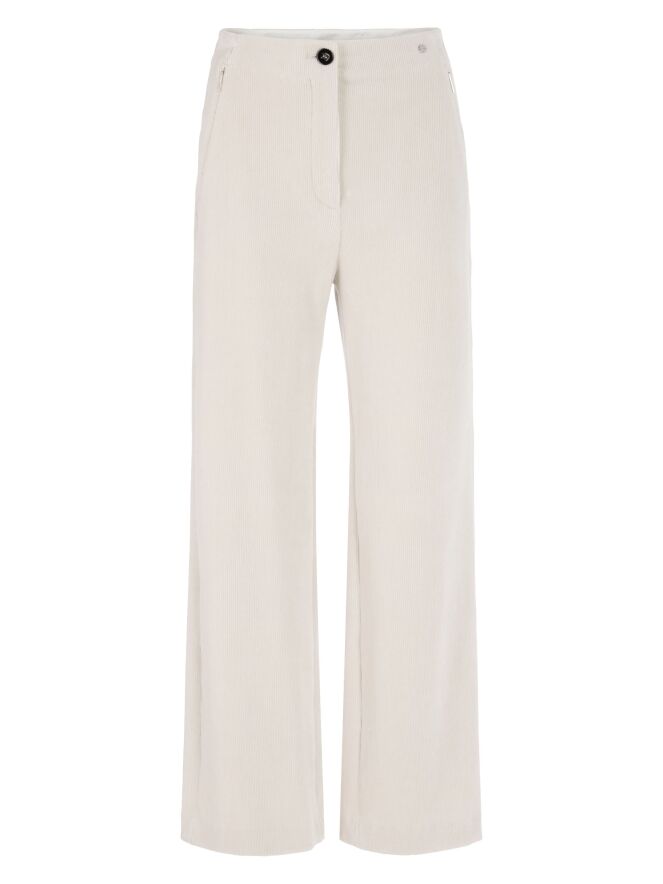 A ribcord trouser by Marc Cain in a sophisticated beige shade. The straight-cut legs create a timeless silhouette, while the side pockets feature practical zip closures. This luxury trouser can be washed at 30 degrees.