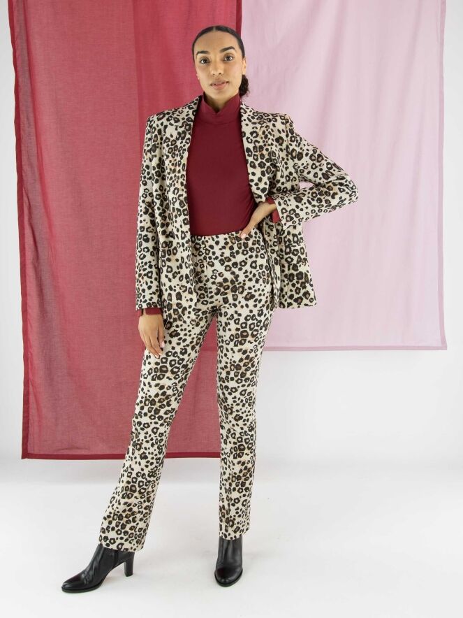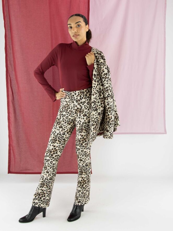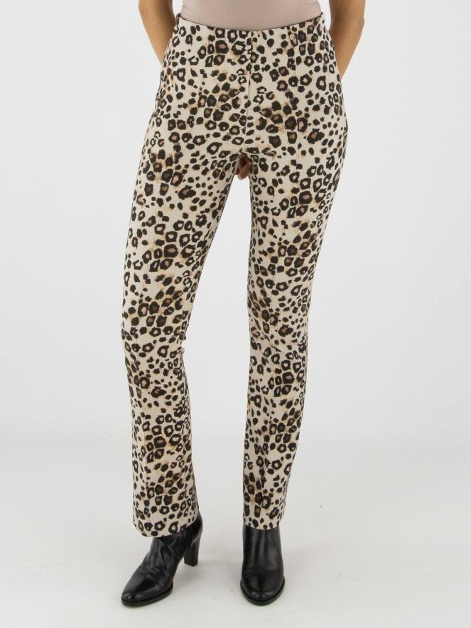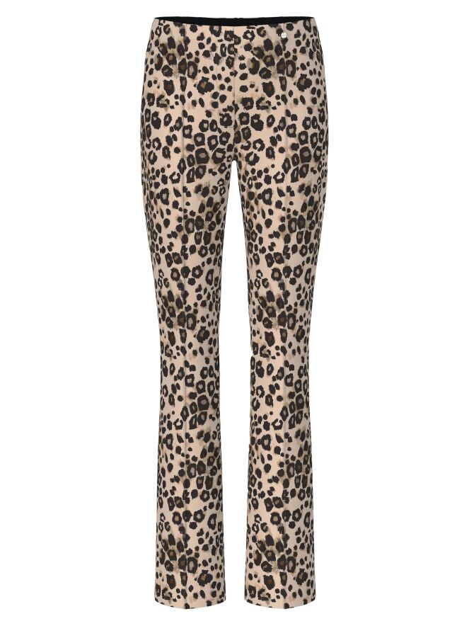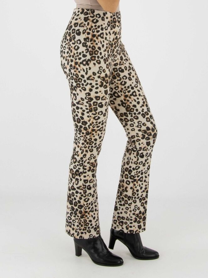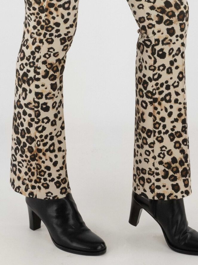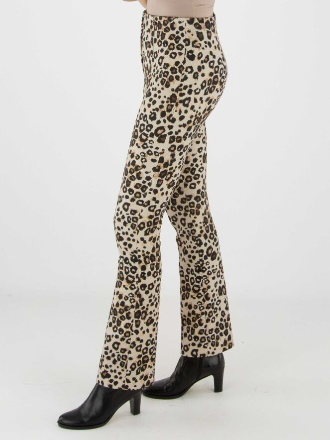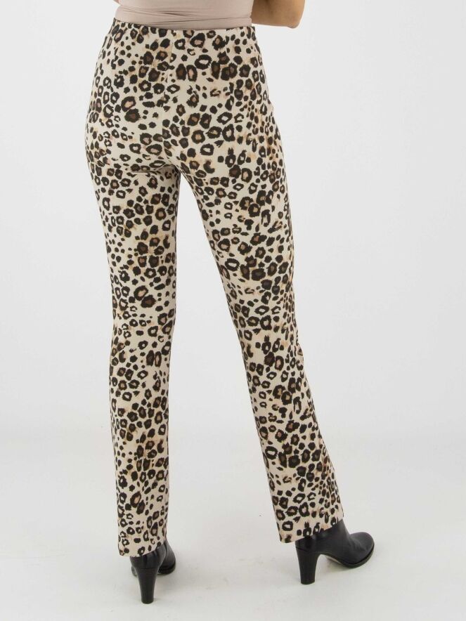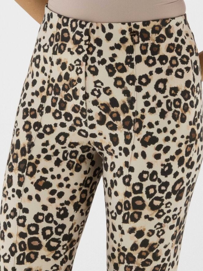 A scuba-style pair of trousers by Marc Cain in a leopard print with various shades of brown and black on a sand-colored background. The waistband is elasticated, and there is a reversed seam running down the center of each leg. These trousers can be washed at 30 degrees.