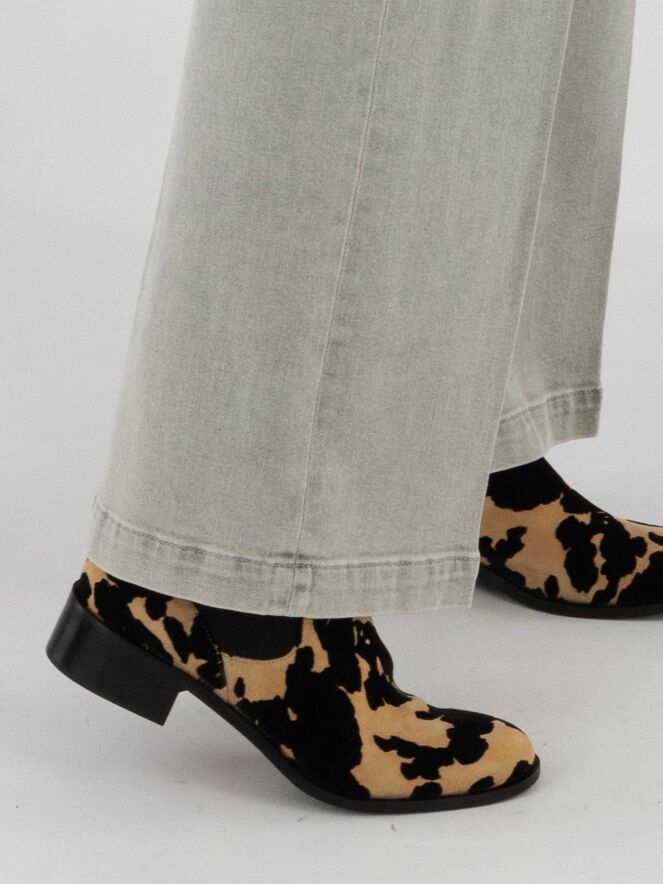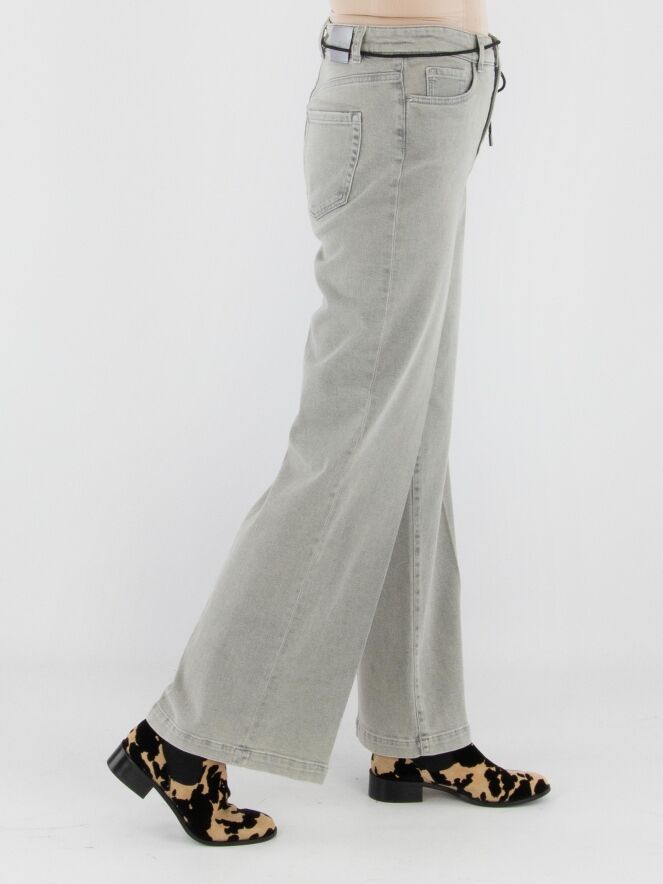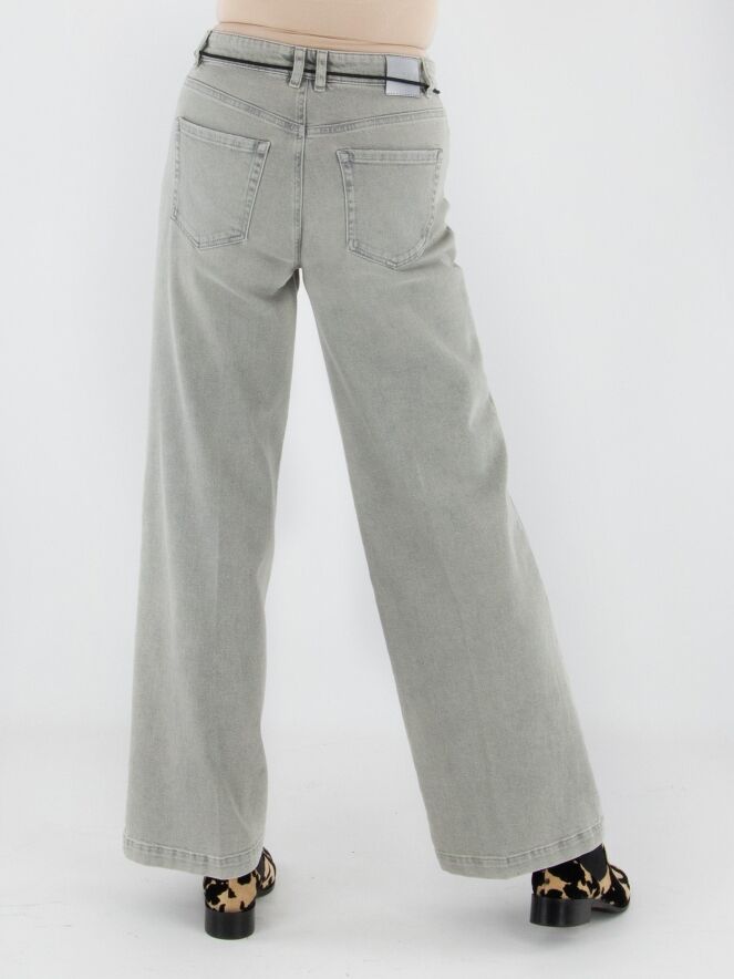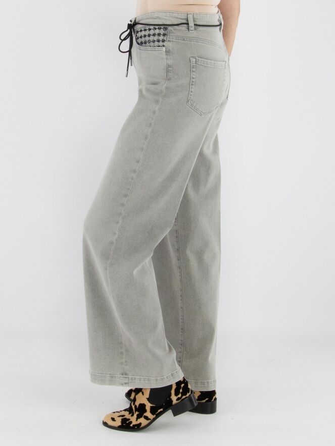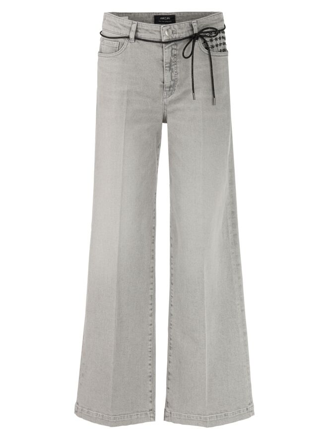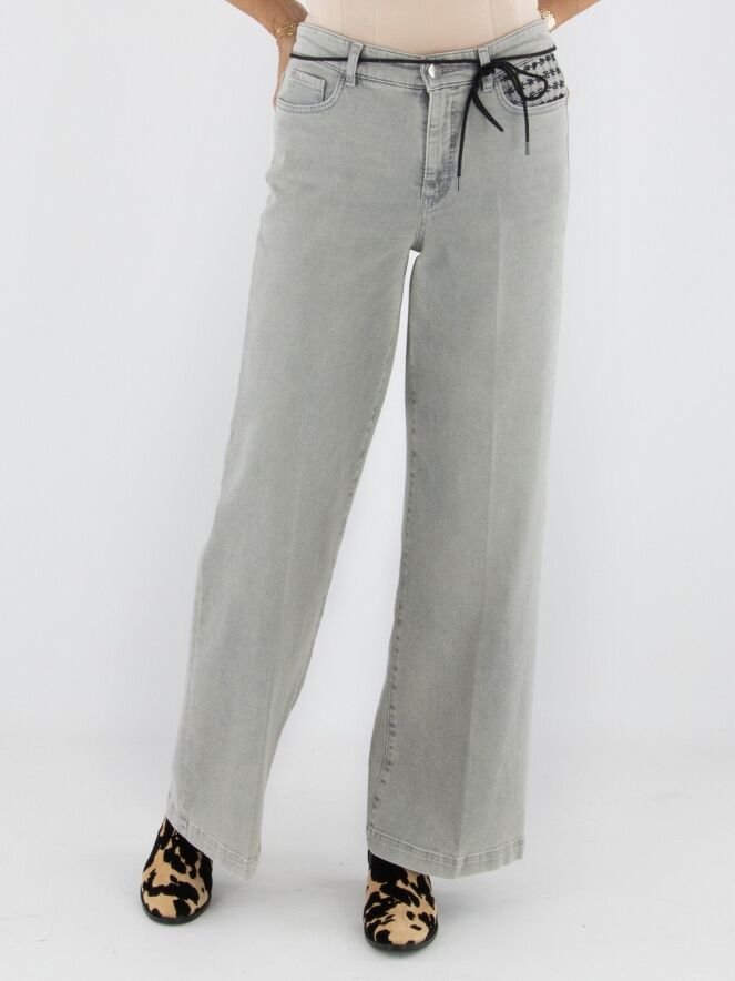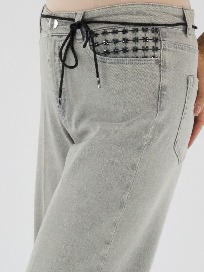 A wide-leg Marc Cain jeans in light grey. This 5-pocket style features a pressed crease along the center of the legs. Above the left pocket, a diamond pattern in black stitching is embellished with decorative rhinestones in the shape of small flowers. These jeans can be washed at 30 degrees.