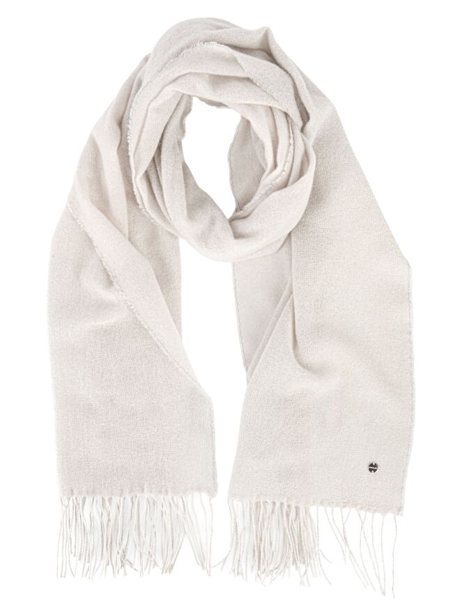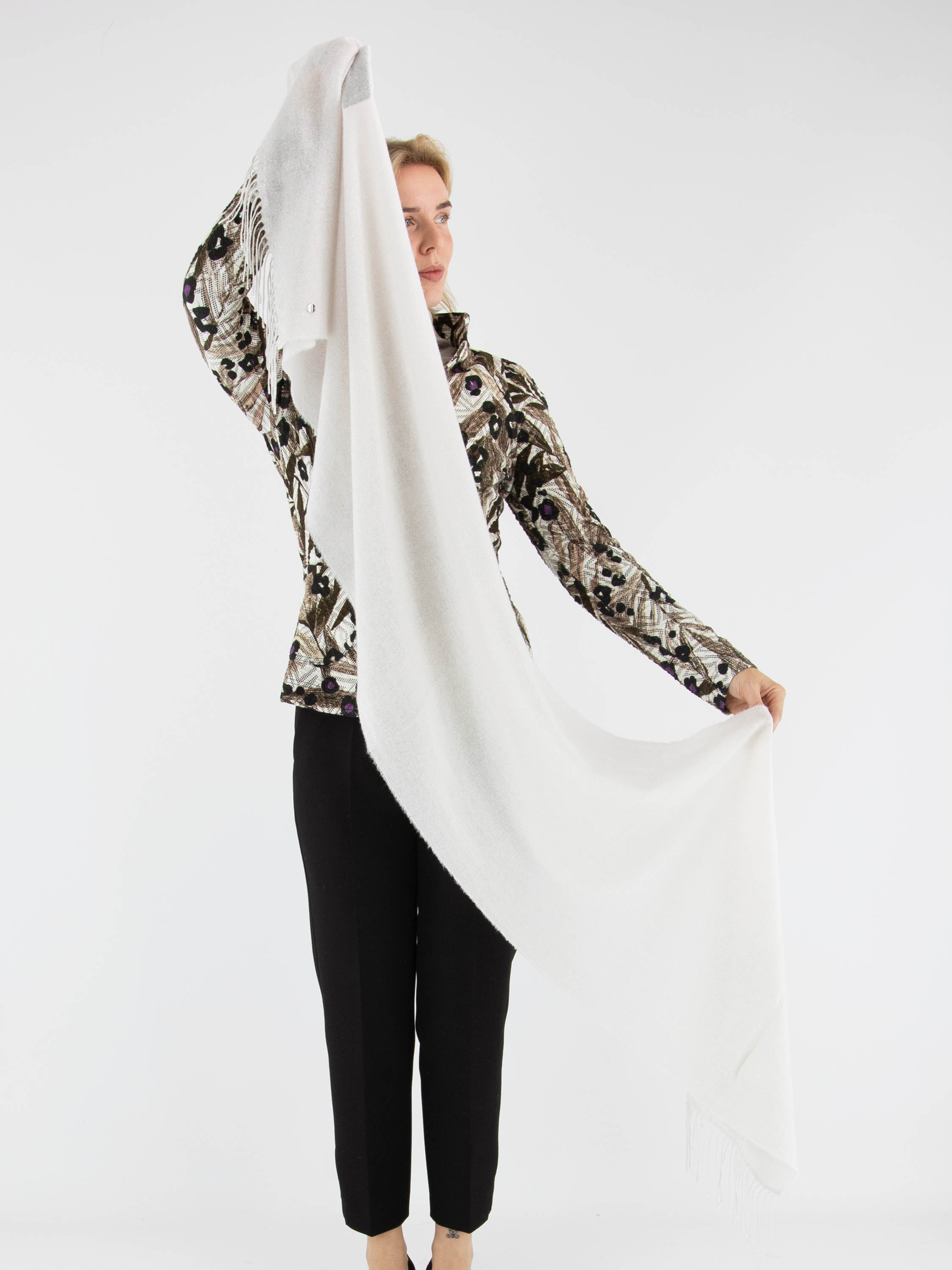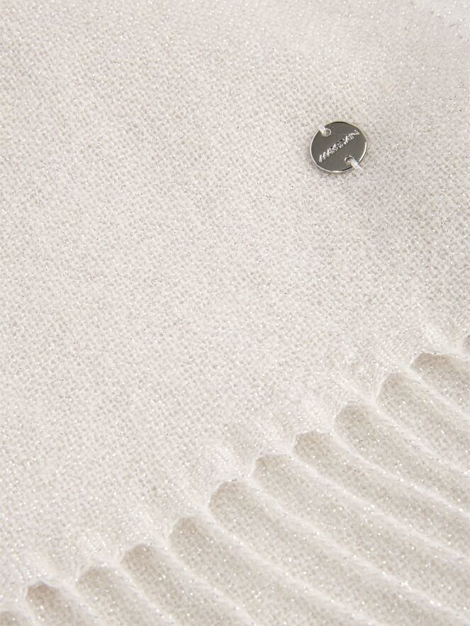 Luxury Marc Cain shawl in off-white, with a subtle silver thread woven through the fabric. The ends of the shawl are finished with long fringes. This shawl should be hand washed.