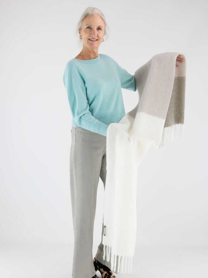 Luxury shawl by Marc Cain featuring refined color blocks that gently blend from off-white to grey. Long fringes at the ends add a stylish and contemporary touch to this exclusive women’s accessory. To preserve its premium quality, this designer shawl should be hand-washed.