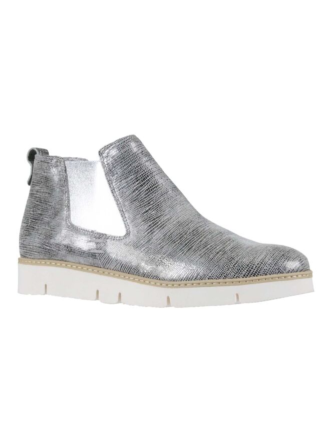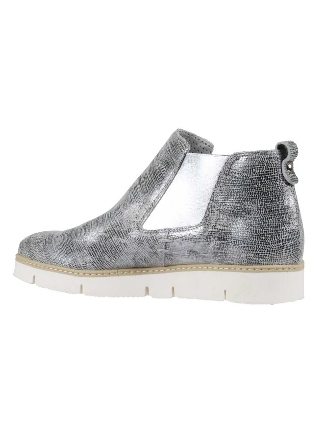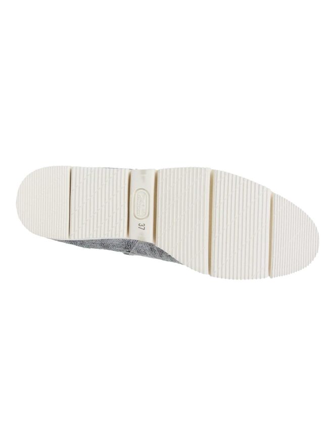 A high lace up shoe of the brand Maripé in a print with silver and grey. Along the sole runs a topstitched seam in a sand color and on both sides is an elastic piece used in a silver color. The slip-on is unlined.