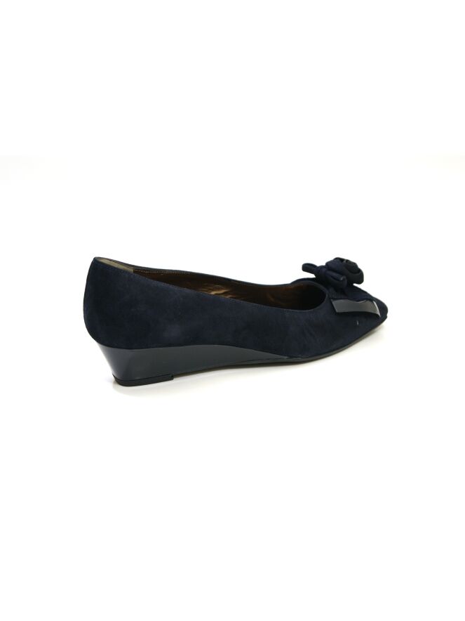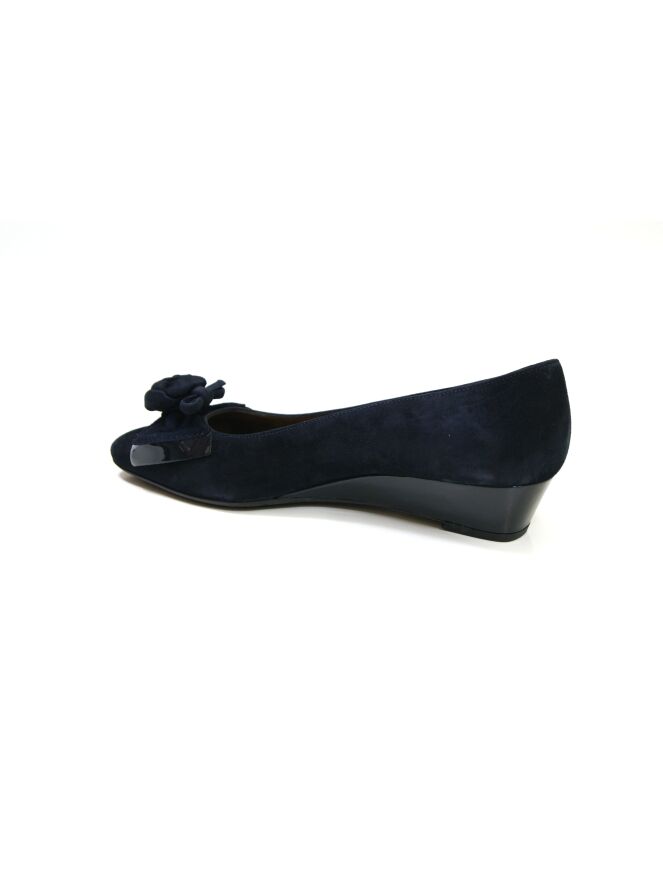 A Mauro teci pump on a wedge heel in the color navy blue. On the forefoot is a decorative rose with a varnish covering underneath. The inside is lined with leather.