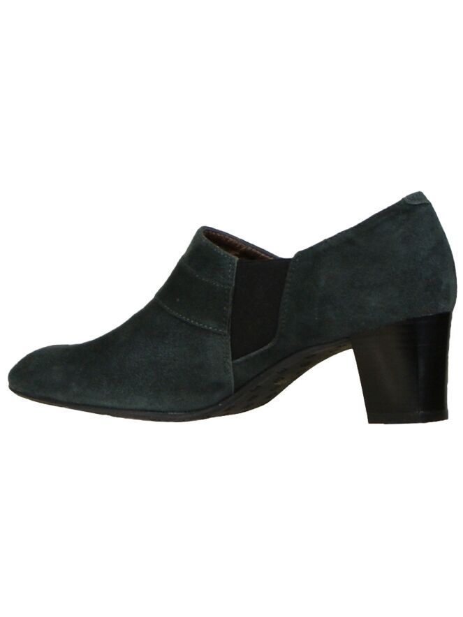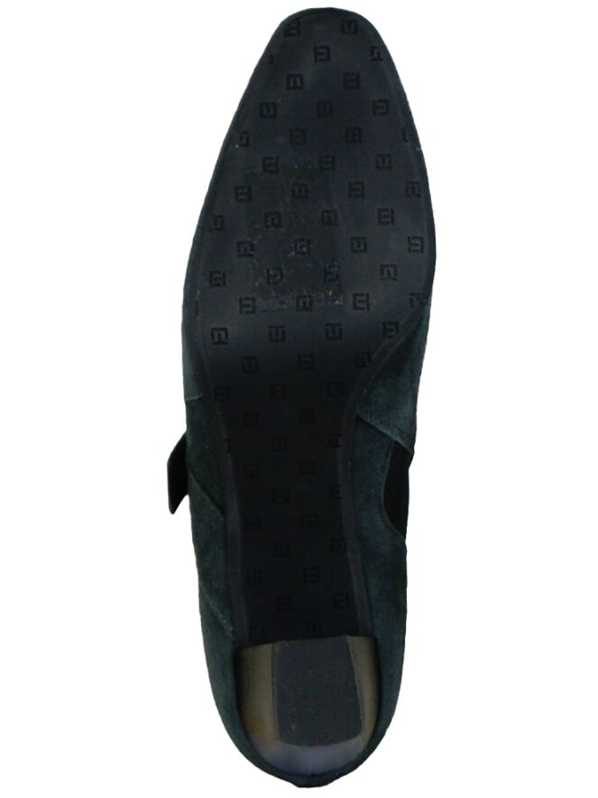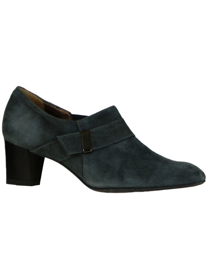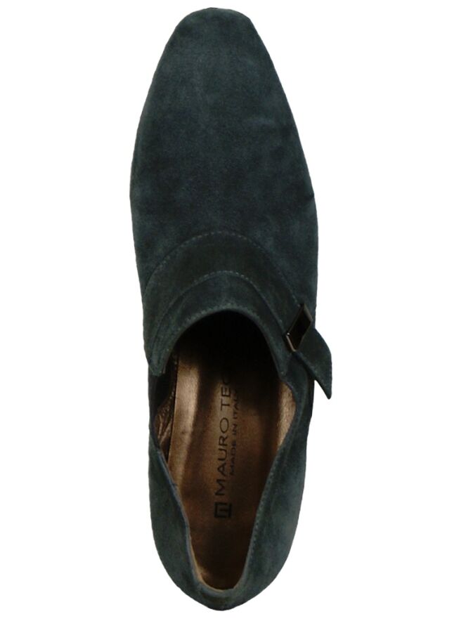 A flat of the brand Mauro Teci in a dark grey color. The flat has a rounded toe and has on the outside a silver-colored buckle which is attached to a band which goes over the front foot. On the inside is incorporated an elastic band. The elegant heel is 4 cm high and the inside of the slip is lined with leather.
