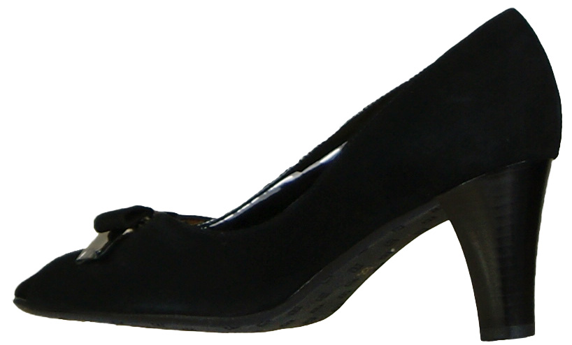 A pump of the brand Mauro Teci in a black color. The pump has a round toe in patent leather and has a bow on the forefoot in suede with patent leather. Along the edges on both sides is a narrow band in patent leather. The elegant heel is 6 cm. The inside of the pump is lined with leather.