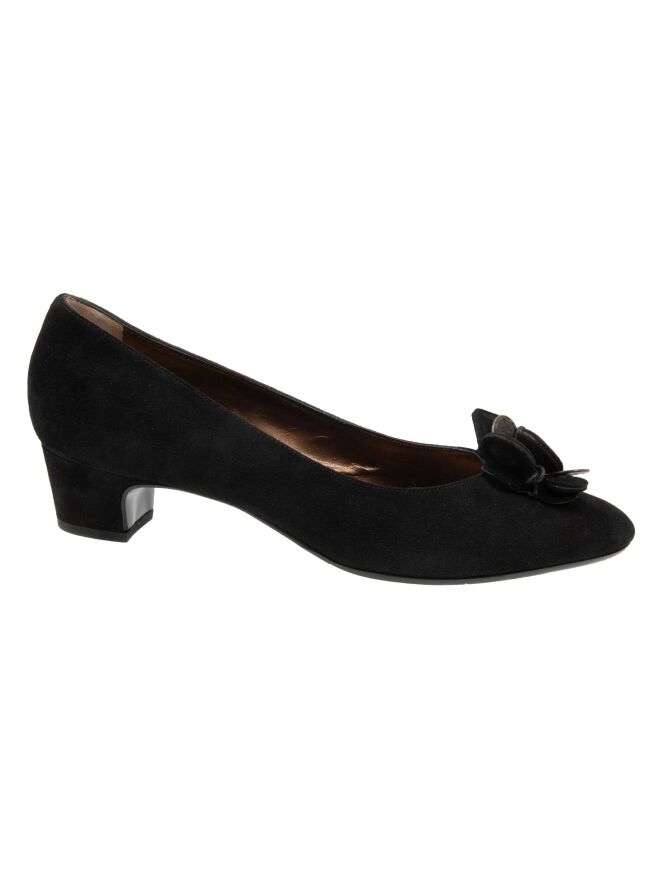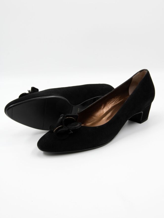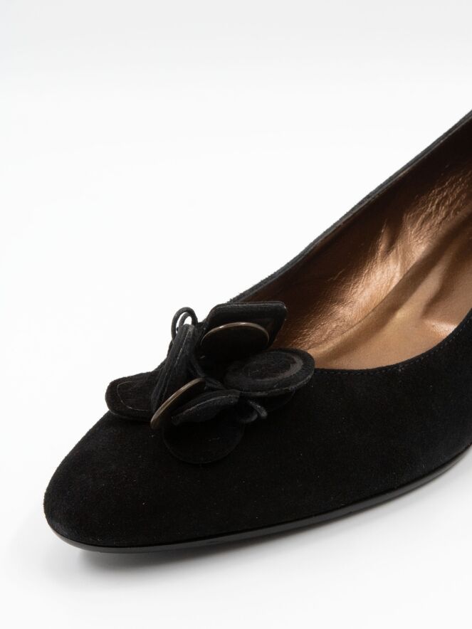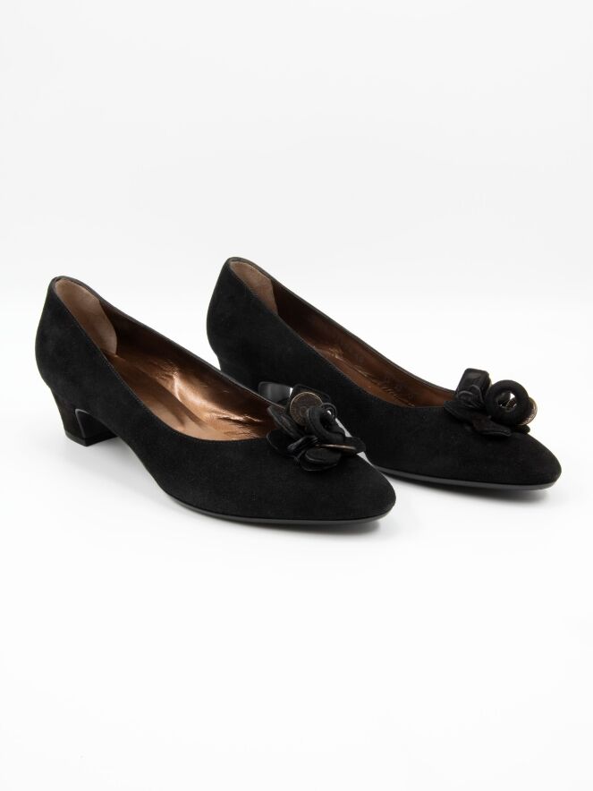 A Mauro Teci pump in black. The pump features a slim toe and a decorative flower on the forefoot made of copper-colored coins and leather pieces. The heel is covered in suede. The interior is lined with leather.