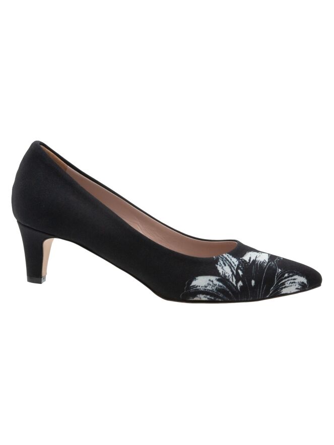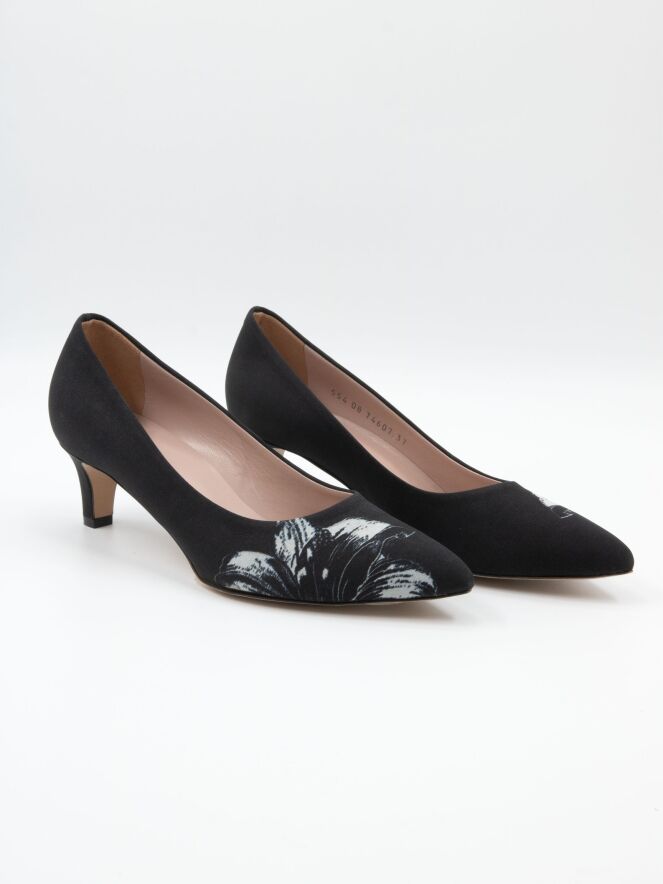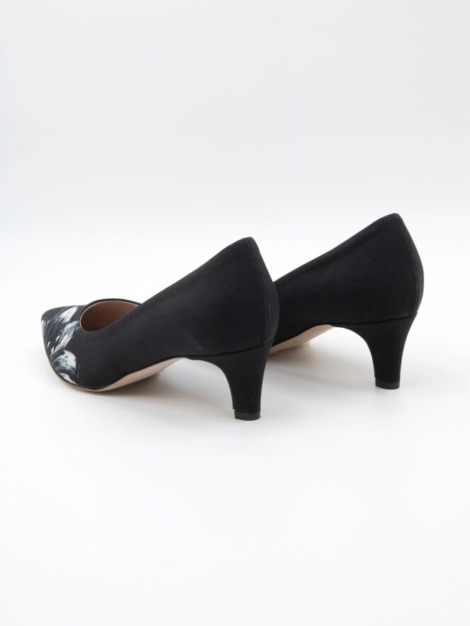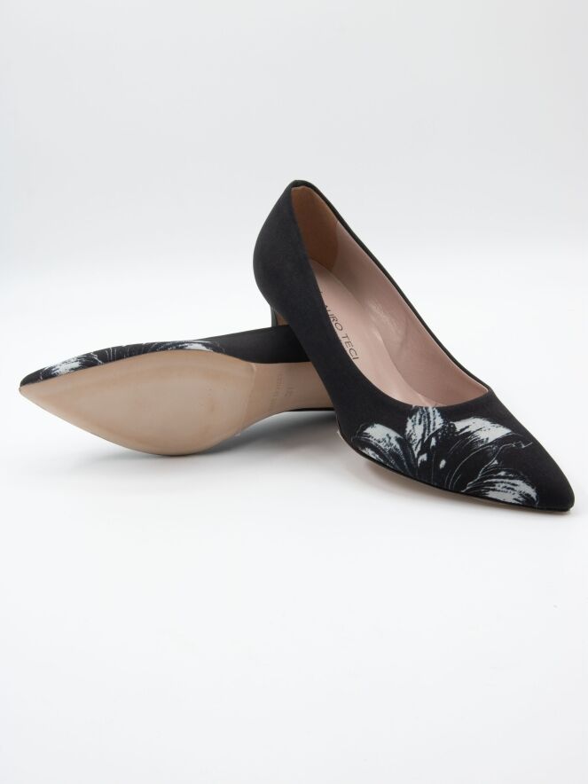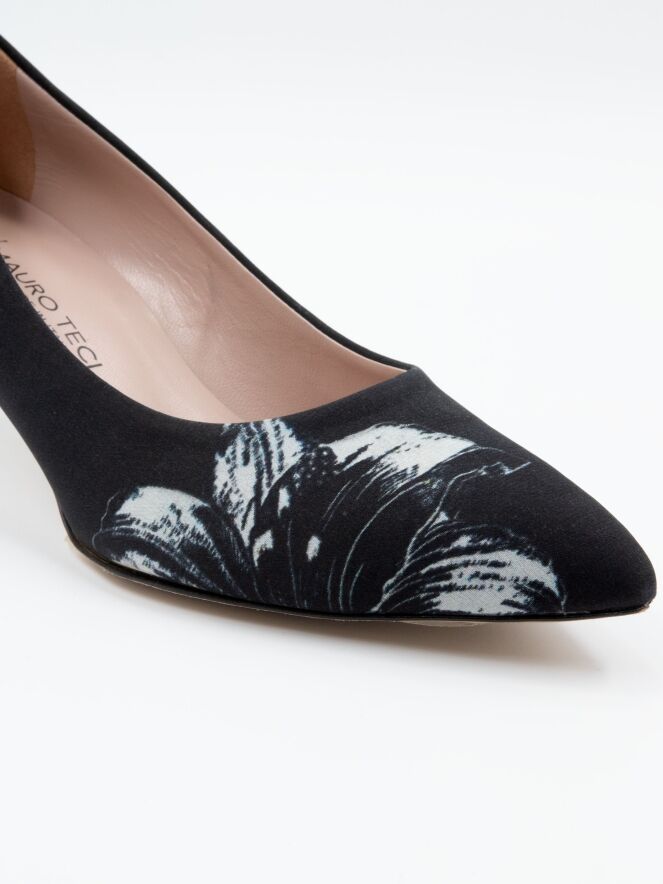 A pump of the brand Mauro Teci in a print with multiple black tones. The pump has a slightly pointed toe. The inside of the pump is lined with leather.