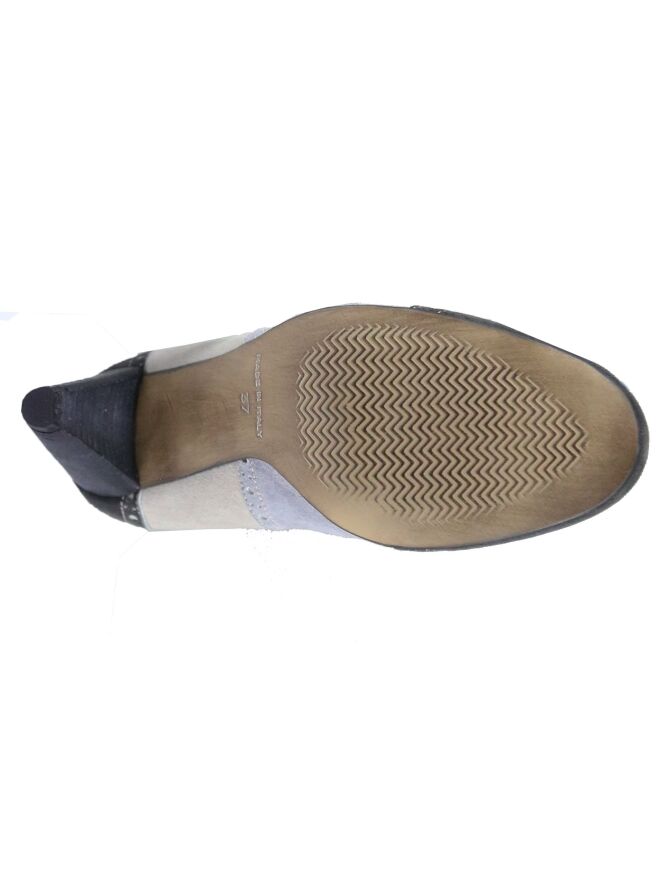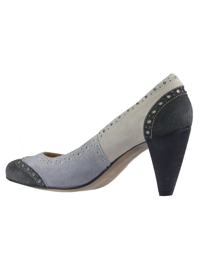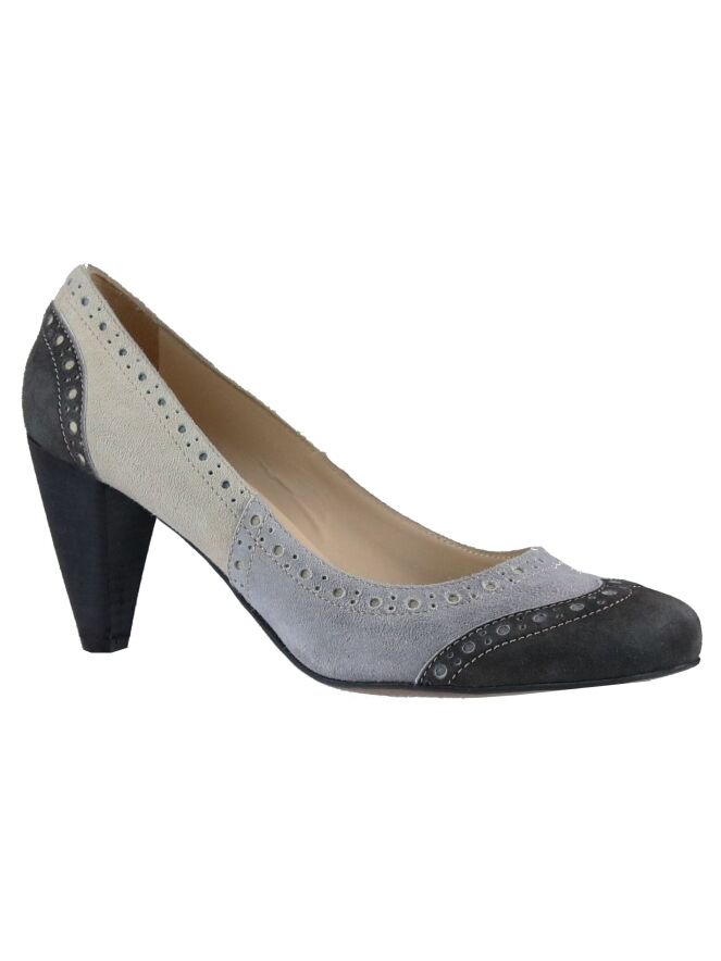A Mauro Teci pump with a round toe in the colors beige, light gray and dark gray. The pump has brooks details on the toe and around the edges. The pump is lined with leather on the inside.