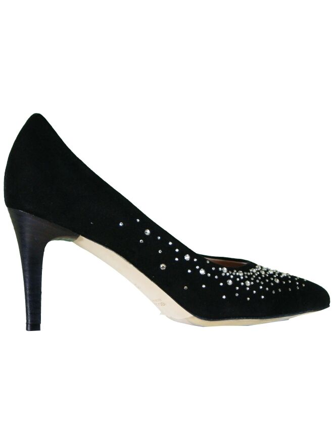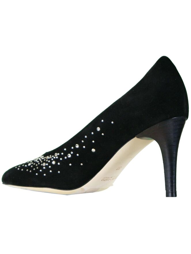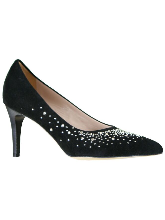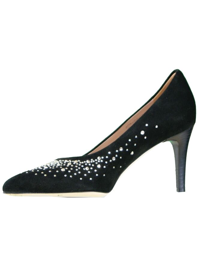 A pump of the brand Mauro Teci in the color black. The pump is lined with Rhinestones. The inside of the pump is lined with leather.