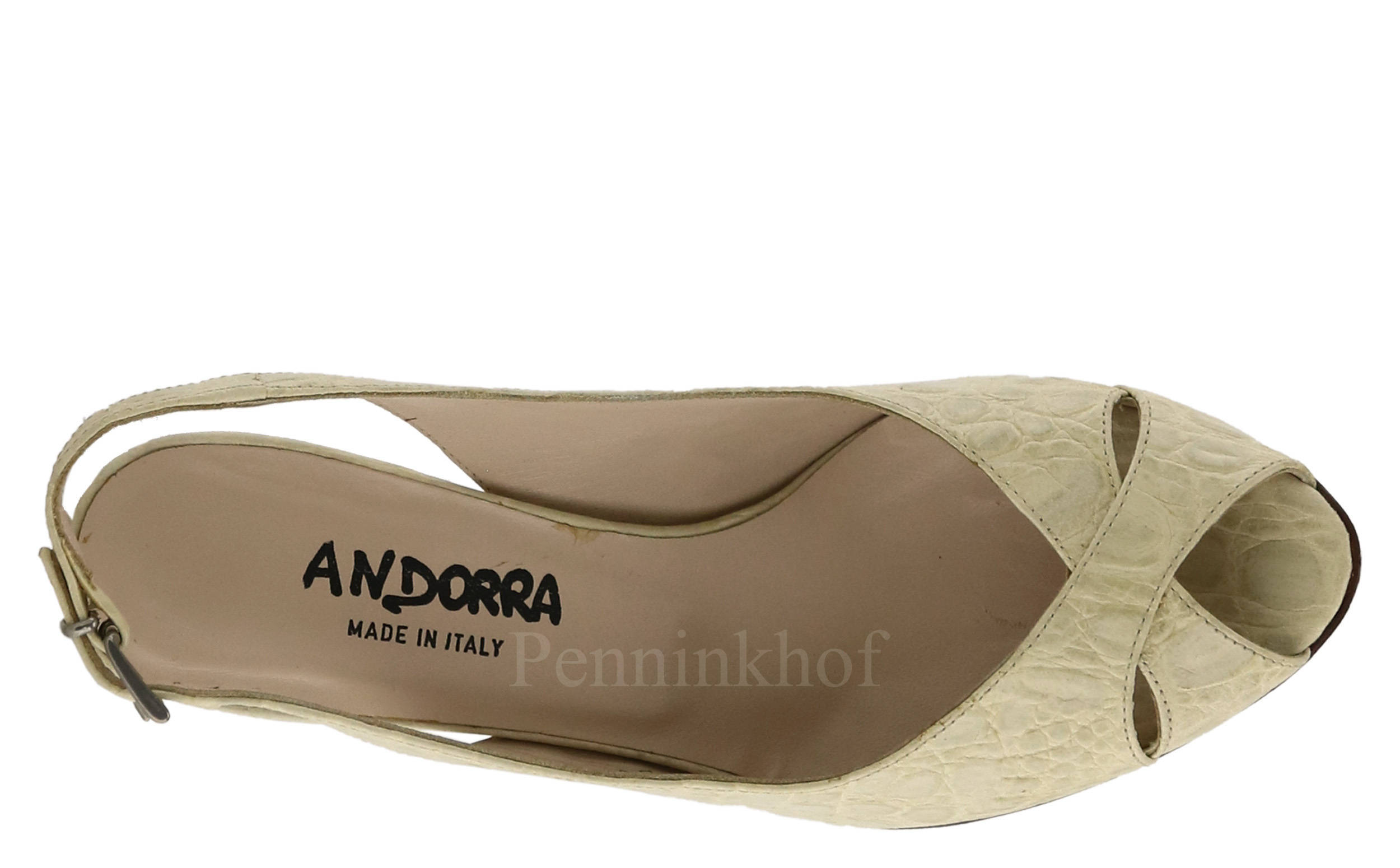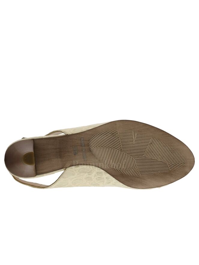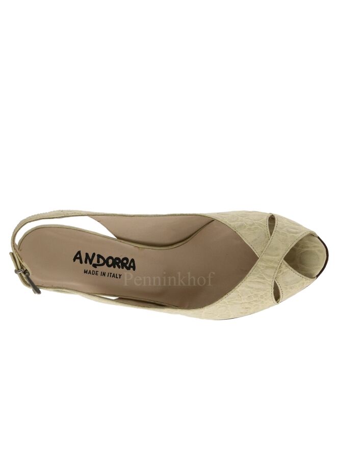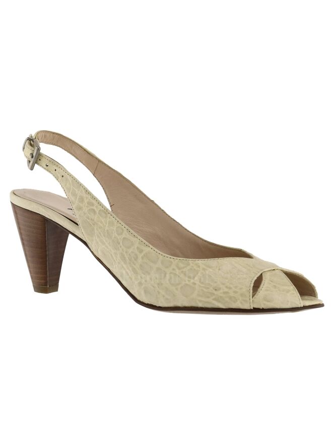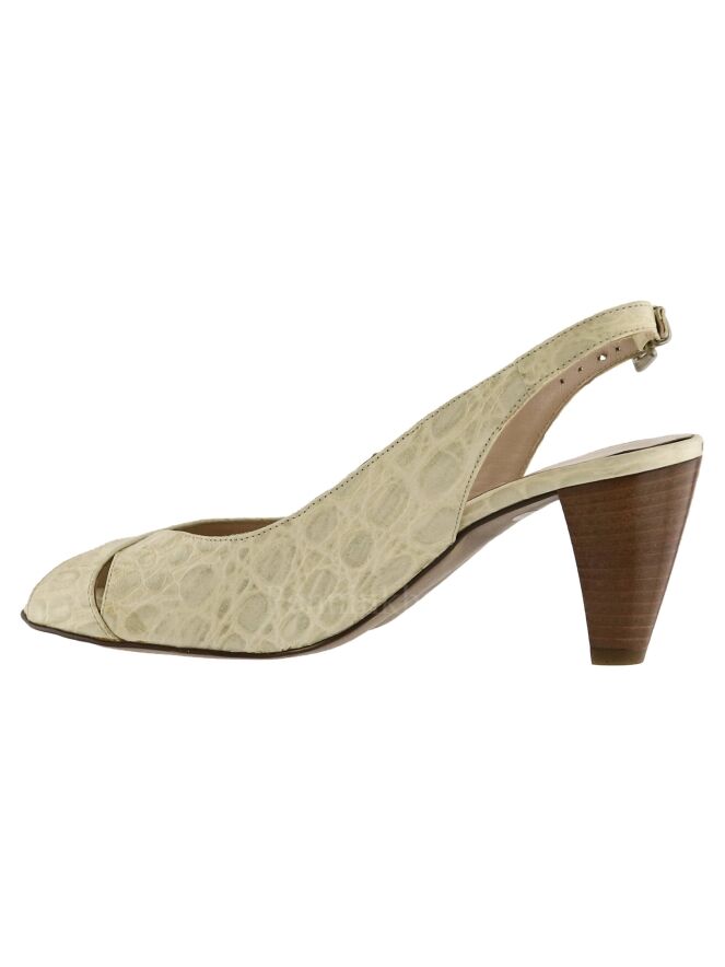 An open pump from Mauro Teci in the color cream white. The pump is in a croco leather and has an open toe. The heel strap is adjustable. The inside is lined with leather.
