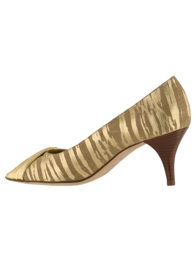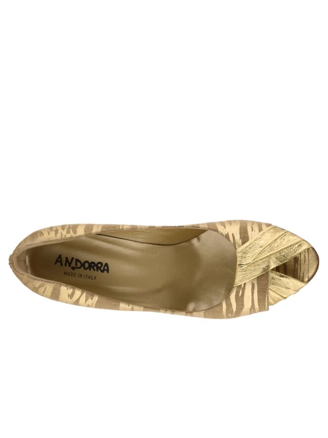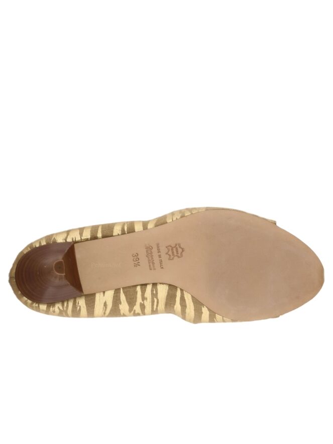 An open toe pump from Mauro Teci in a print with the colors taupe and gold. The heel is in a neutral wooden color and the inside is lined with leather.