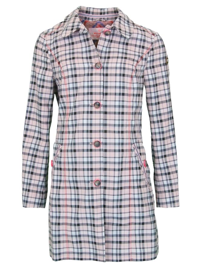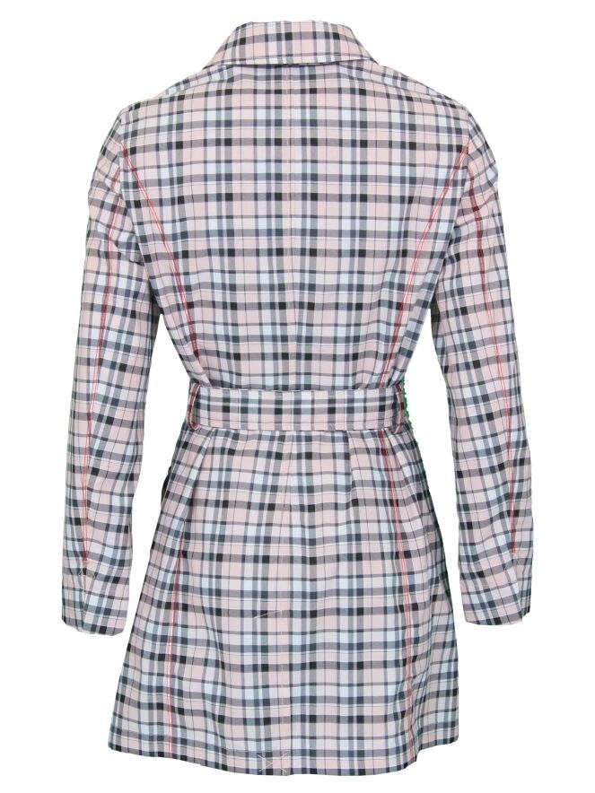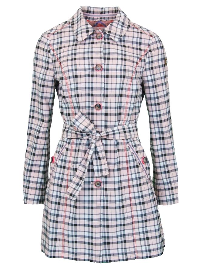 A short trench coat by Milestone in a Burberry print with the colors gray, creamy white and pastel pink. The edges of the buttons are in a pink color. The coat has pockets and is unlined. This coat can be washed at 30 degrees.