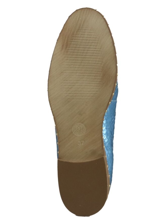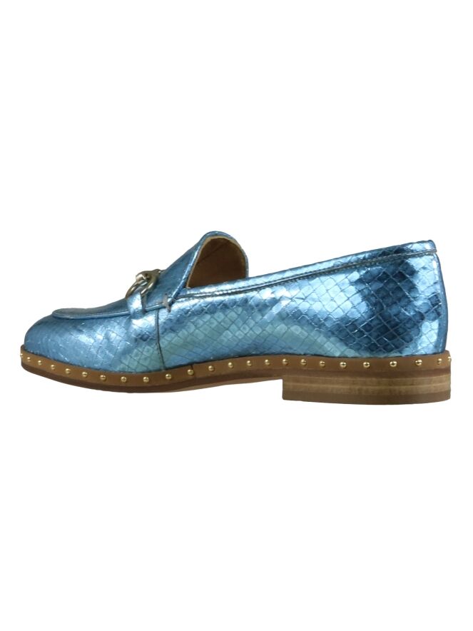 A Mitica slip-on in a croco print in the color ice blue. About the forefoot is a narrow silver bit. On the edge of the sole are small metal studs. The inside is lined with leather.