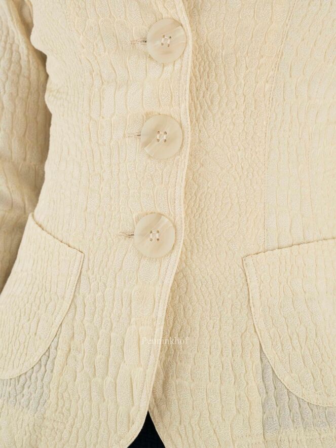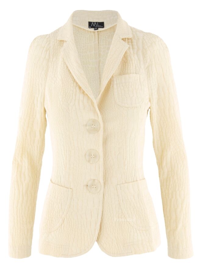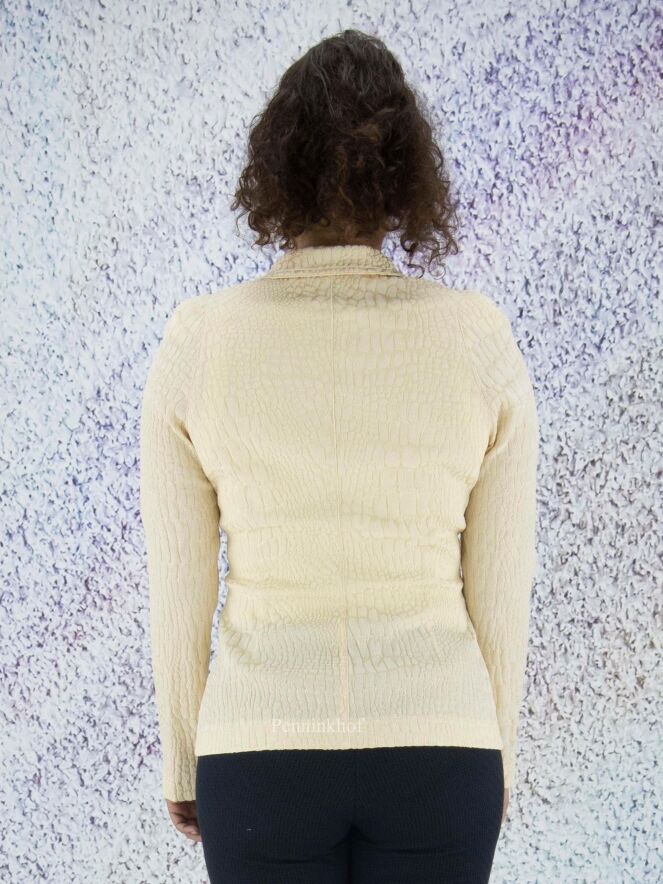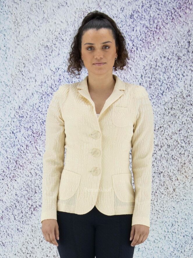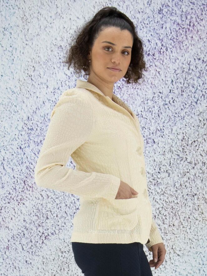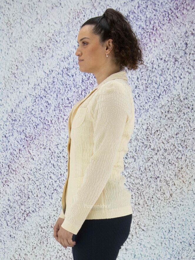 A blazer from ML Collections in a soft yellow color. The fabric is in a reptile structure. The blazer has a 3 button closure and is unlined. This blazer should not be washed.