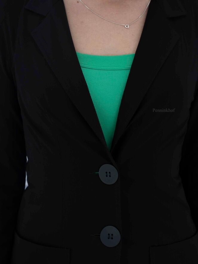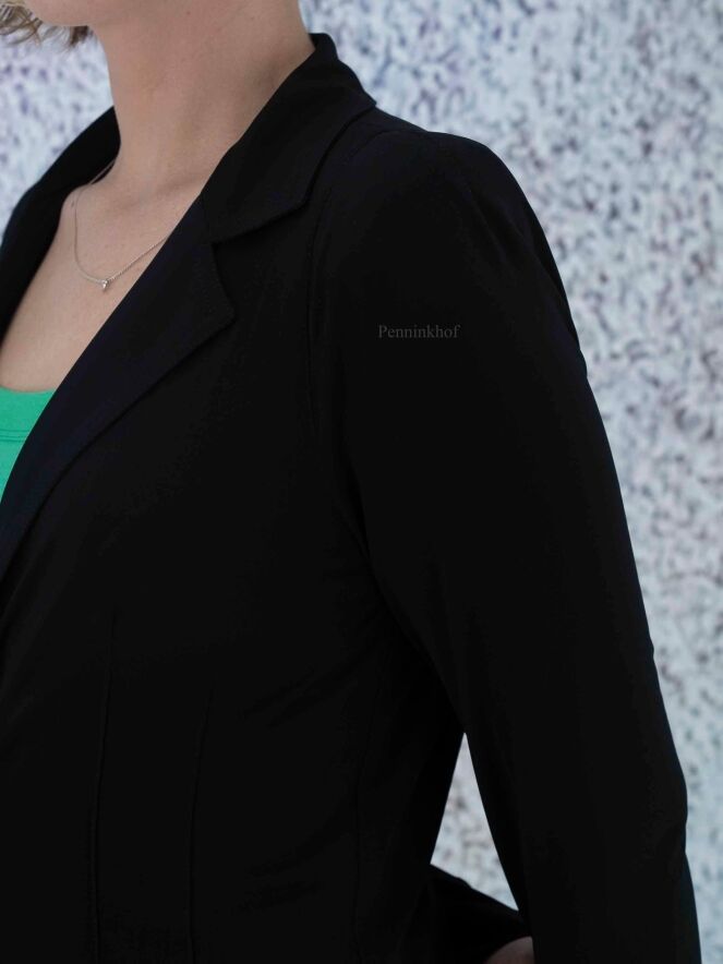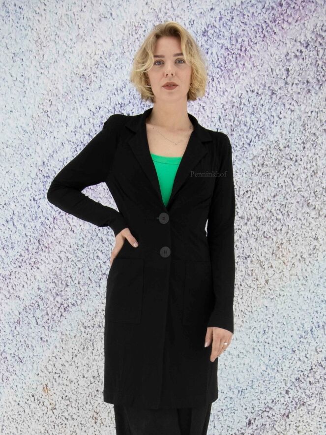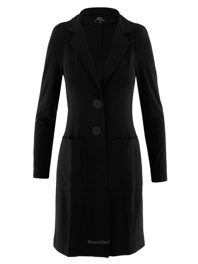 A long blazer from ML Collections in the color black. The blazer has a 2 button closure and is unlined. This blazer should not be washed.