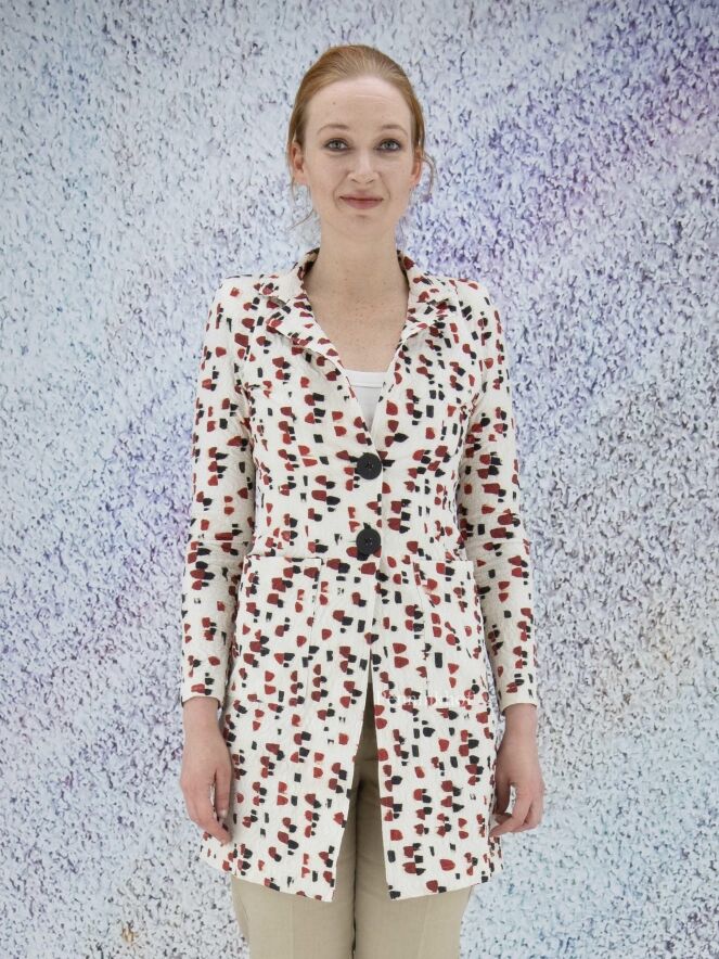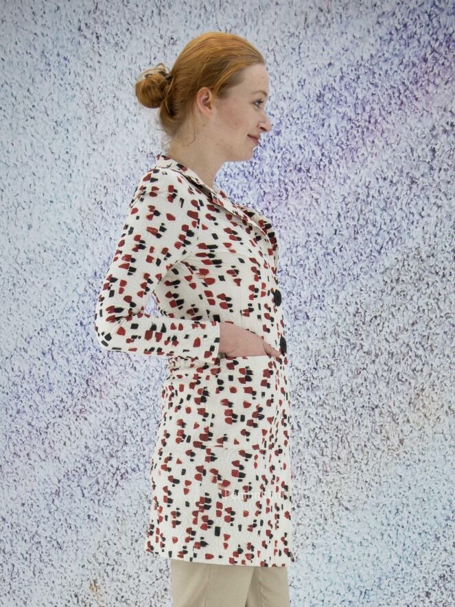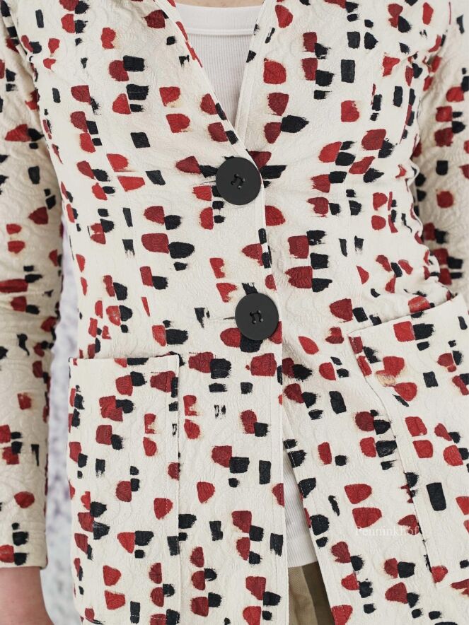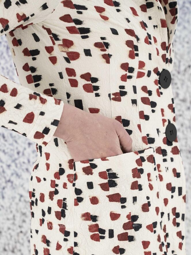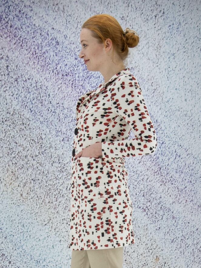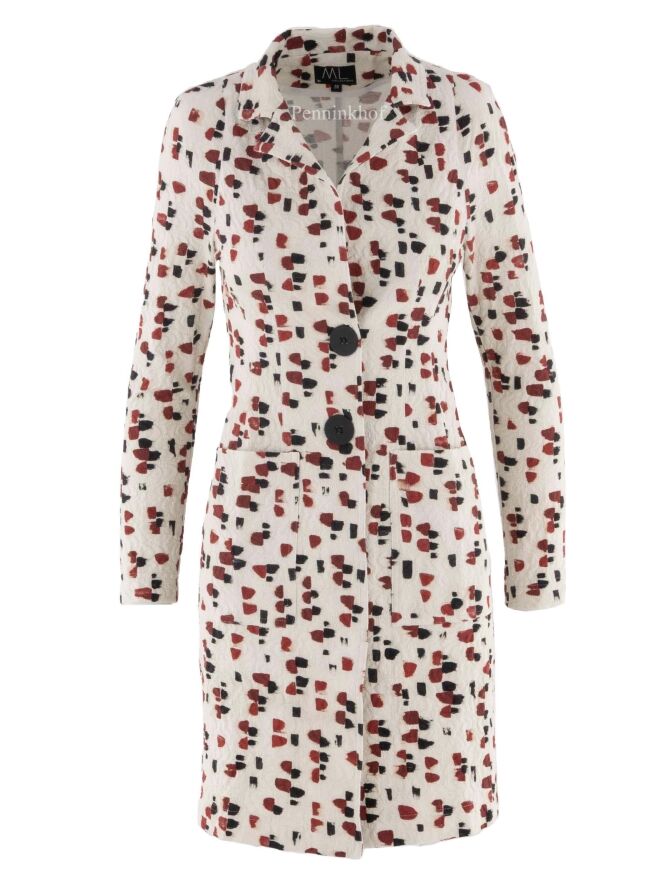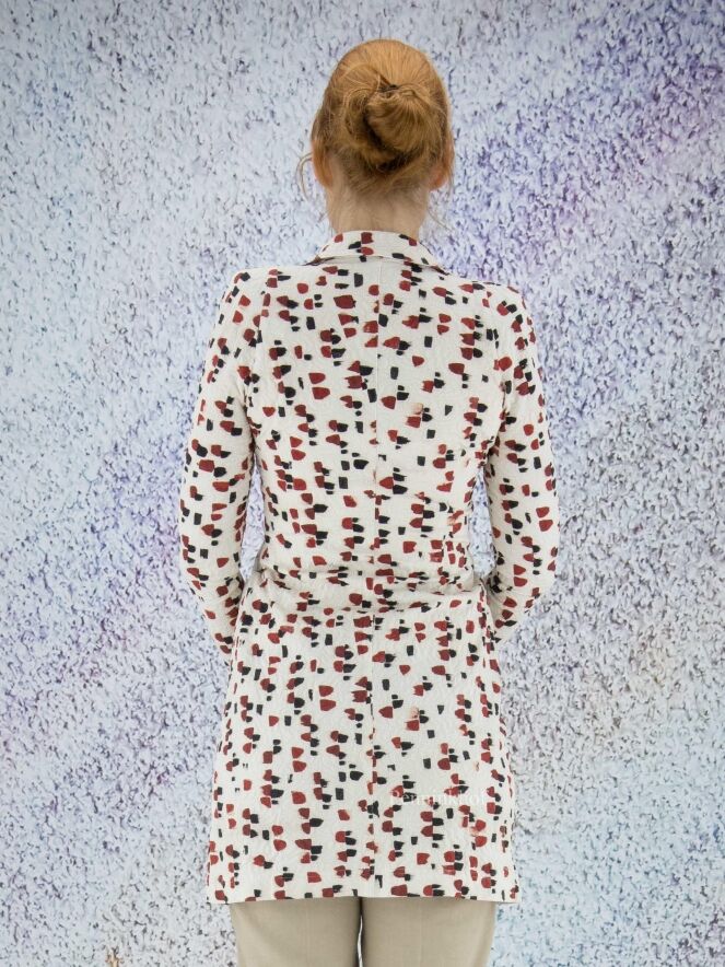 A long blazer from ML Collections in a mottled print with the colors rust and black on a creamy white background. The blazer has a 2 button closure and is unlined. this blazer should not be washed.