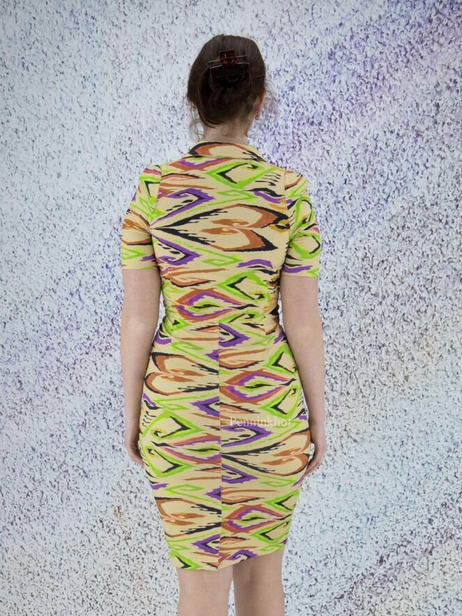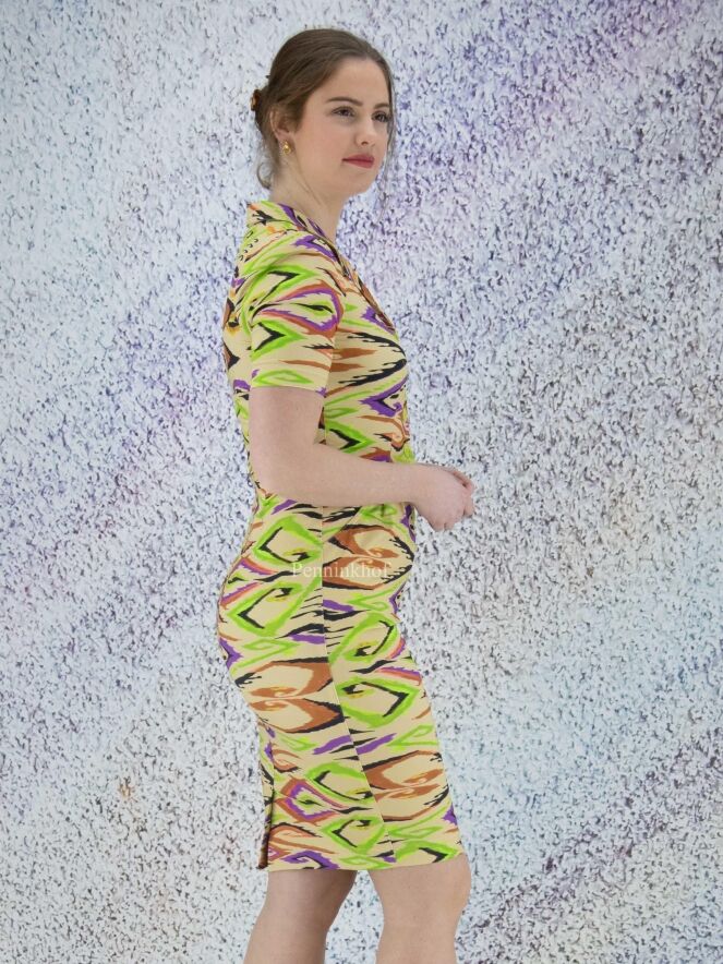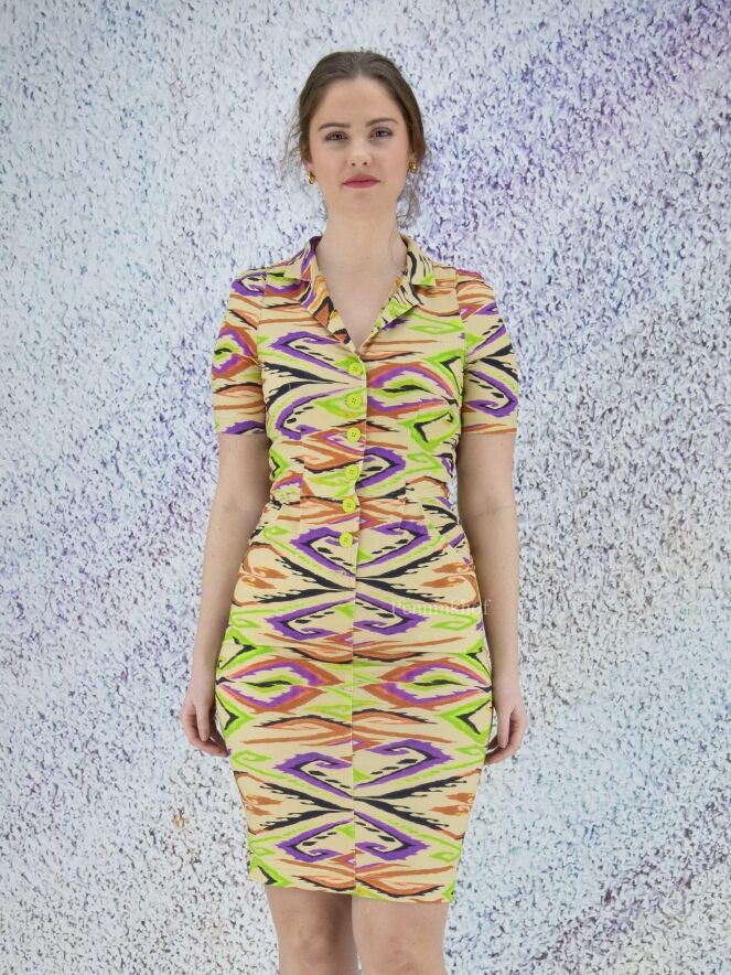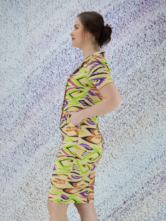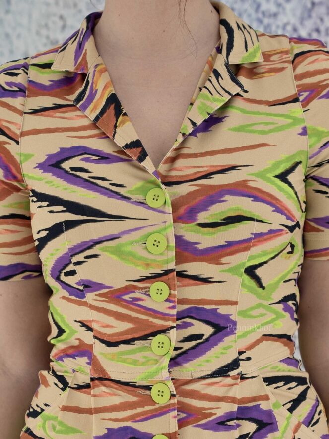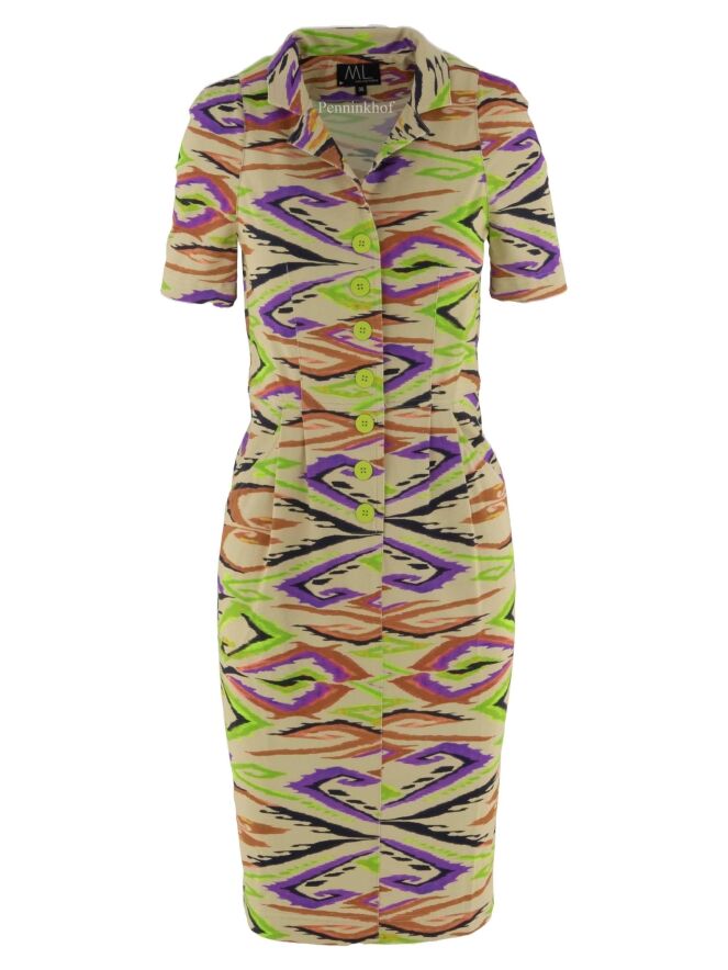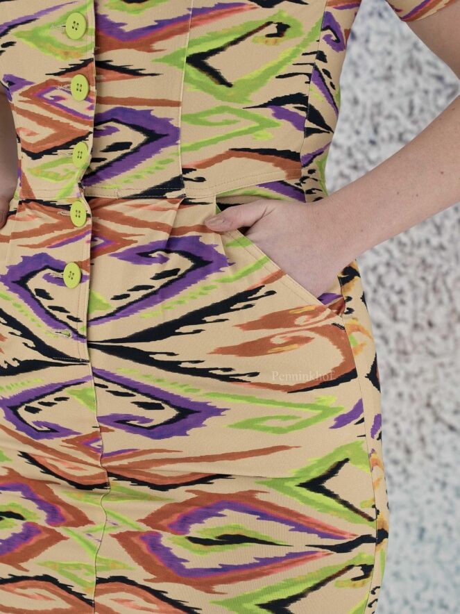 A dress by ML Collections in a flamed graphic print with multiple shades of green, black, purple and rust on a beige background. There are side pockets at the waist. This dress has short sleeves and should not be washed.