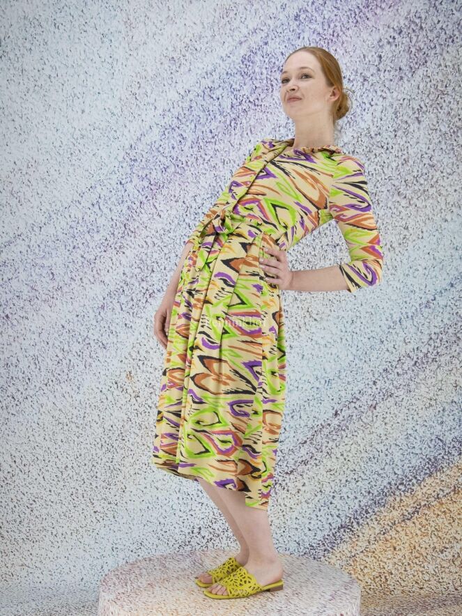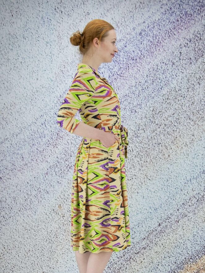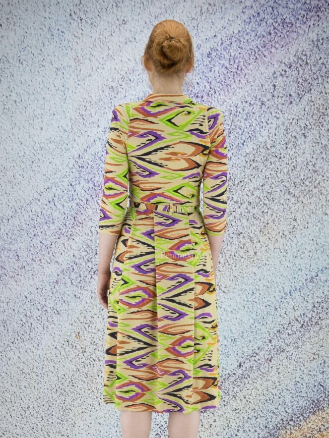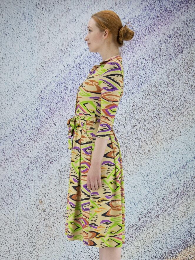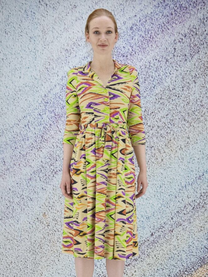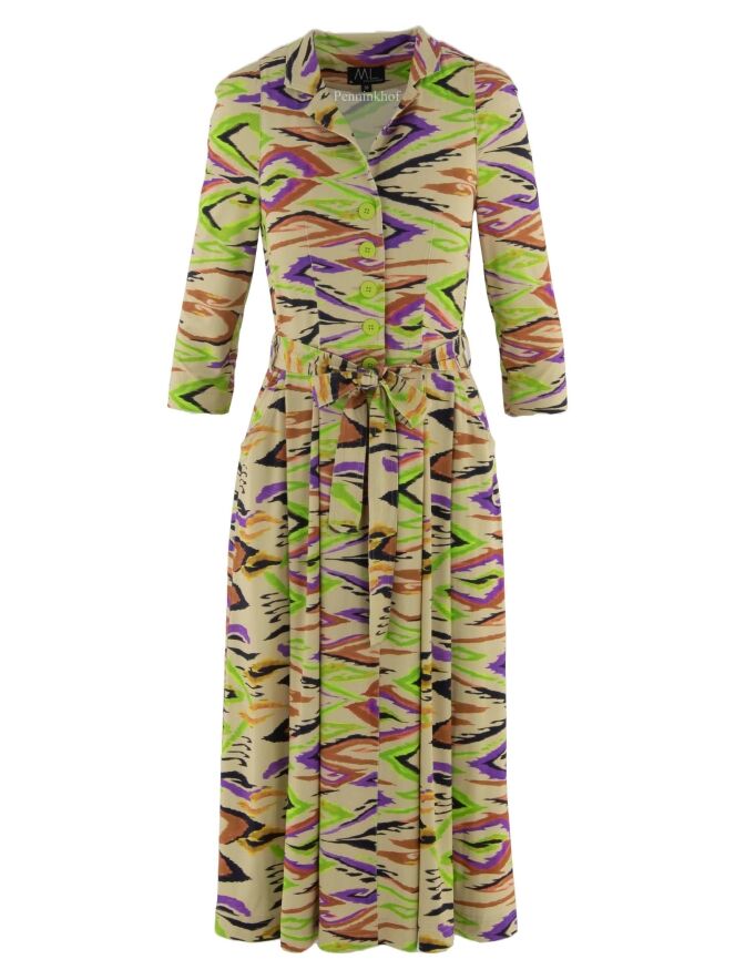 A button through dress from ML Collections in a flamed graphic print with multiple shades of green, black, purple and rust on a beige background. From the waist, the dress has a slight A - Line. There are side pockets at the waist. This dress should not be washed.