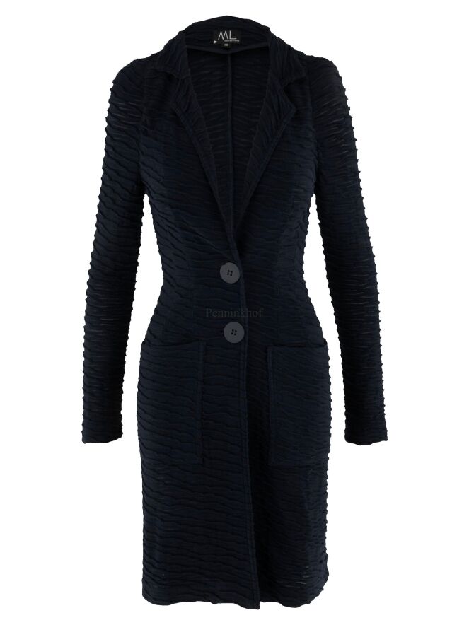 A long blazer from ML Collections in a wavy stripes embossed structure that is slightly transparent in a black colour. The blazer has a 2-button fastening and is unlined. This blazer should not be washed.