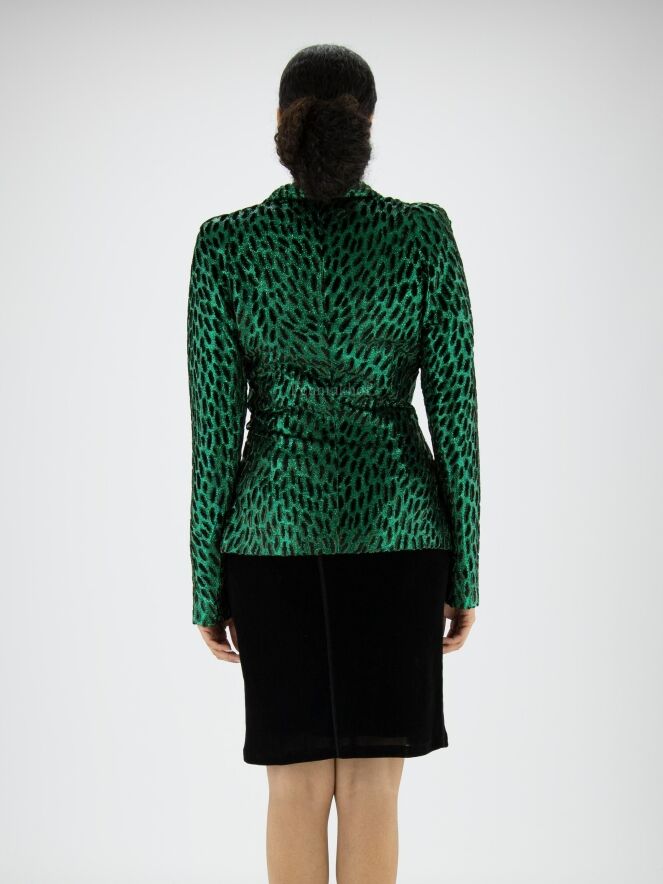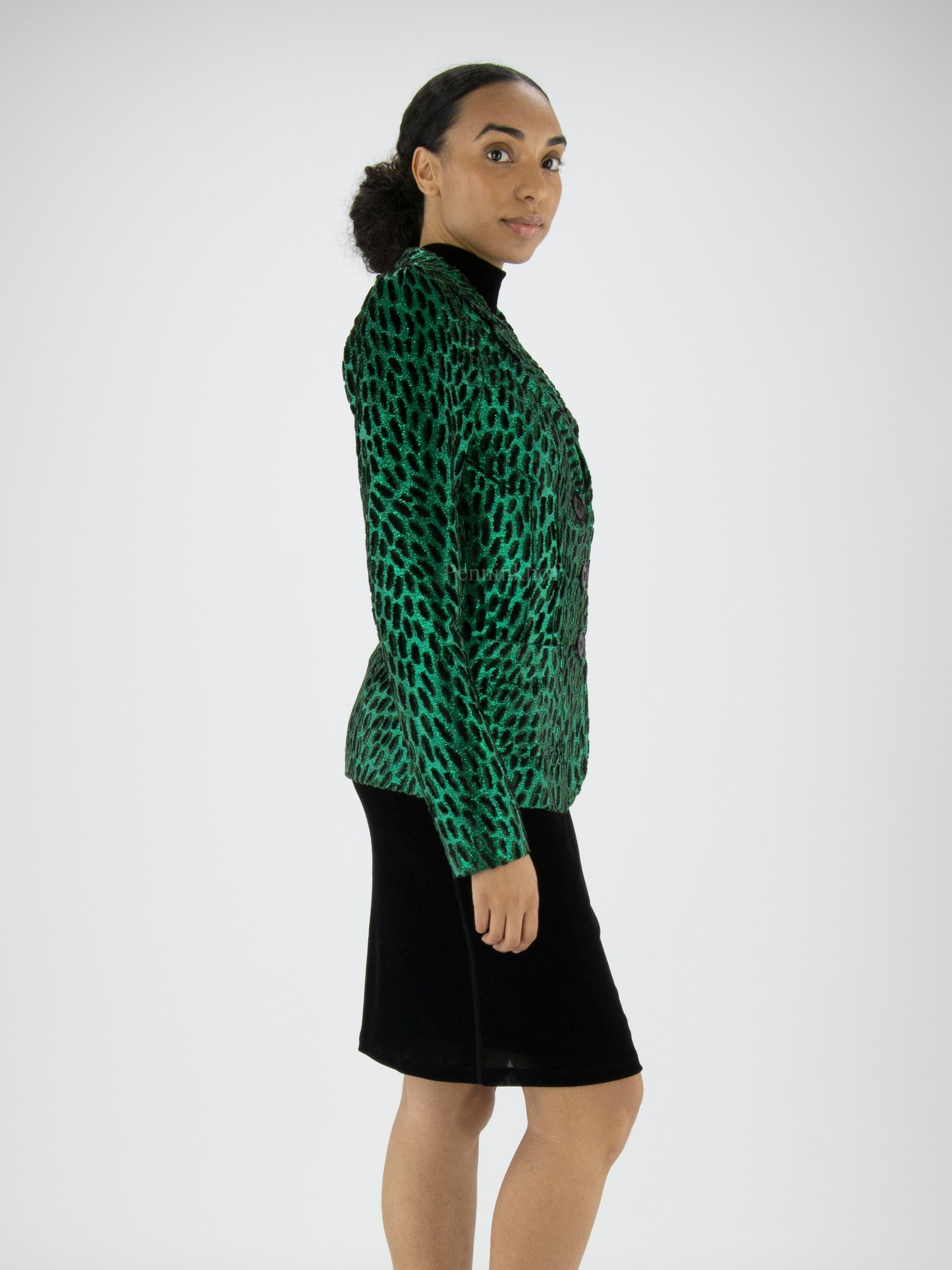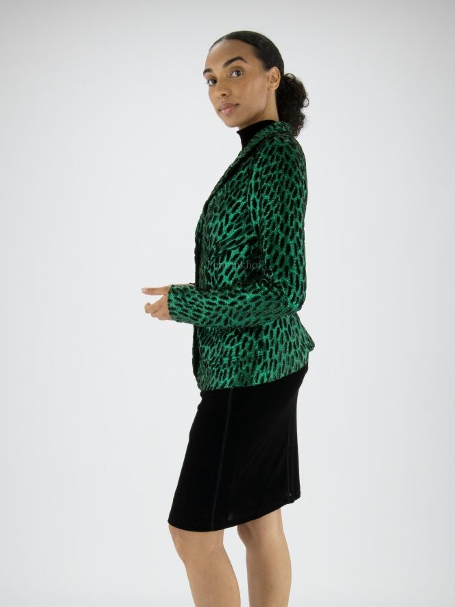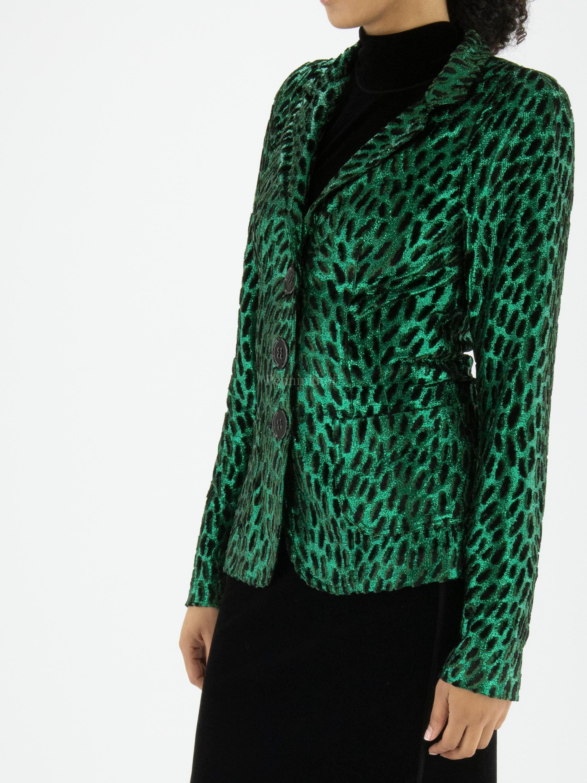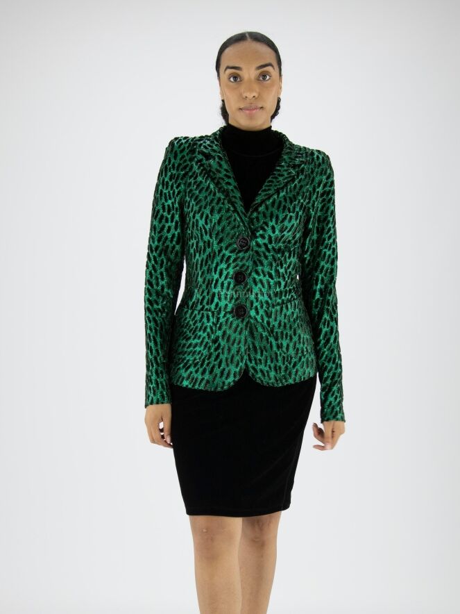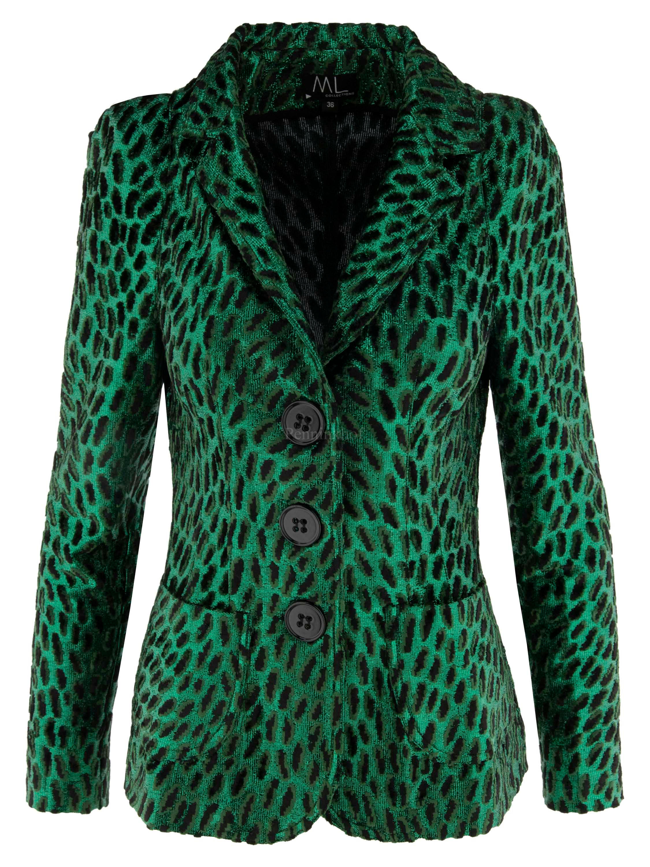 A blazer from ML Collections in a leopard print with metallic green and black and green velour. The blazer has a 3-button fastening and is unlined. This blazer should not be washed.