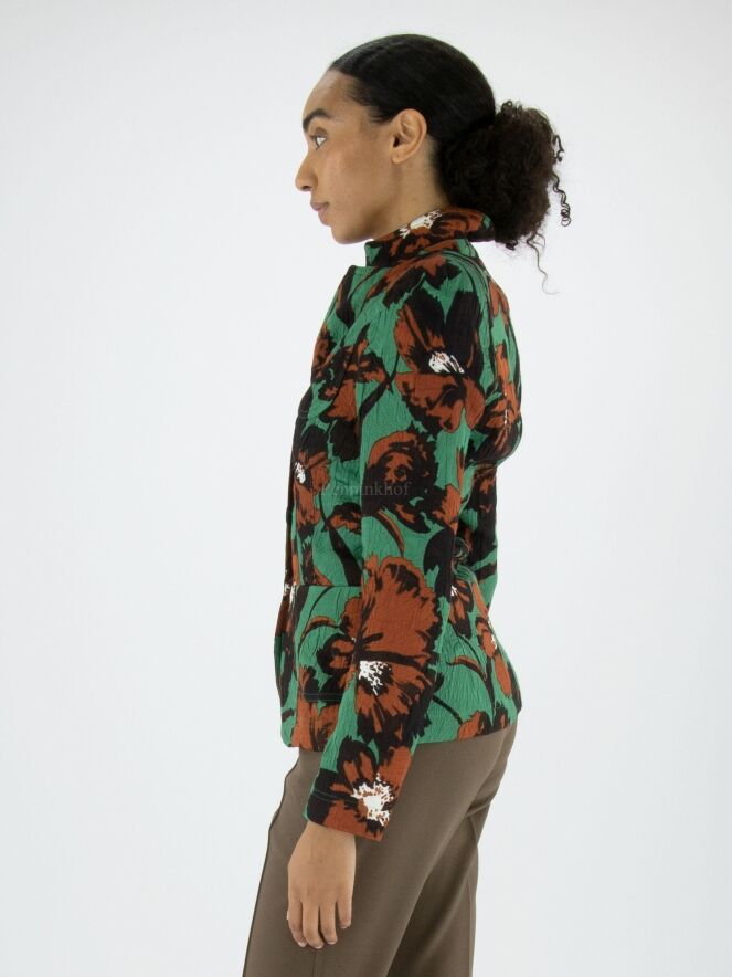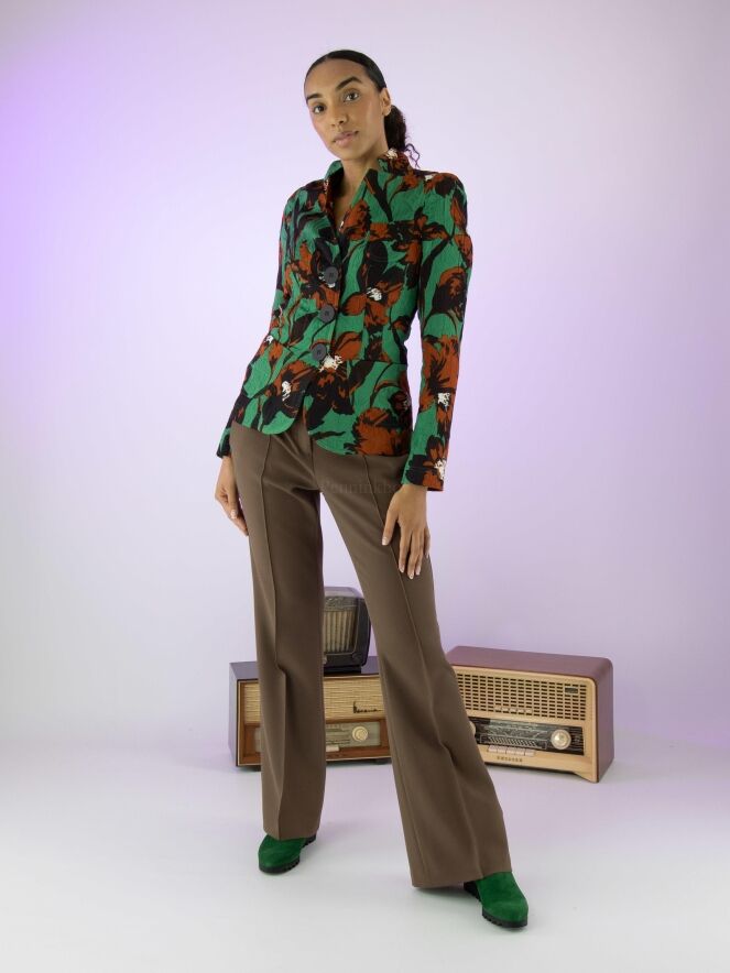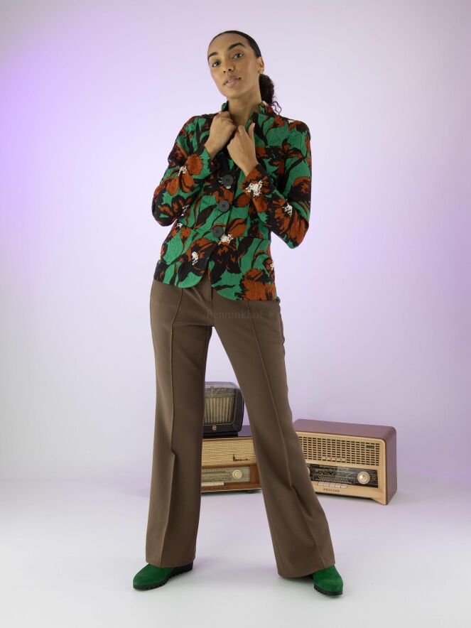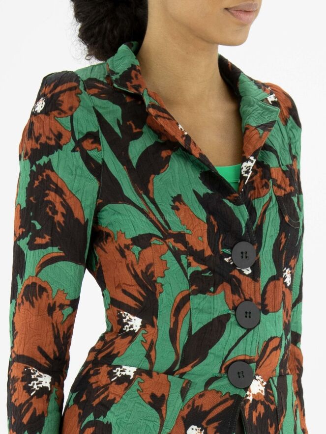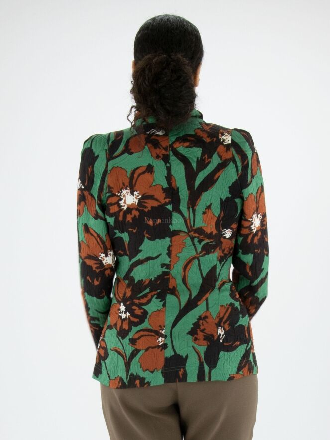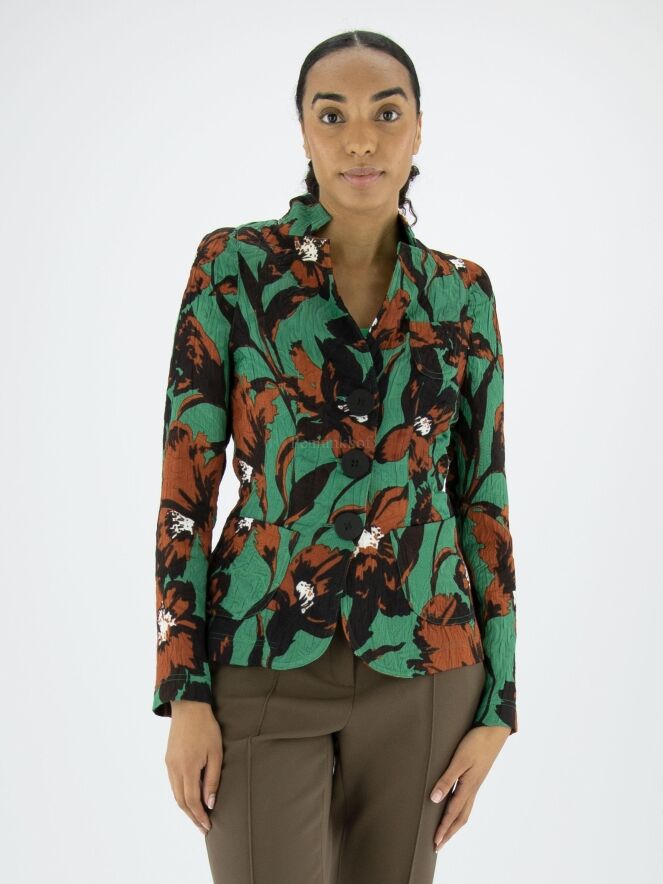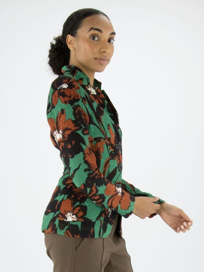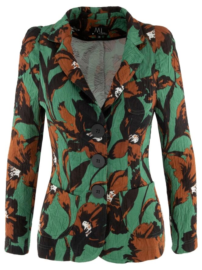 A blazer from ML Collections in a graphic leaf print featuring the colours green, cognac and black. The blazer has a 3-button fastening and is unlined. this blazer should not be washed.