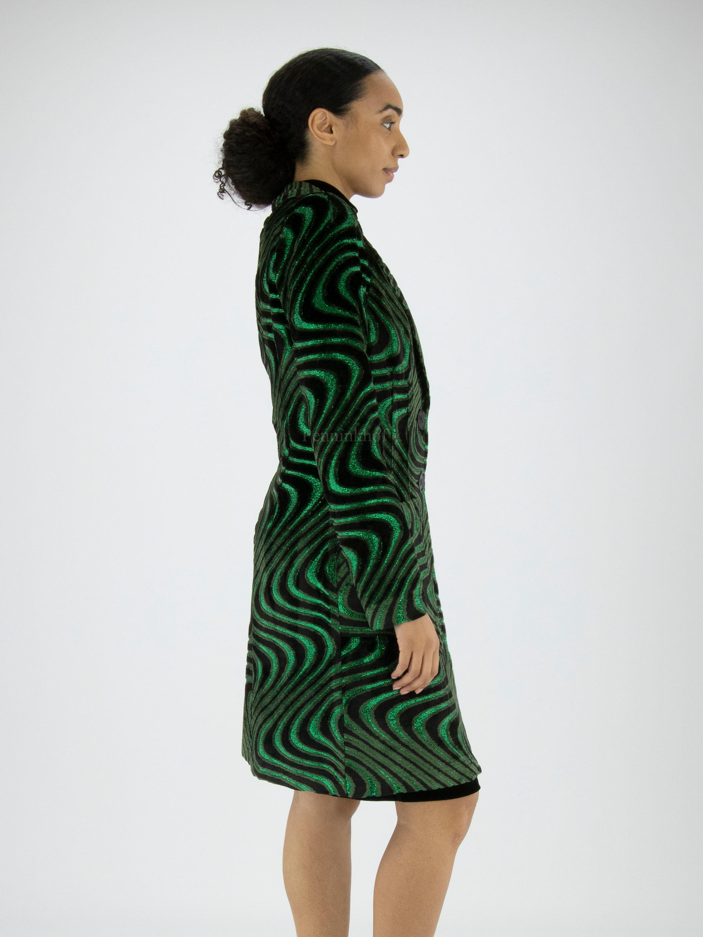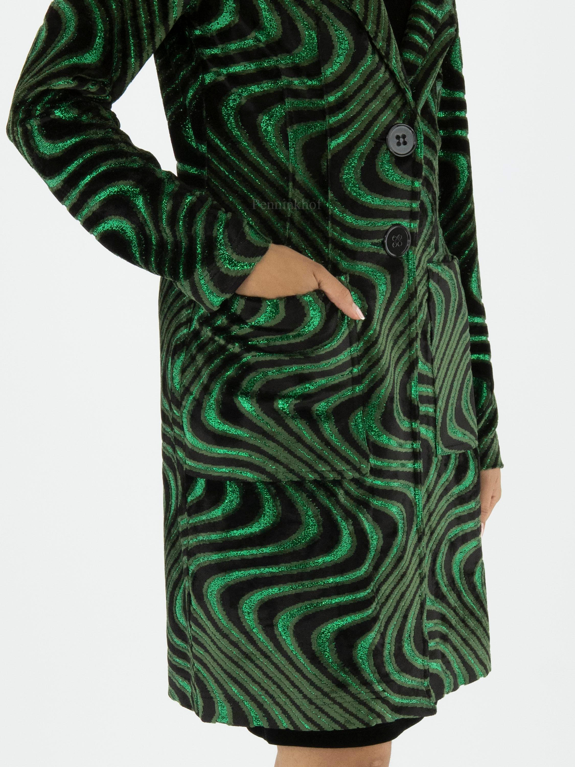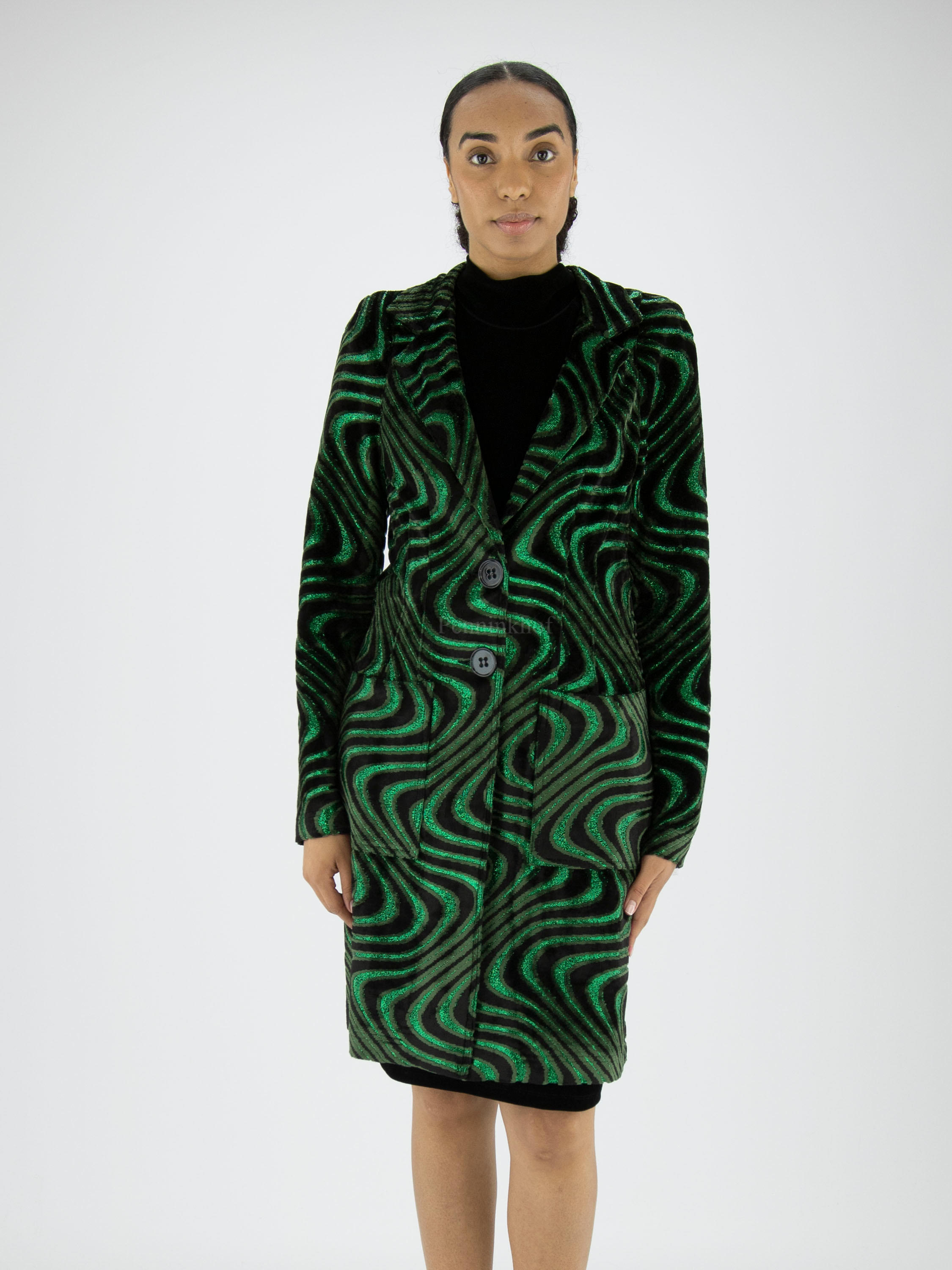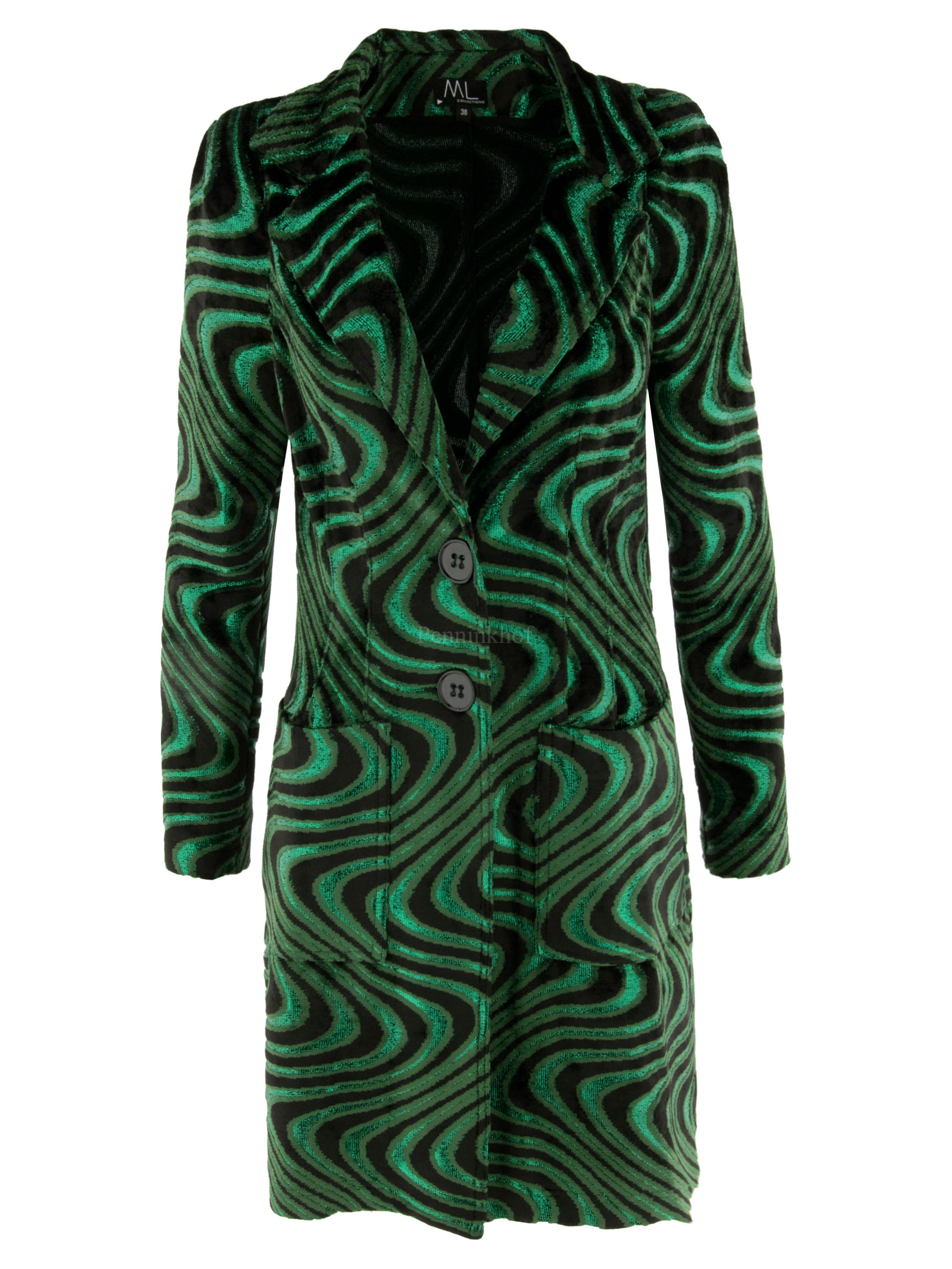 A long blazer from ML Collections in a wavy print featuring metallic green, black and green velour. The blazer has a 2-button fastening and is unlined. This blazer should not be washed.