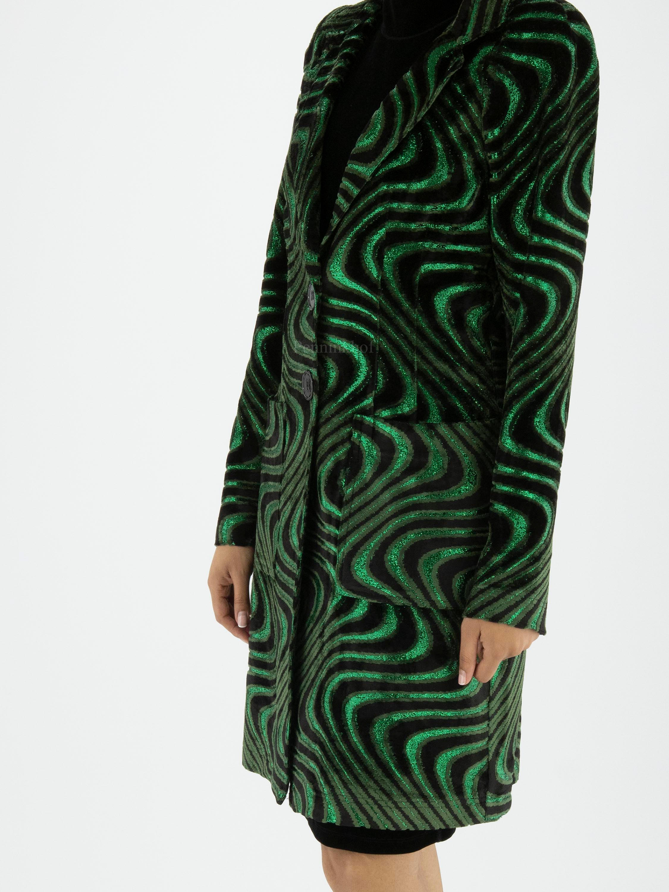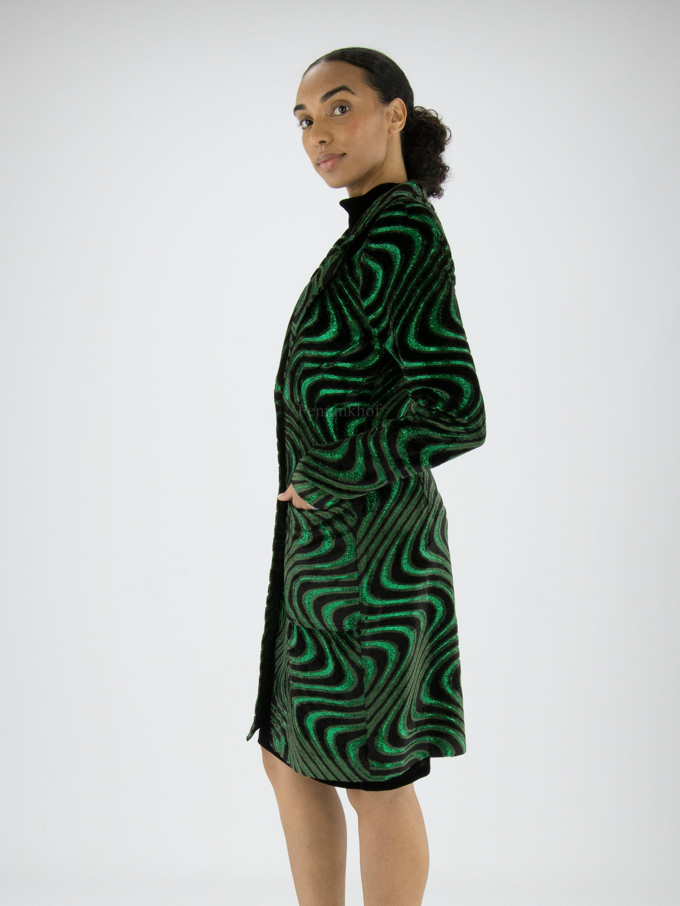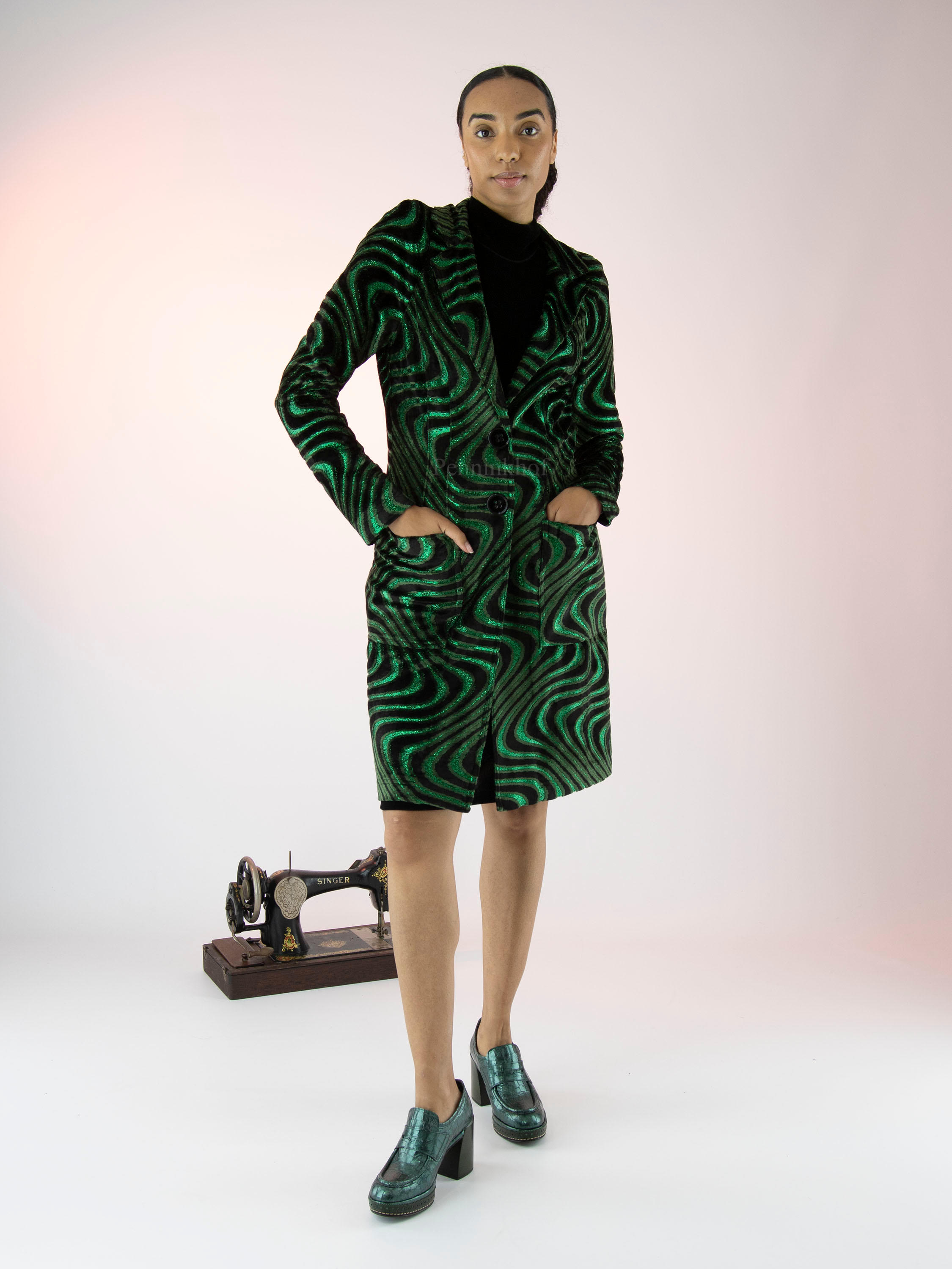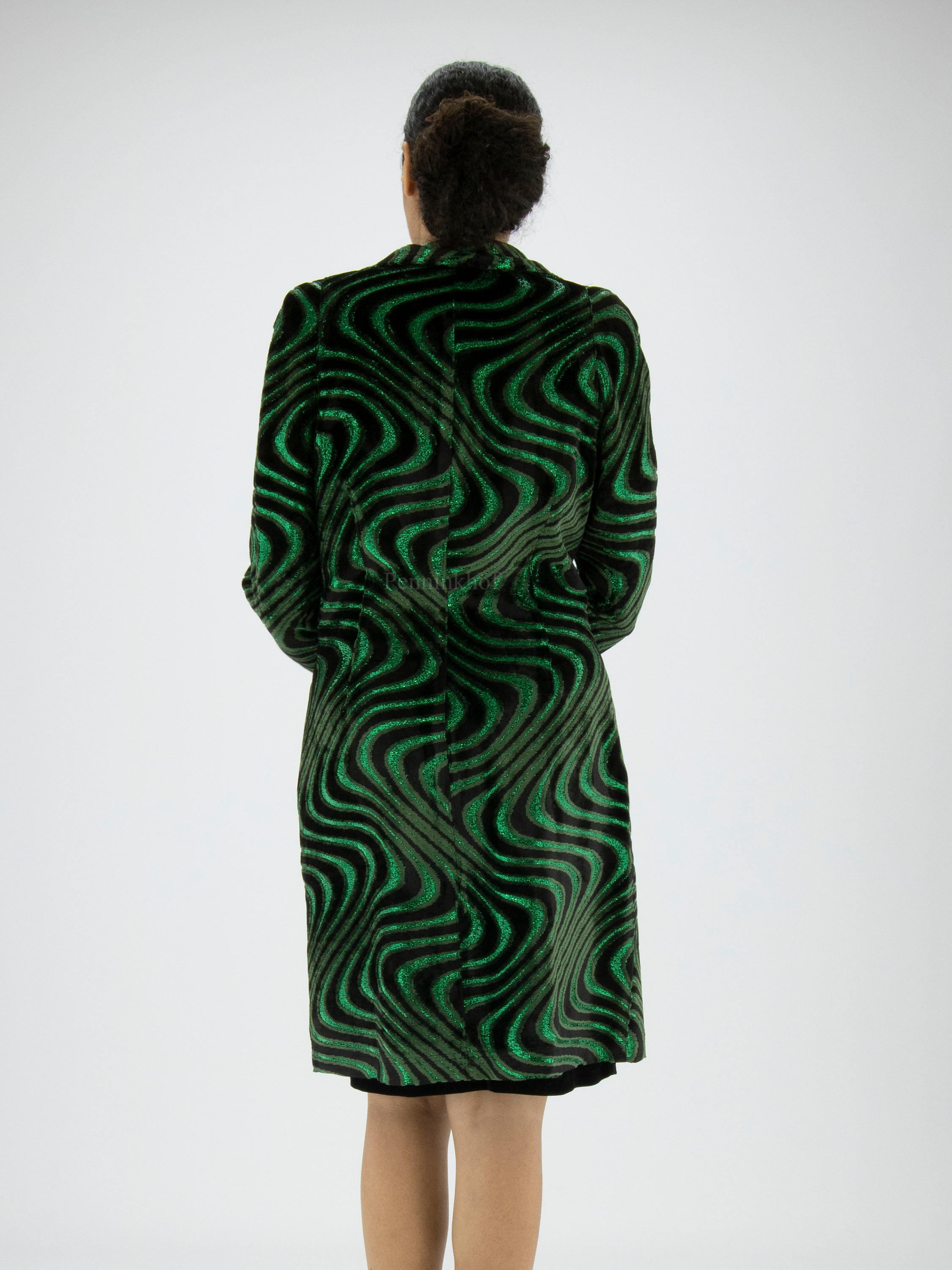 A long blazer from ML Collections in a wavy print featuring metallic green, black and green velour. The blazer has a 2-button fastening and is unlined. This blazer should not be washed.