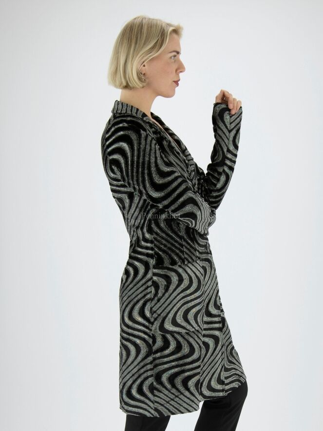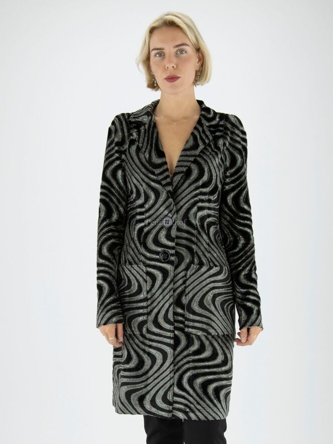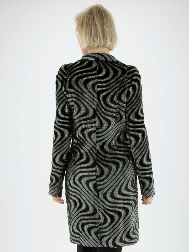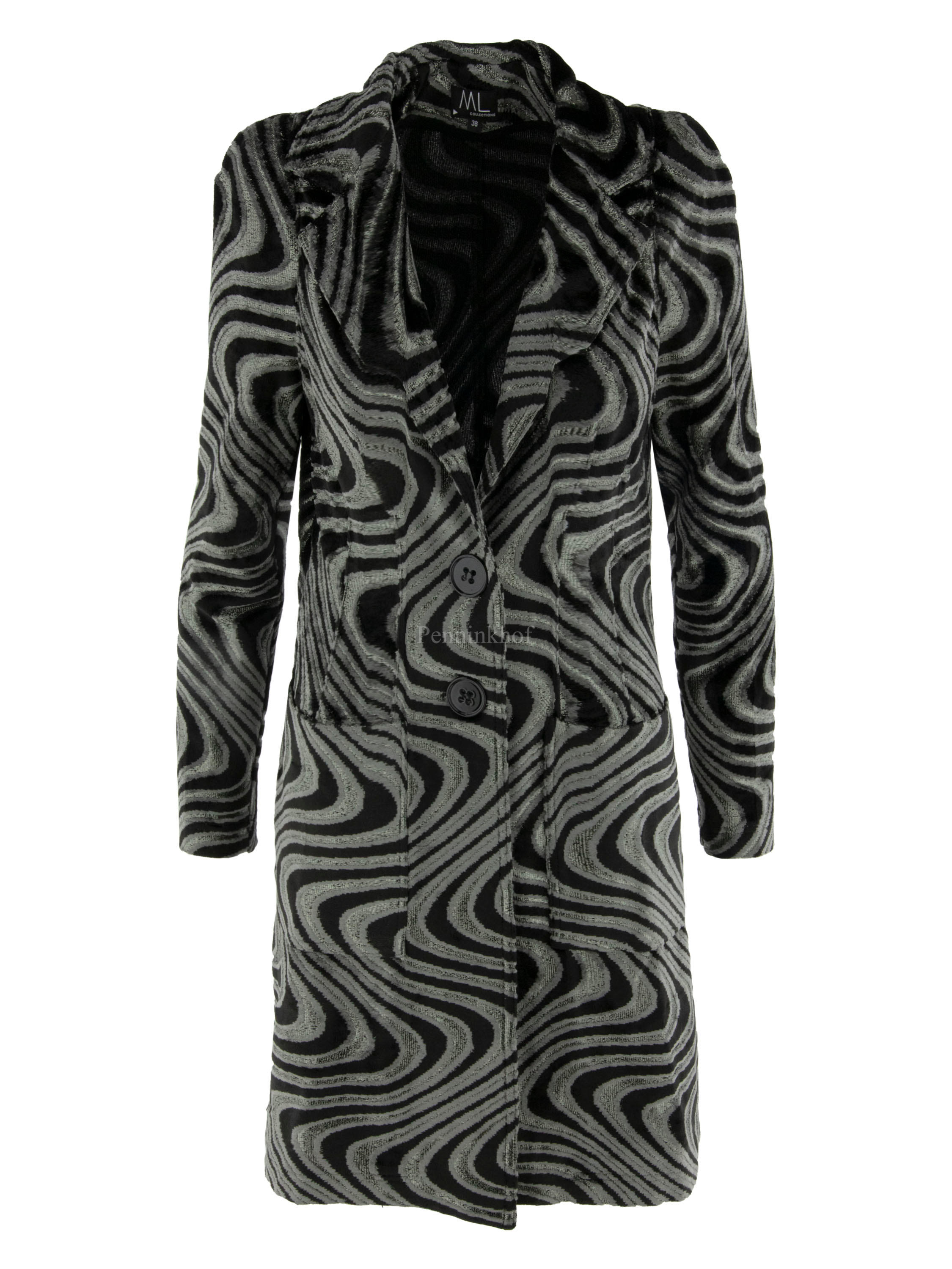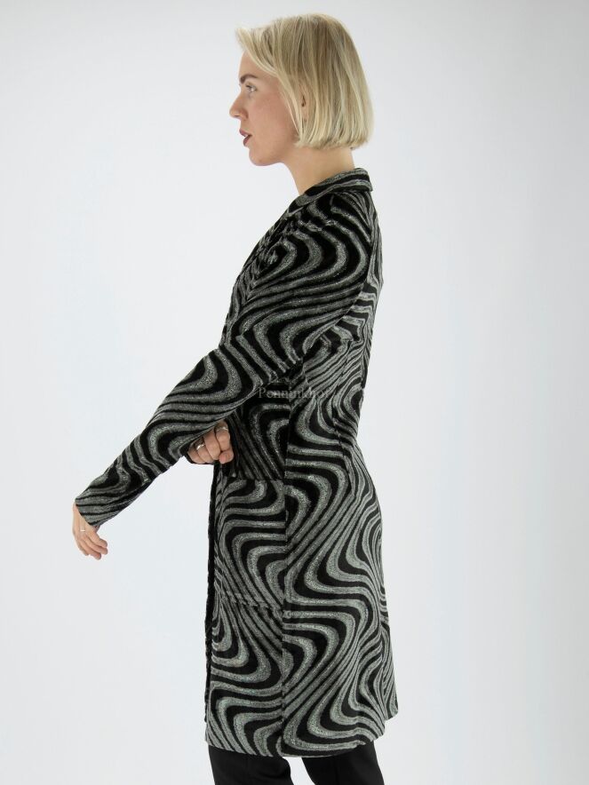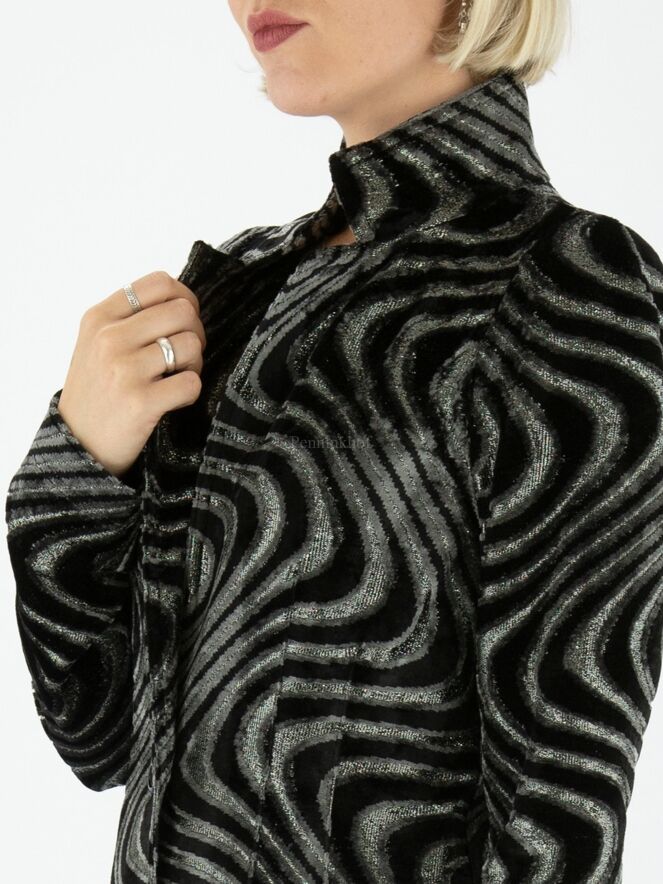 A long blazer from ML Collections in a wavy print featuring silver, black and light grey velour. The blazer has a 2-button fastening and is unlined. This blazer should not be washed.