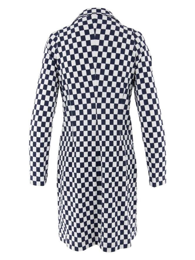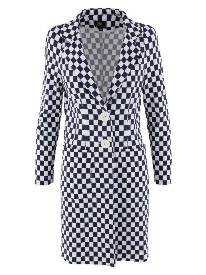 A long blazer from ML Collections in a block print with navy blue and white colors. The blazer has a 3-button closure and is unlined. This blazer should not be washed.