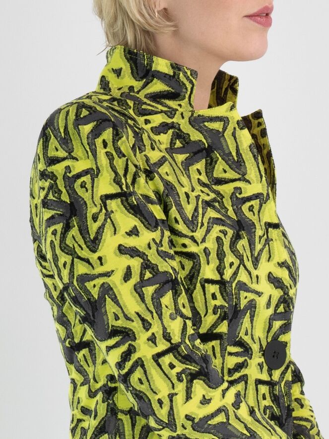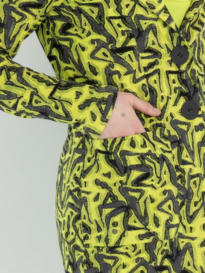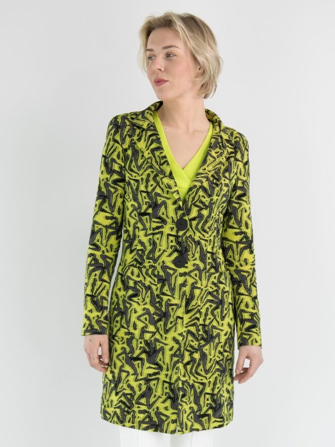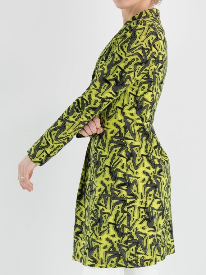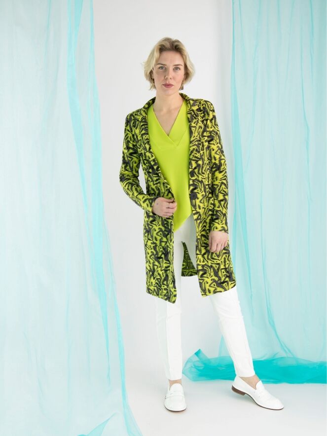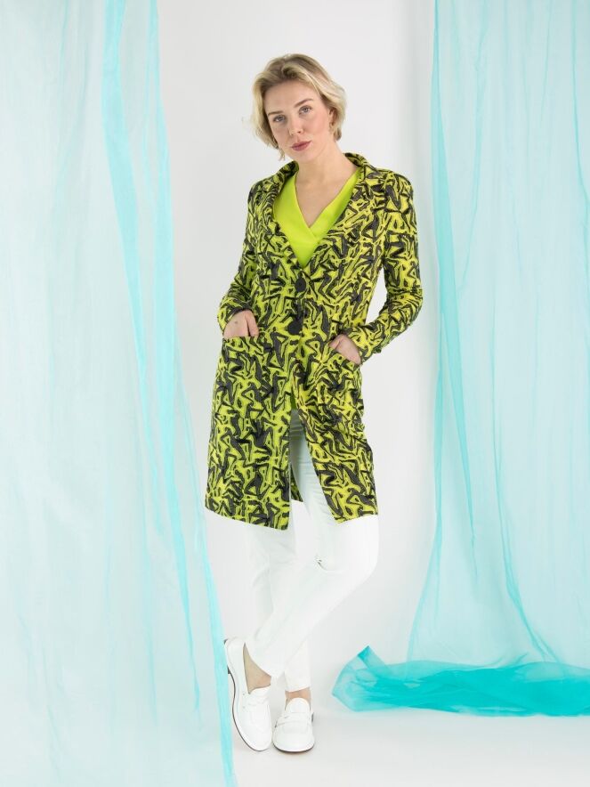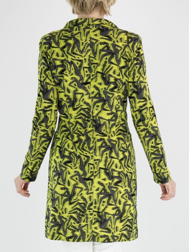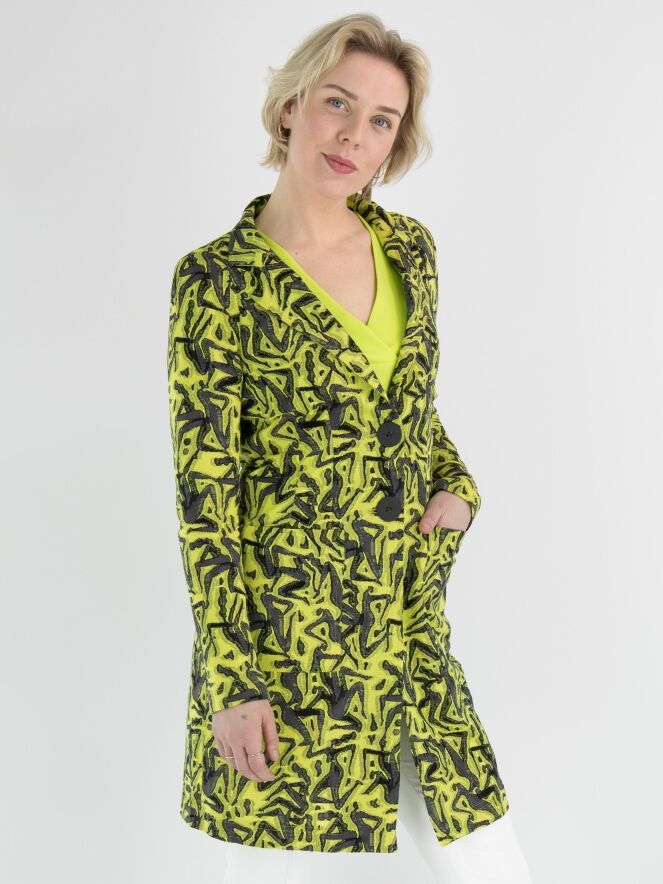 A long blazer by ML Collections featuring a graphic print in lime green and gray. The blazer has a 2-button closure and is unlined. This blazer should not be washed.