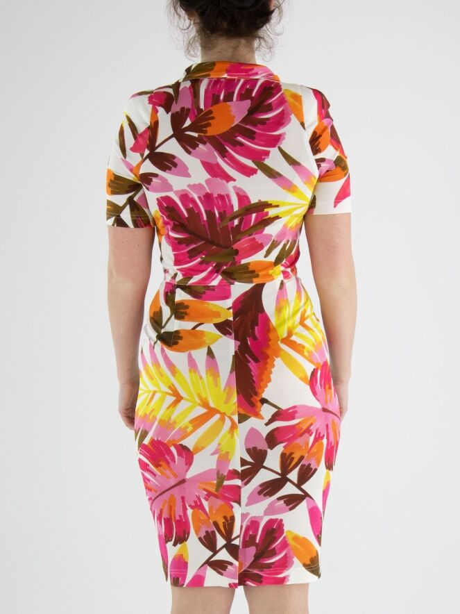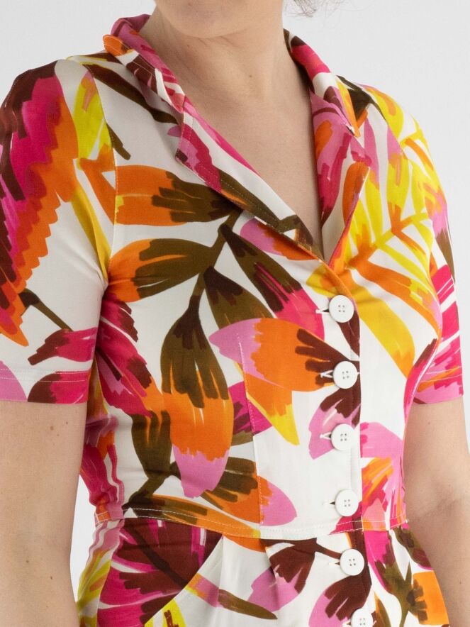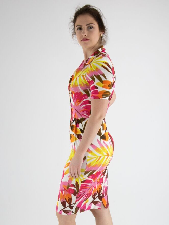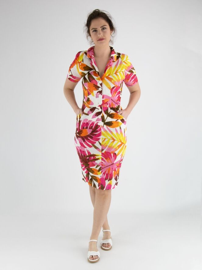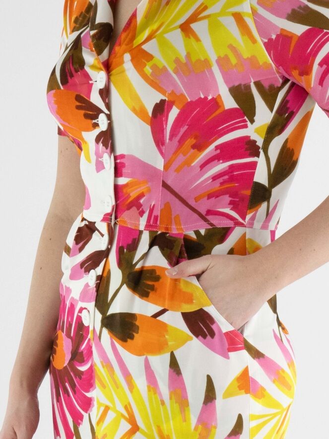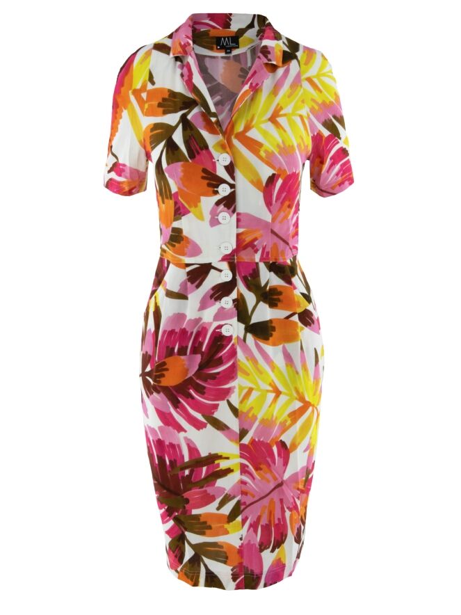 A button-through dress by ML Collections featuring a floral print with colors fuchsia, yellow, brown, and orange on a white background. There is a seam at the waist with patch pockets below it. The dress is unlined and should not be washed.