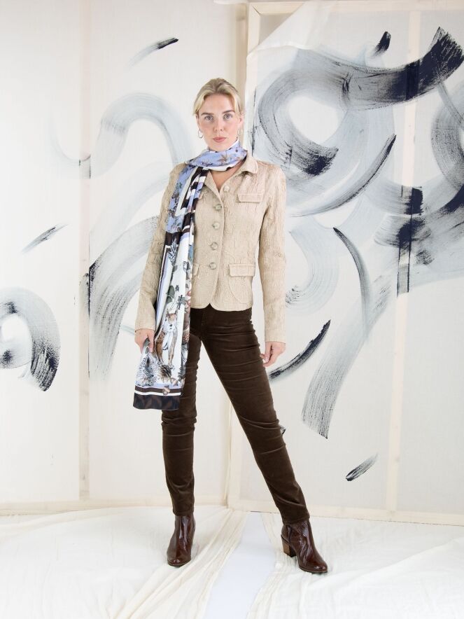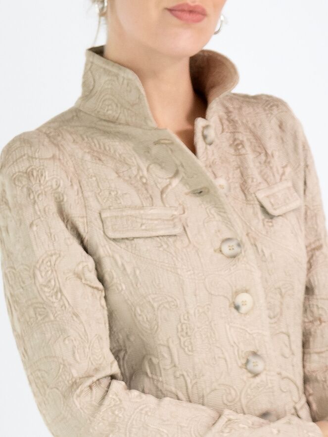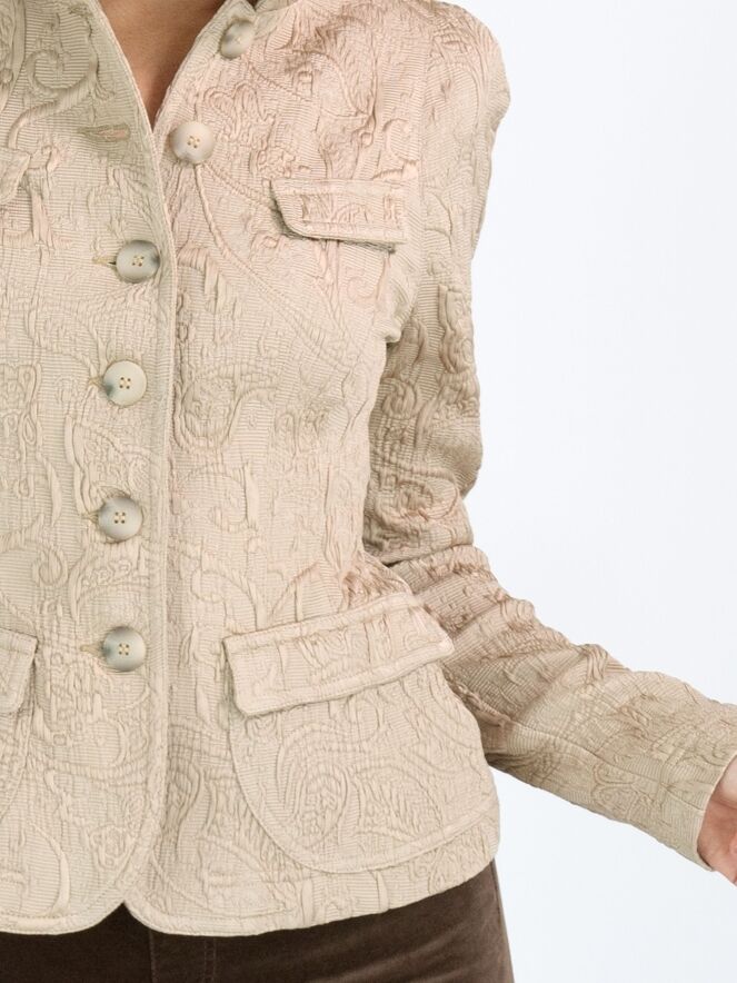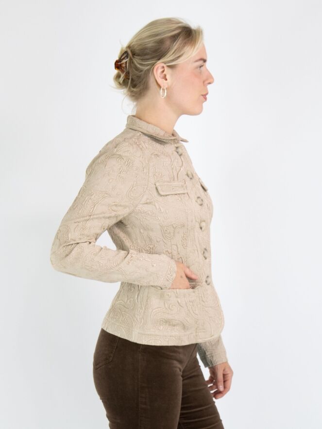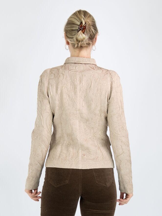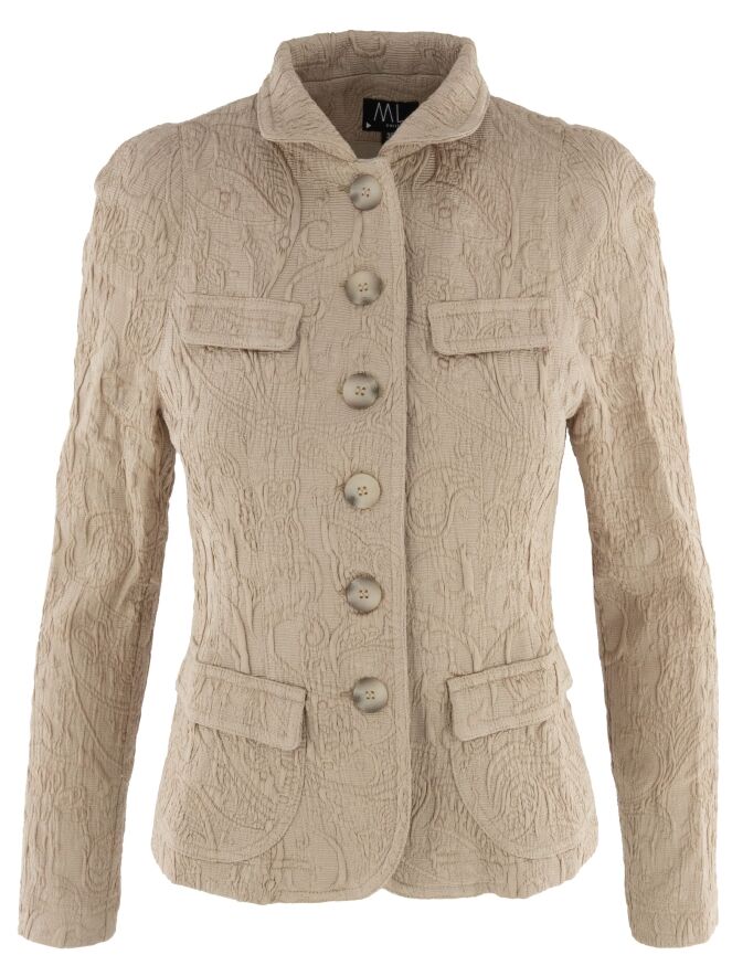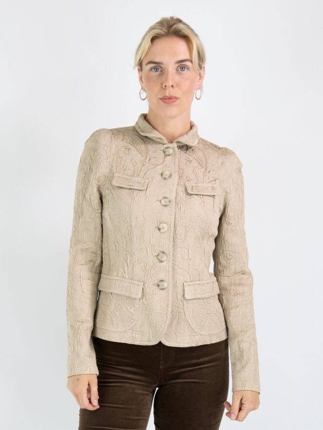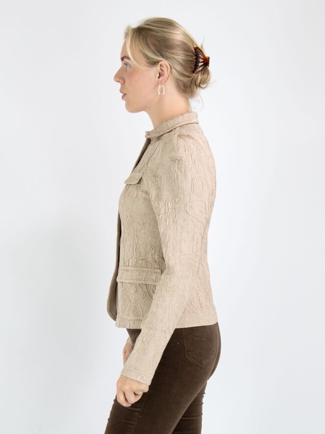 A blazer by ML Collections with a baroque pattern on a ribbed structure in pastel camel color. The blazer has a five-button closure and is unlined. This blazer should not be washed.