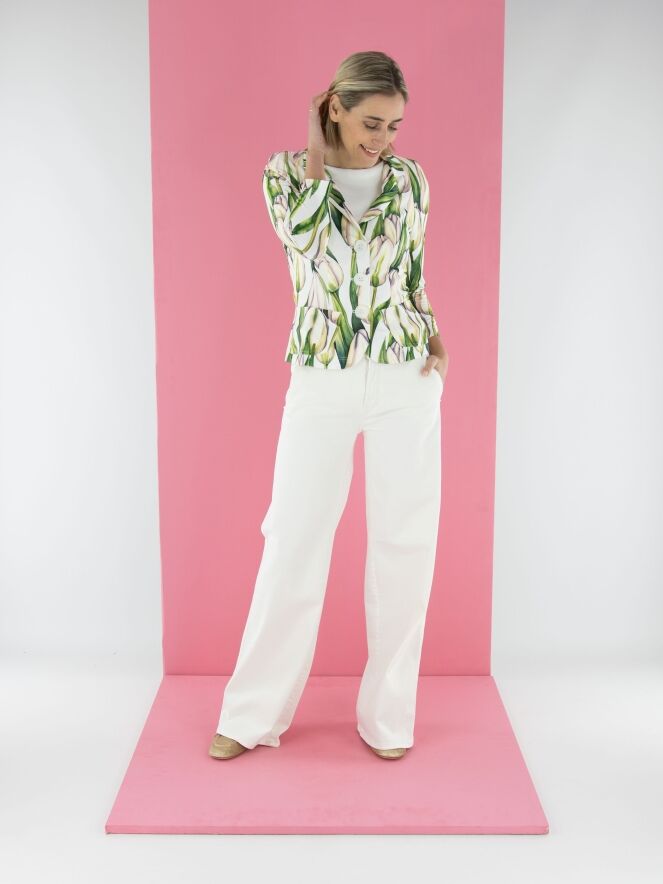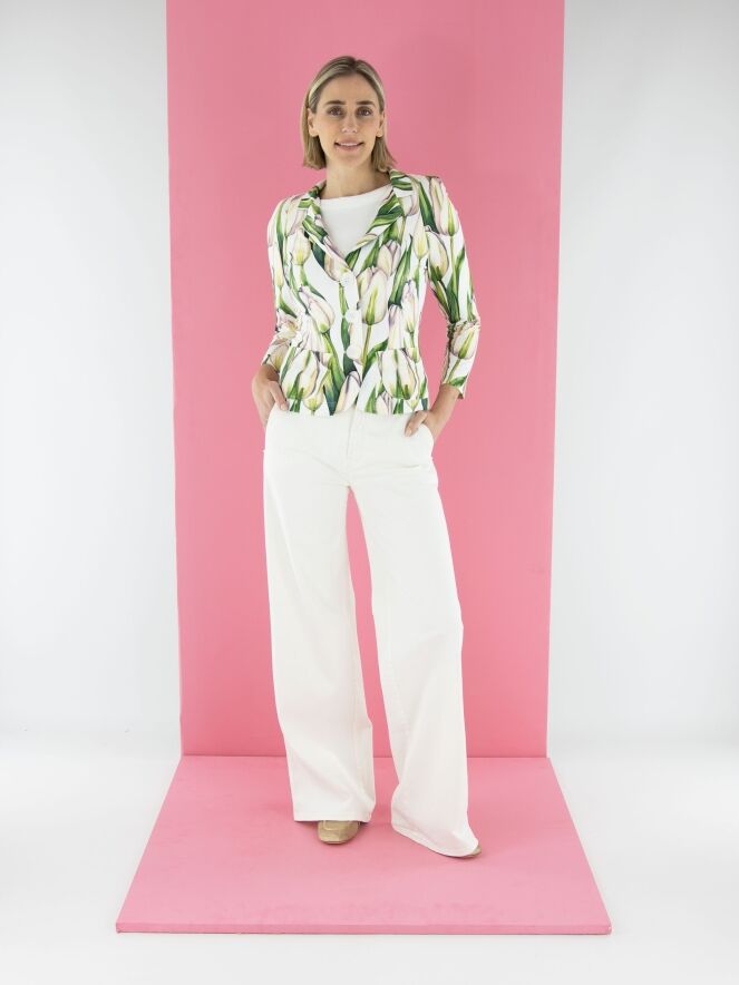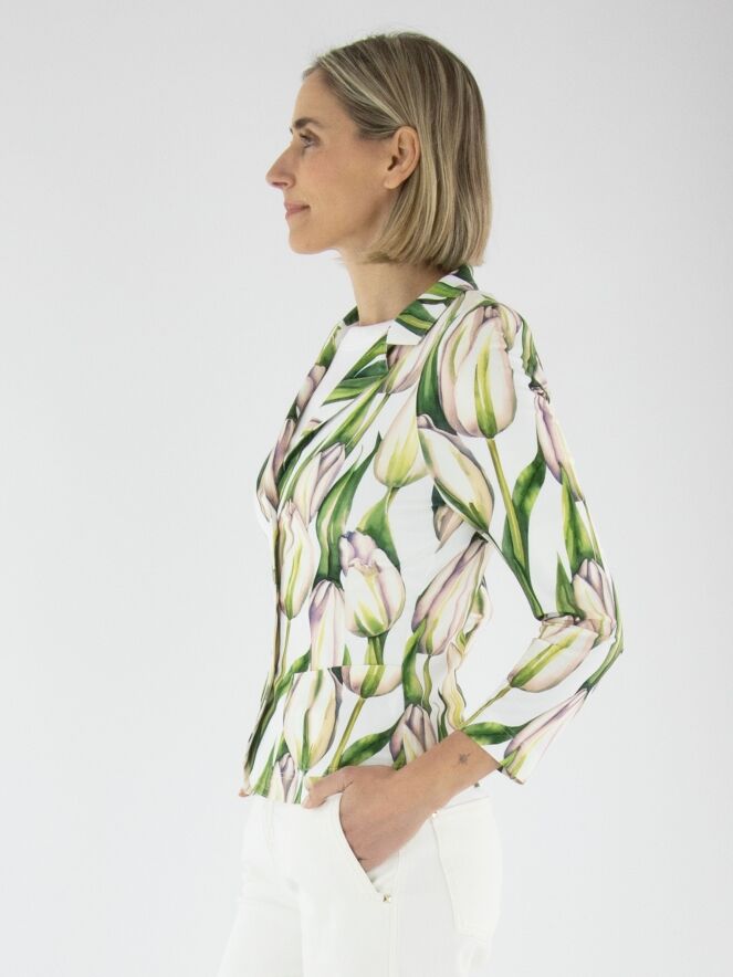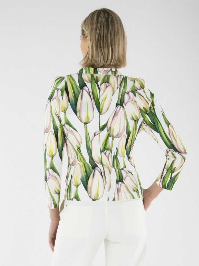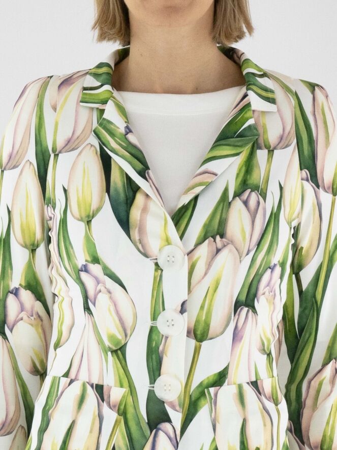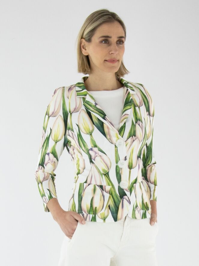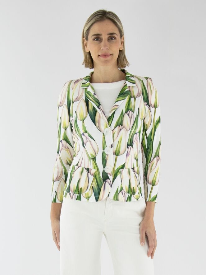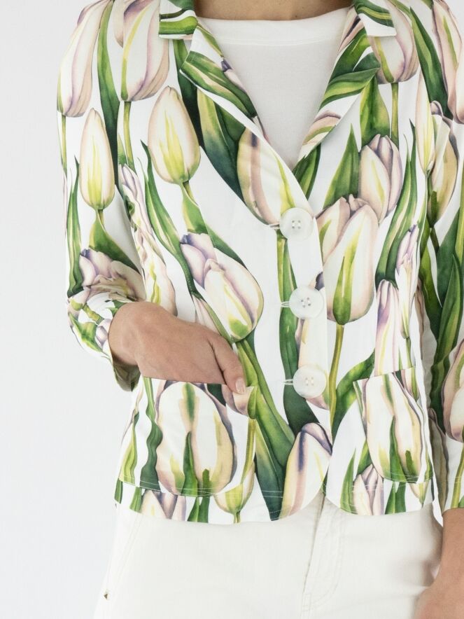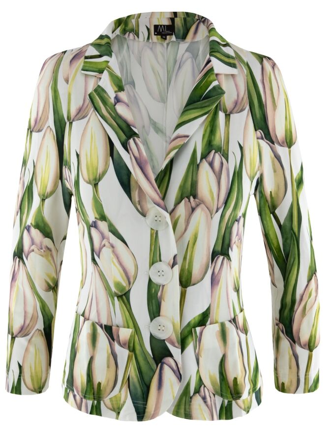A blazer by ML Collections with a tulip print in various shades of green and pink on a white background. The blazer features a three-button closure and is unlined. This blazer must not be washed.