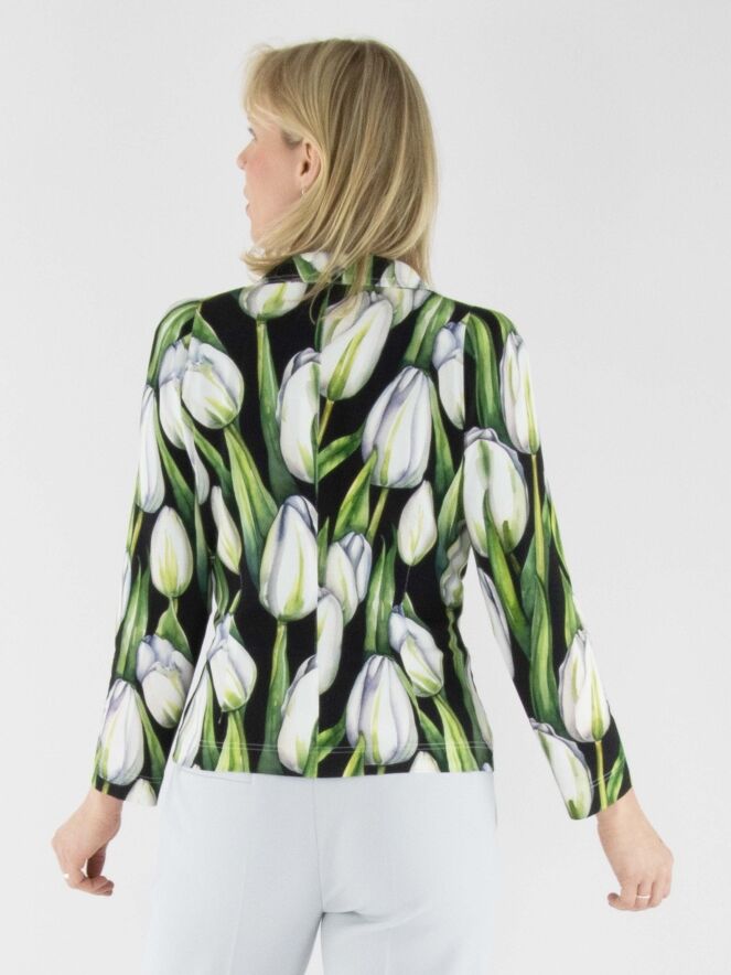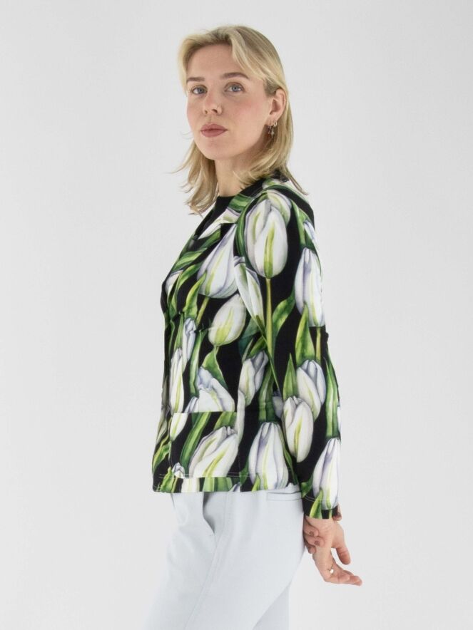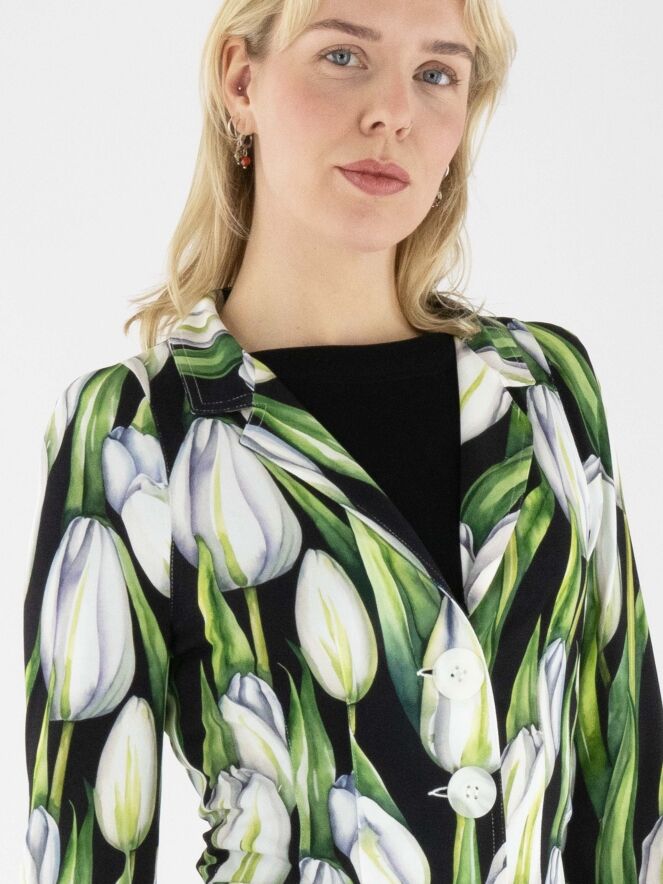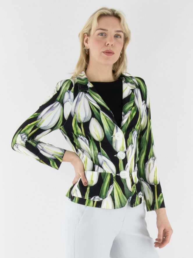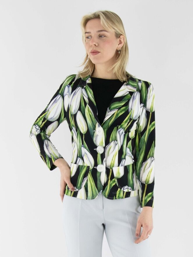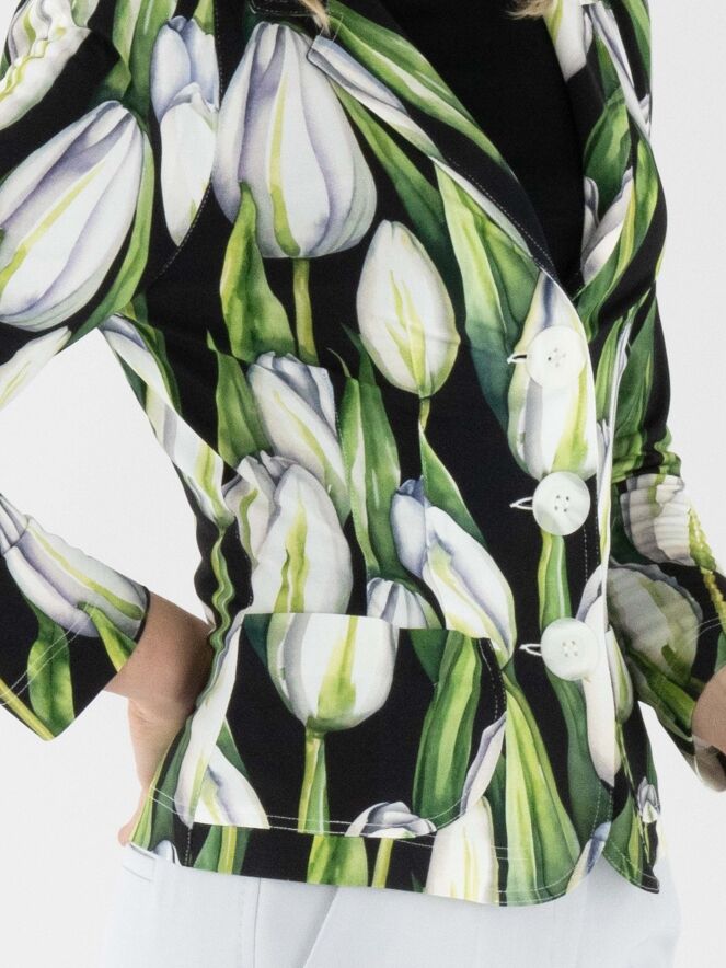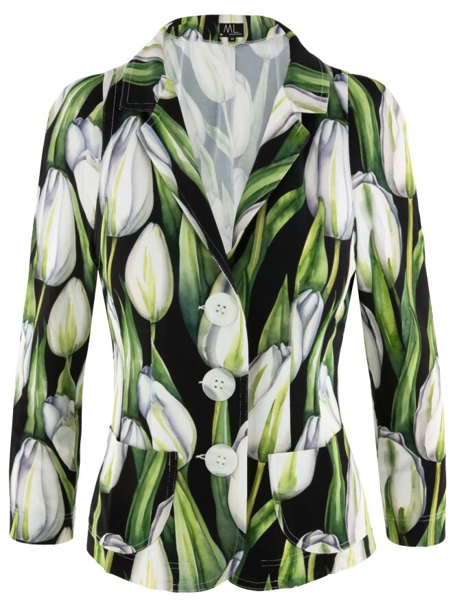 A blazer by ML Collections featuring a tulip print in various shades of green and pink on a black background. The blazer has a three-button closure and is unlined. This blazer must not be washed.