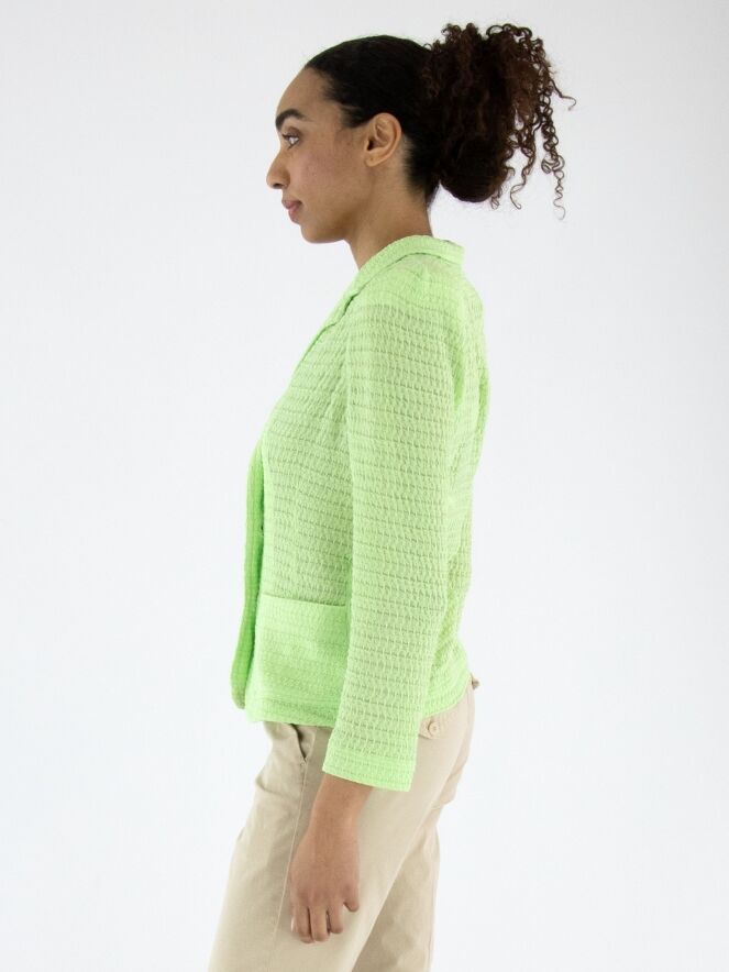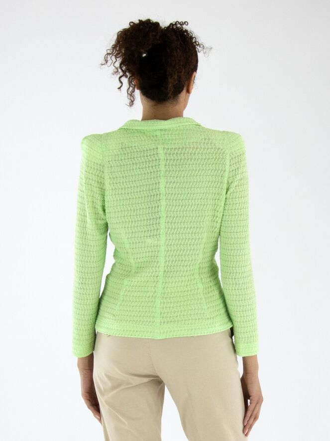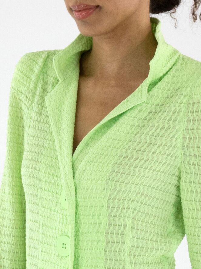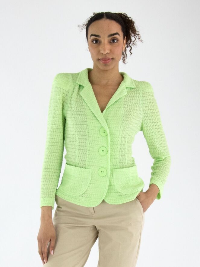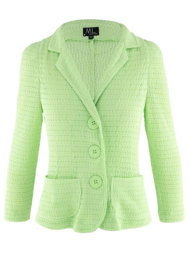 A blazer from ML Collections with a smocked texture in a fresh pistachio green color. The blazer features a three-button closure and is unlined. This blazer must not be washed.