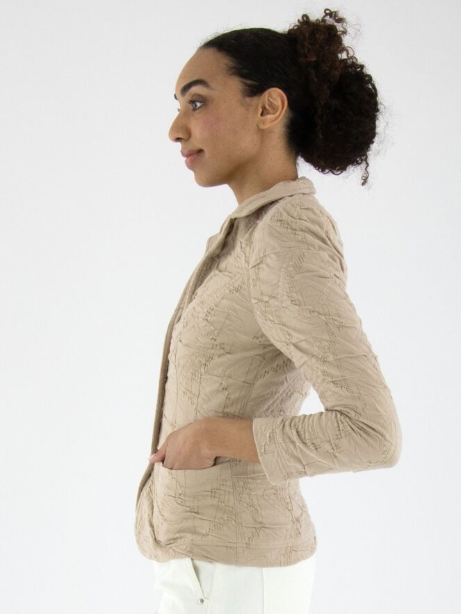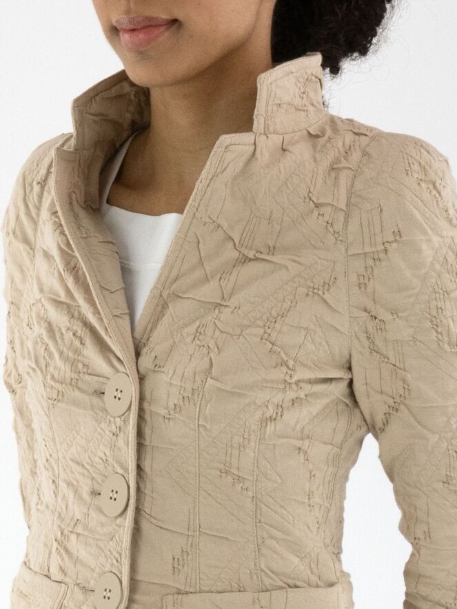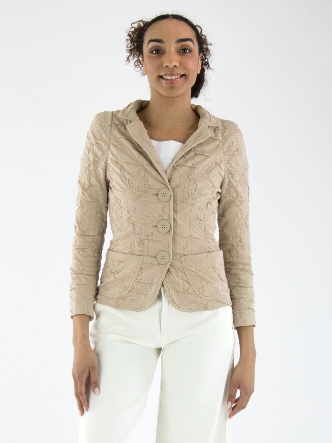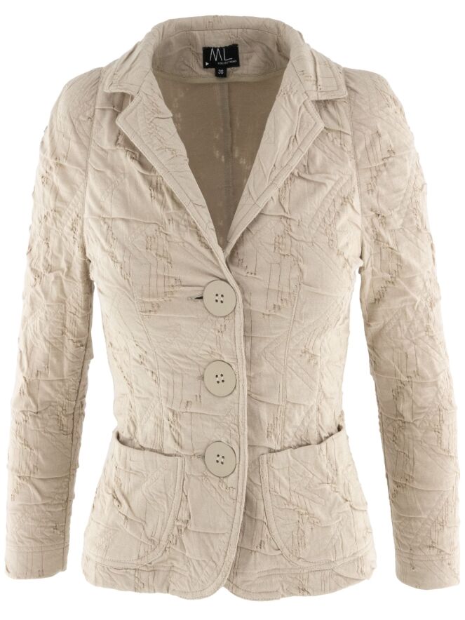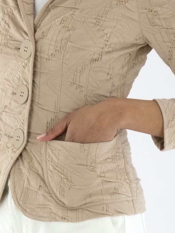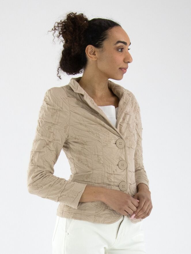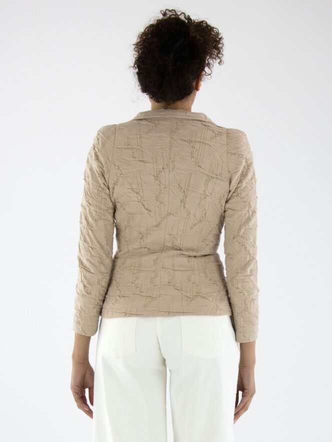 A blazer from ML Collections in sand color. The fabric has a smocked texture. The blazer is unlined and features a three-button closure. This blazer must not be washed.