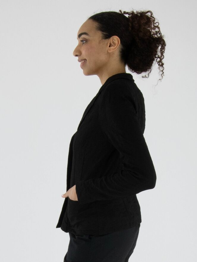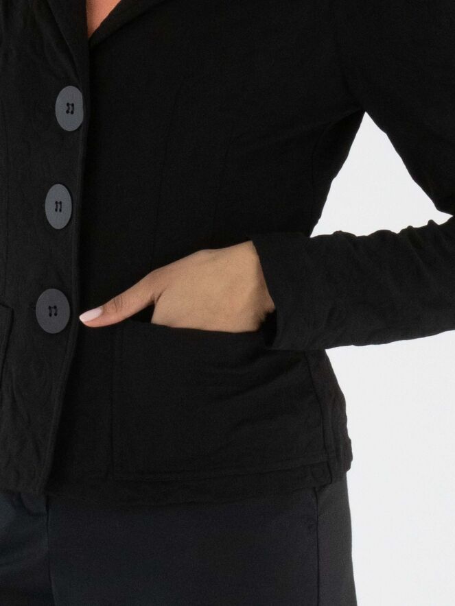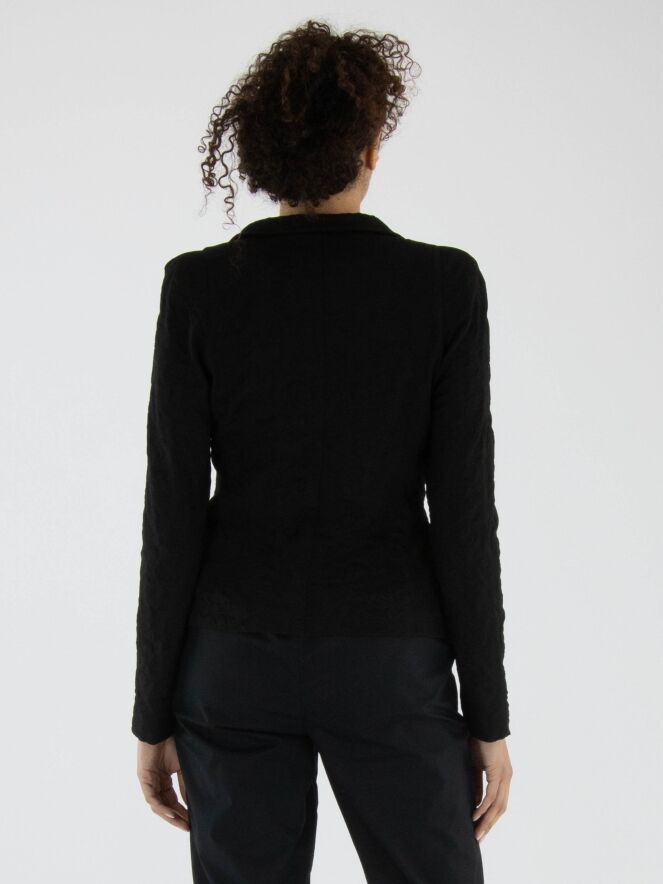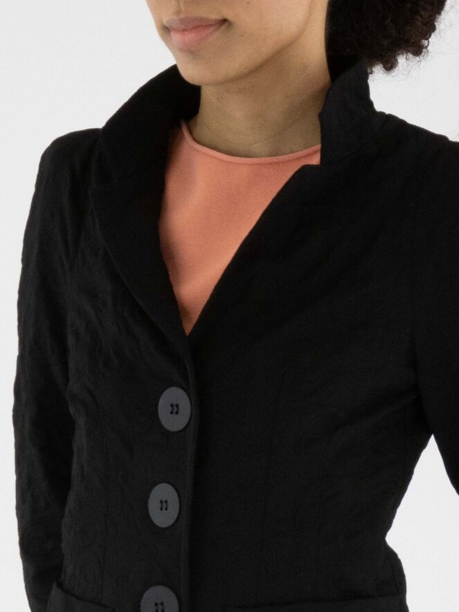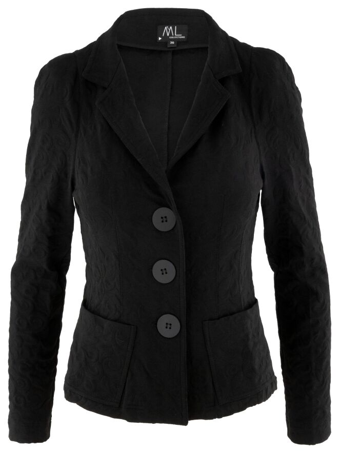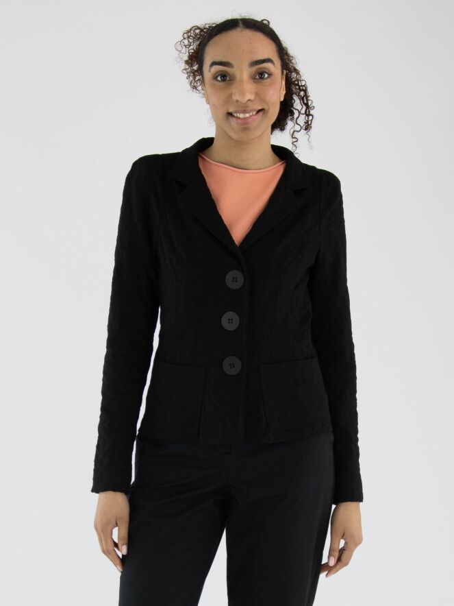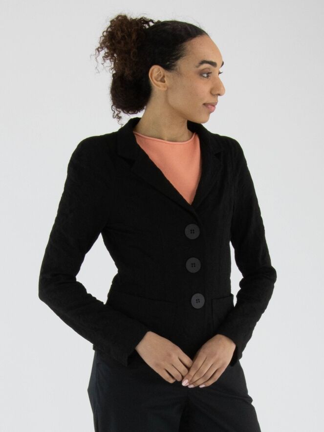 A blazer by ML Collections in black. The fabric features a smocked baroque pattern. The blazer is unlined and fastens with three buttons. This blazer must not be washed.