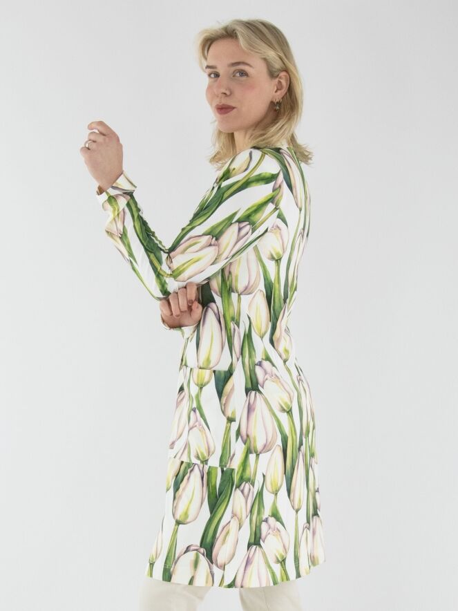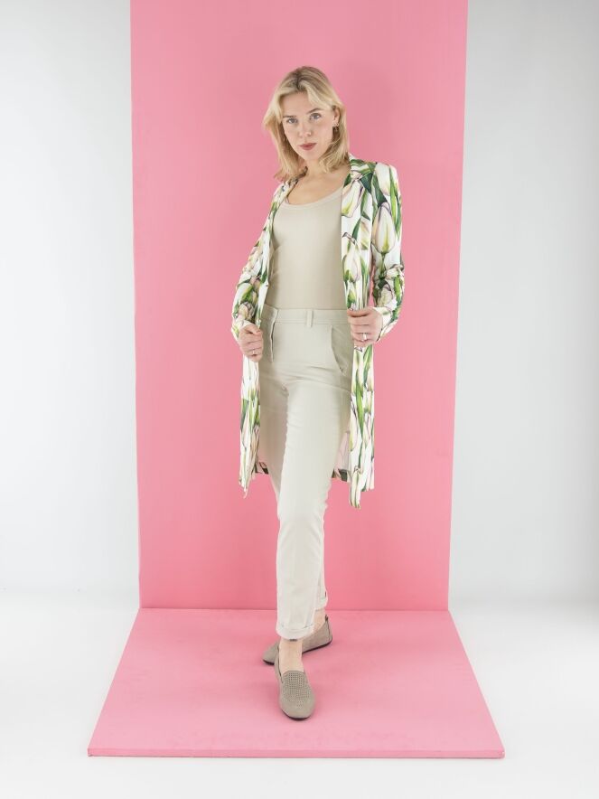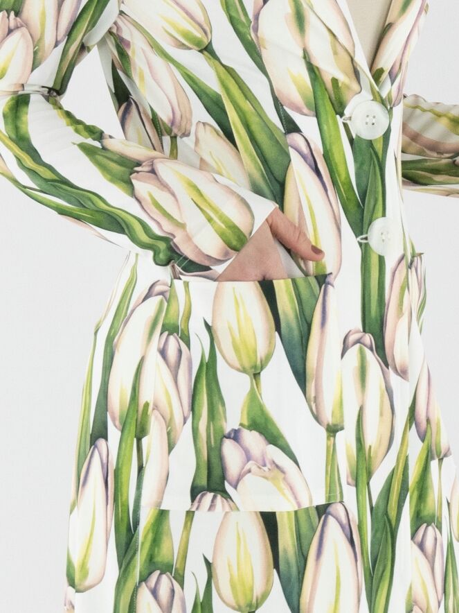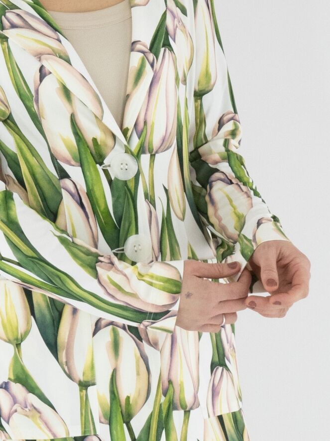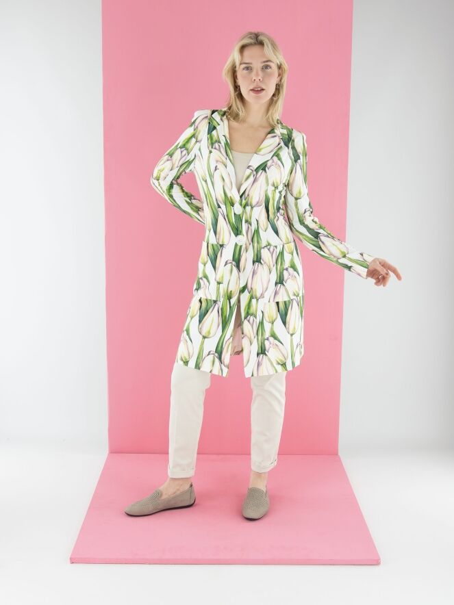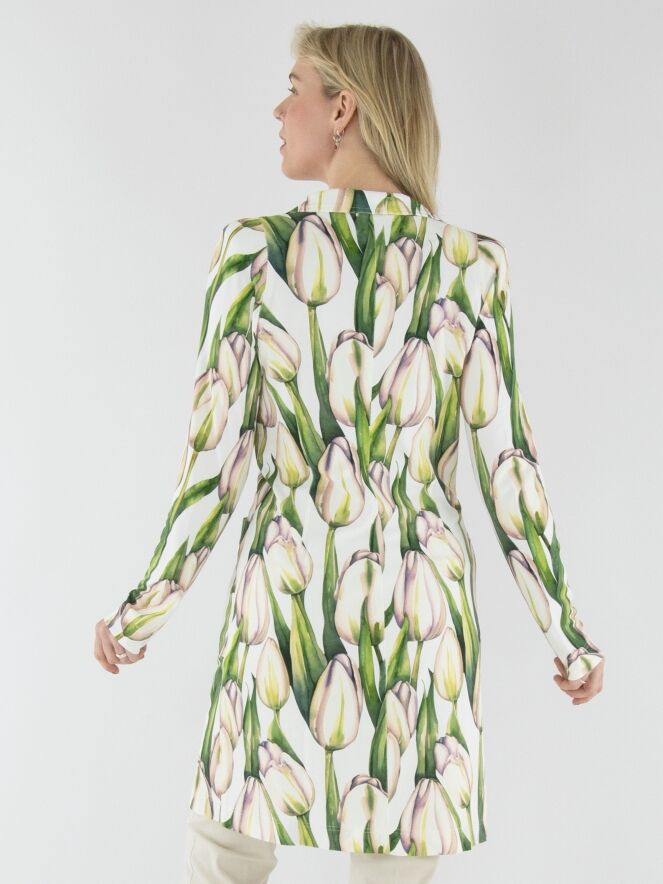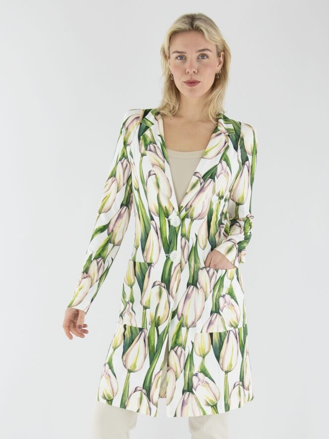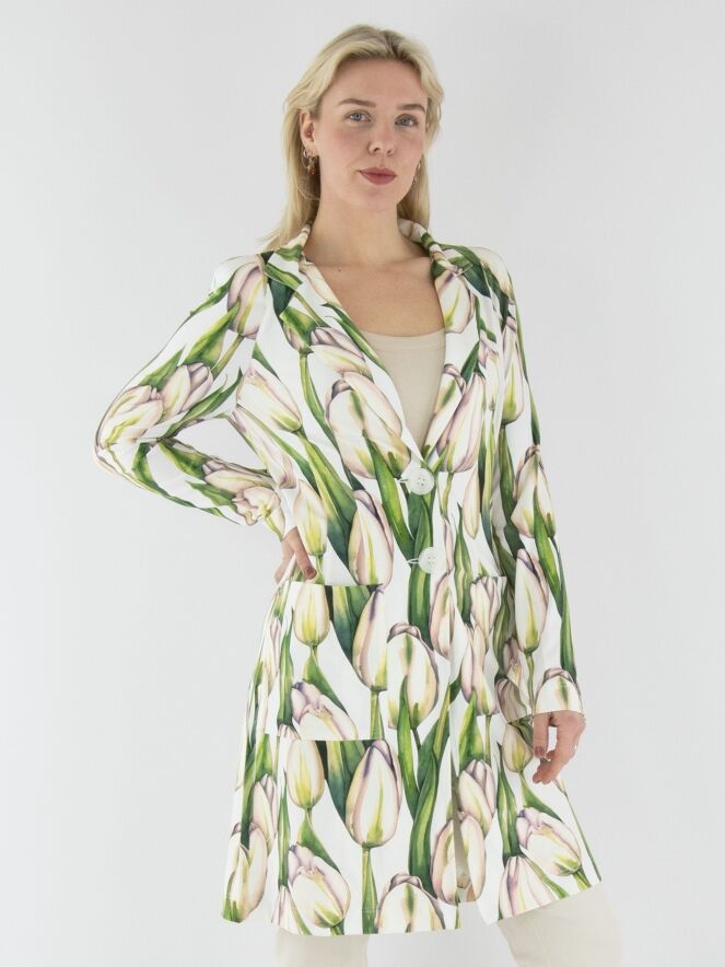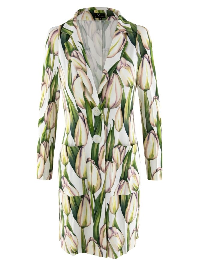 A long blazer by ML Collections featuring a tulip print in various shades of green and pink on a white background. The blazer has a two-button closure and is unlined. This blazer must not be washed.