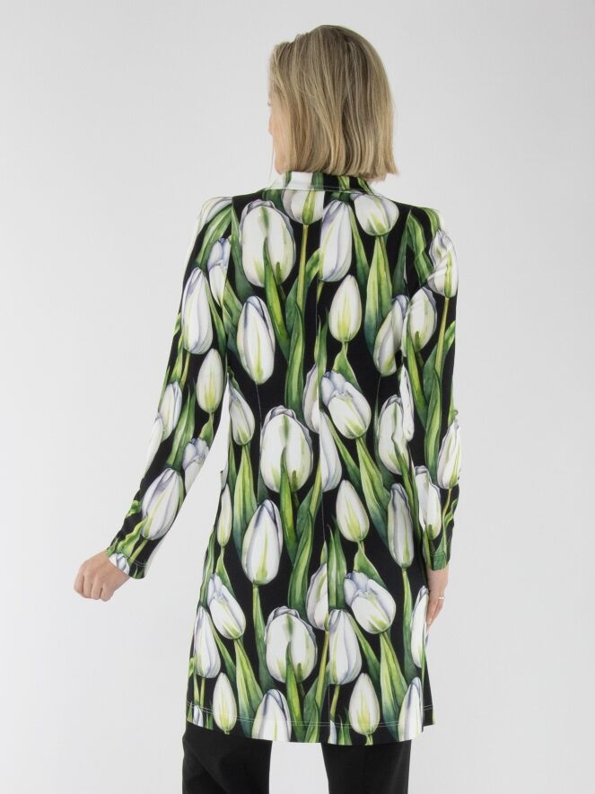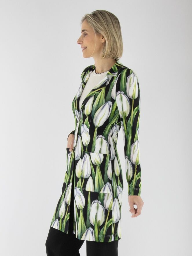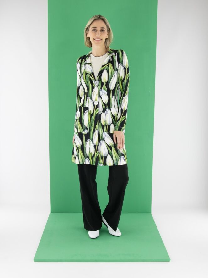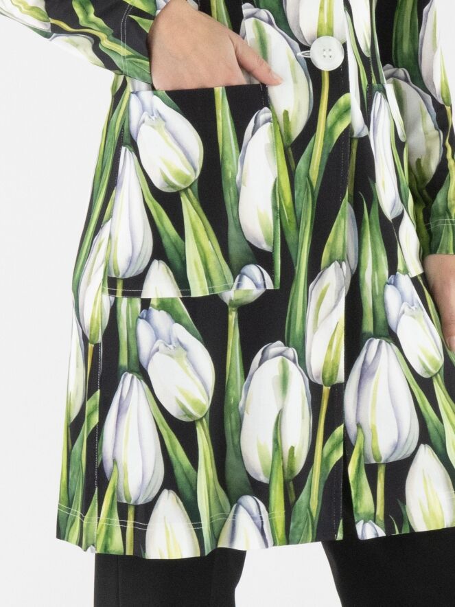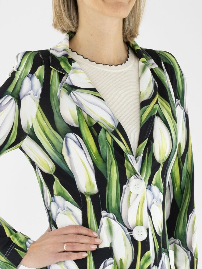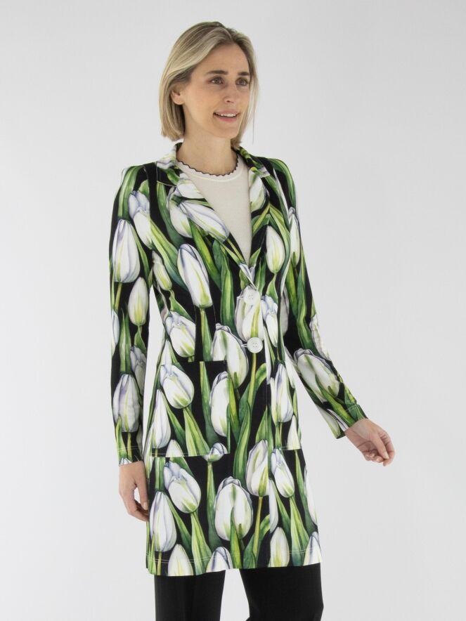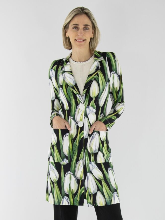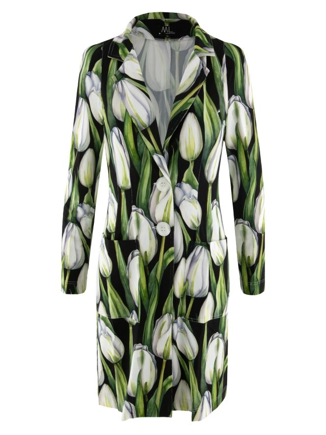 A long blazer by ML Collections featuring a tulip print in various shades of green and pink on a black background. The blazer has a two-button closure and is unlined. This blazer must not be washed.