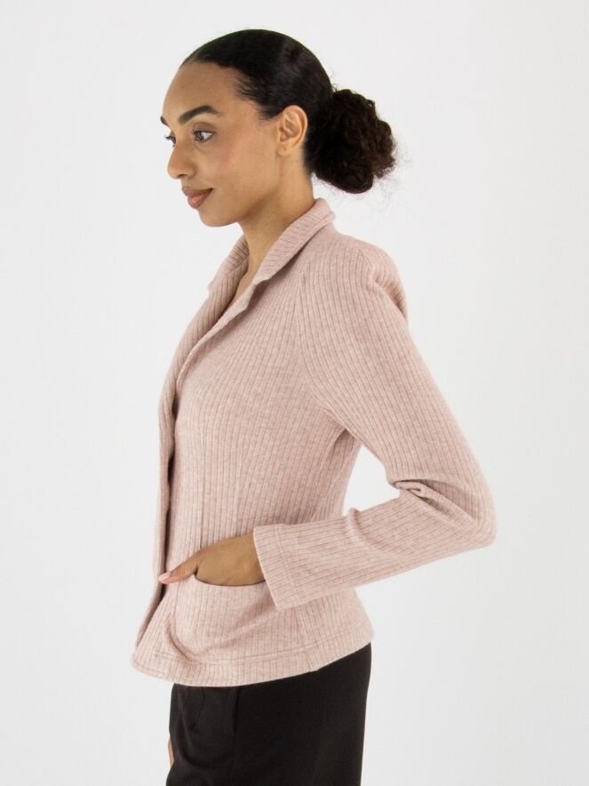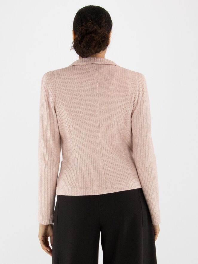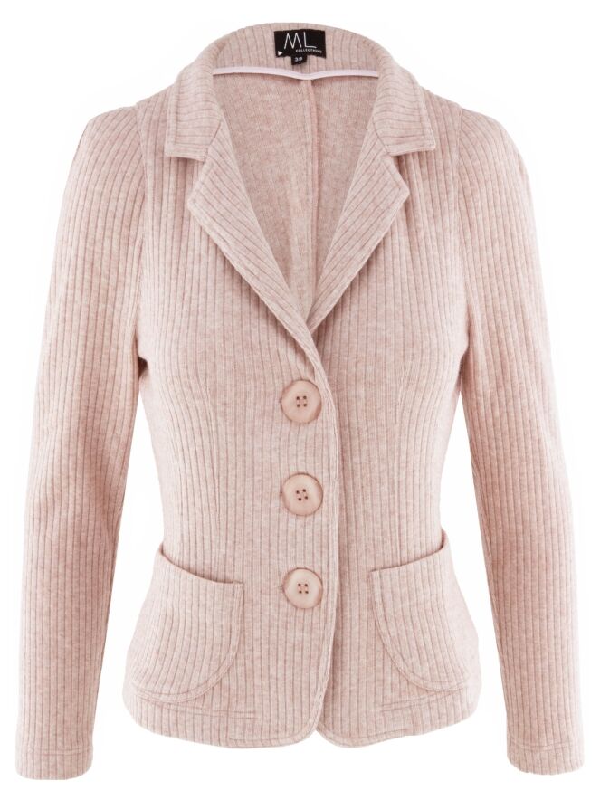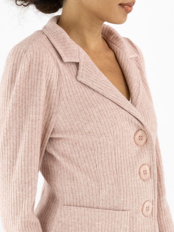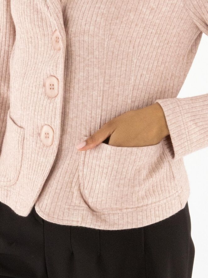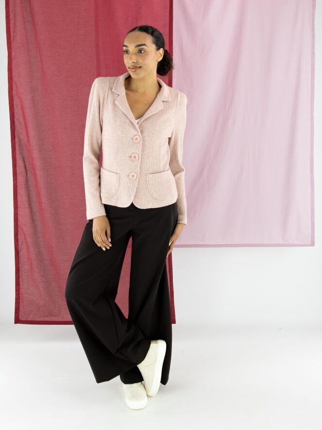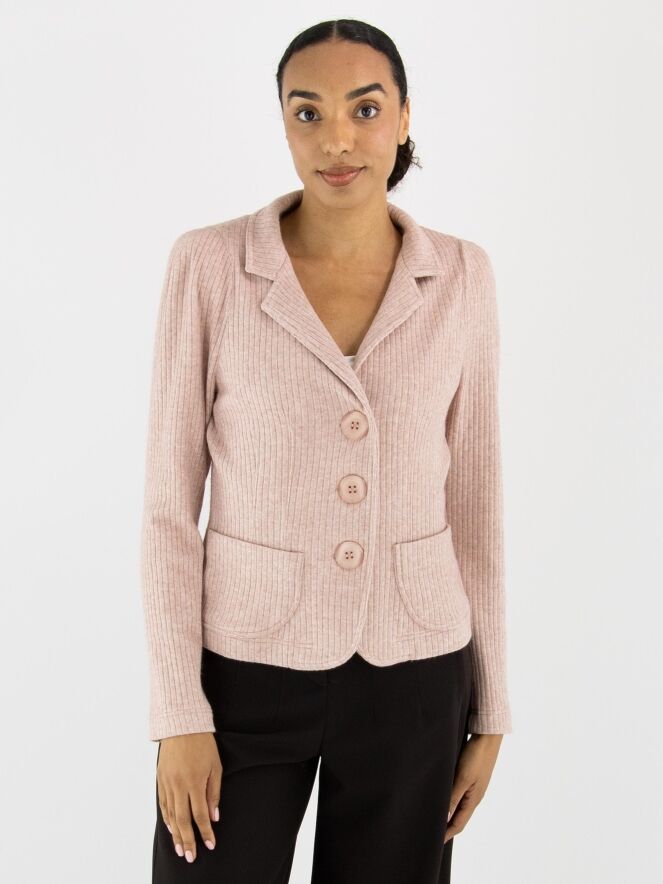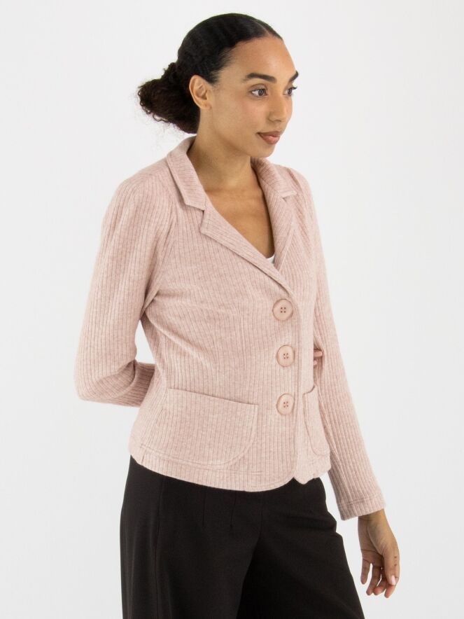 A blazer by ML Collections in pink. The fabric has a fine ribbed texture. The blazer features a three-button closure and is unlined. This blazer must not be washed.
