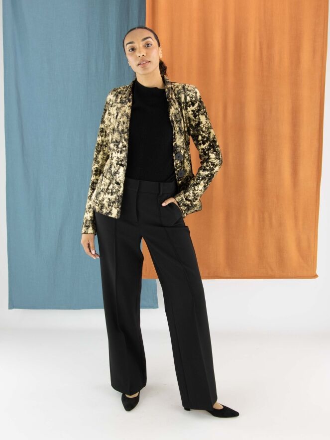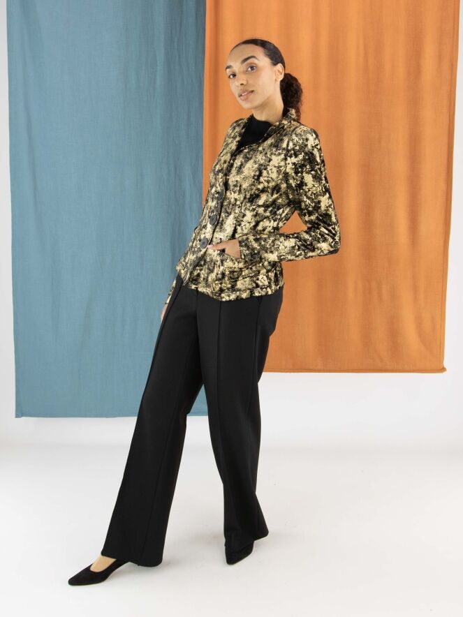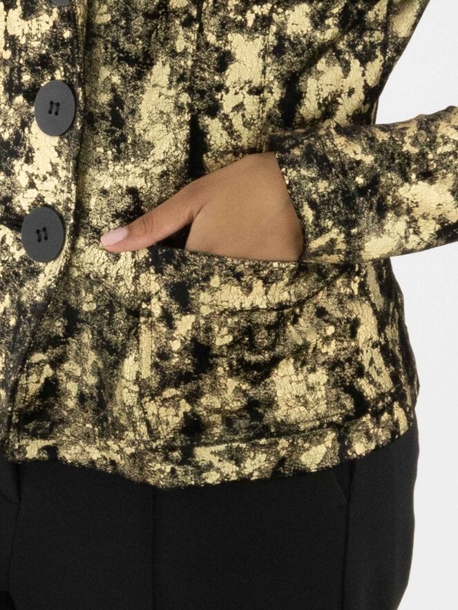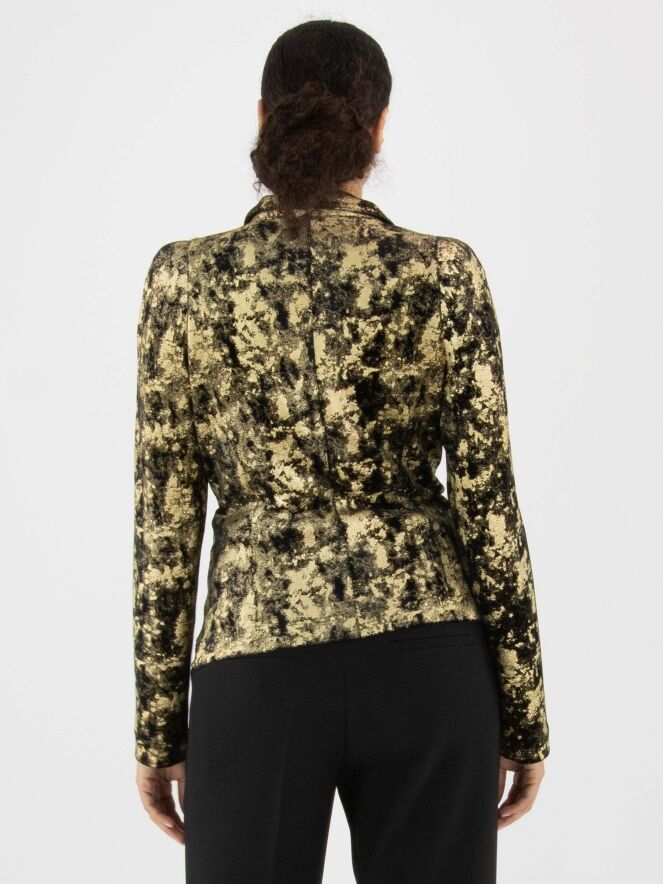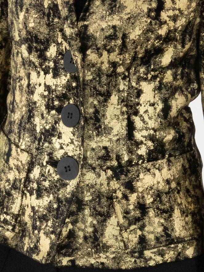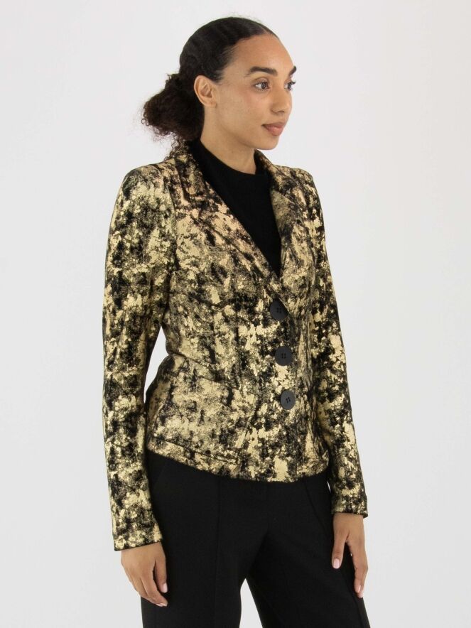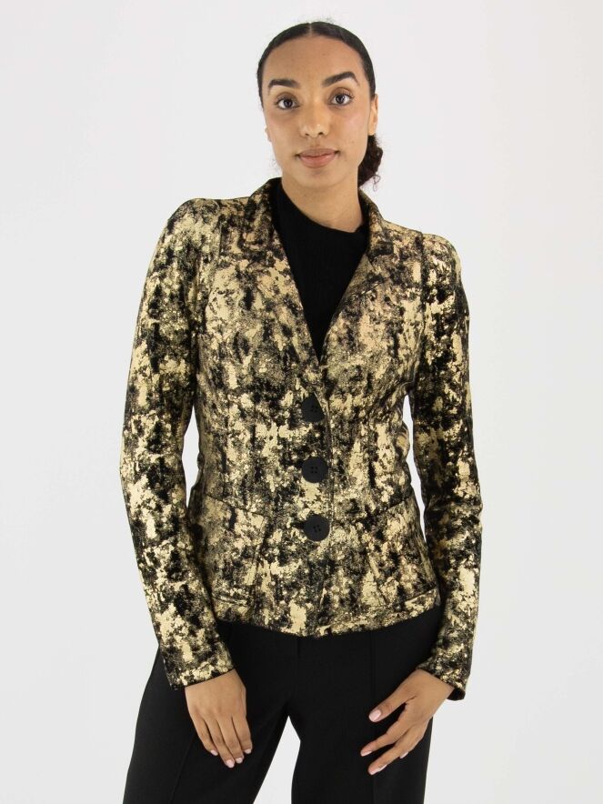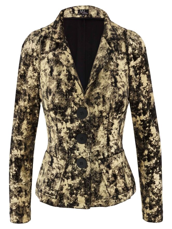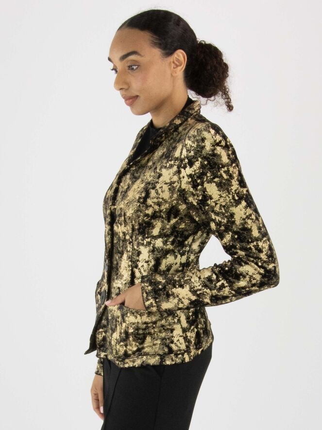 A velour blazer by ML Collections with a graphic print in gold and black. The blazer features a three-button closure and is unlined. This blazer must not be washed.