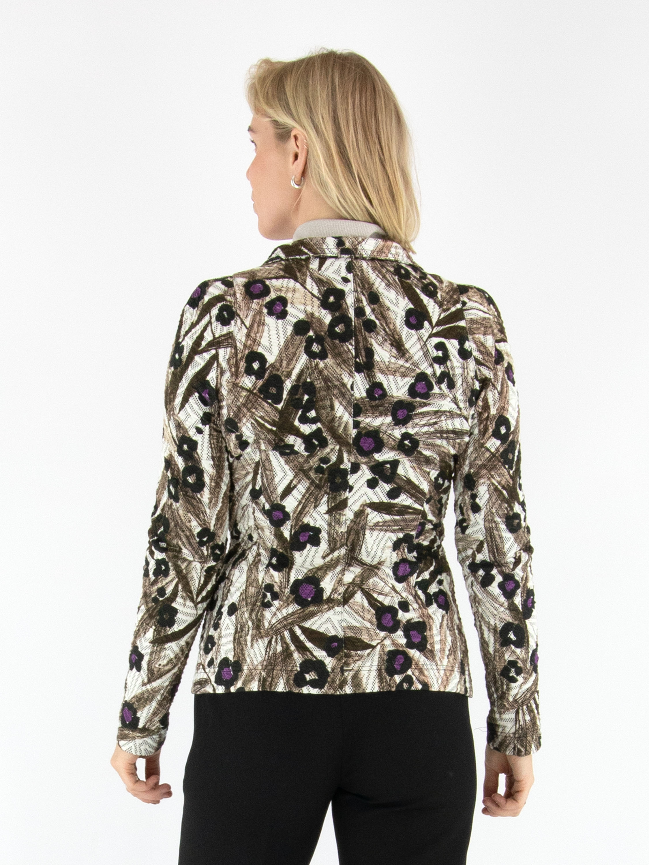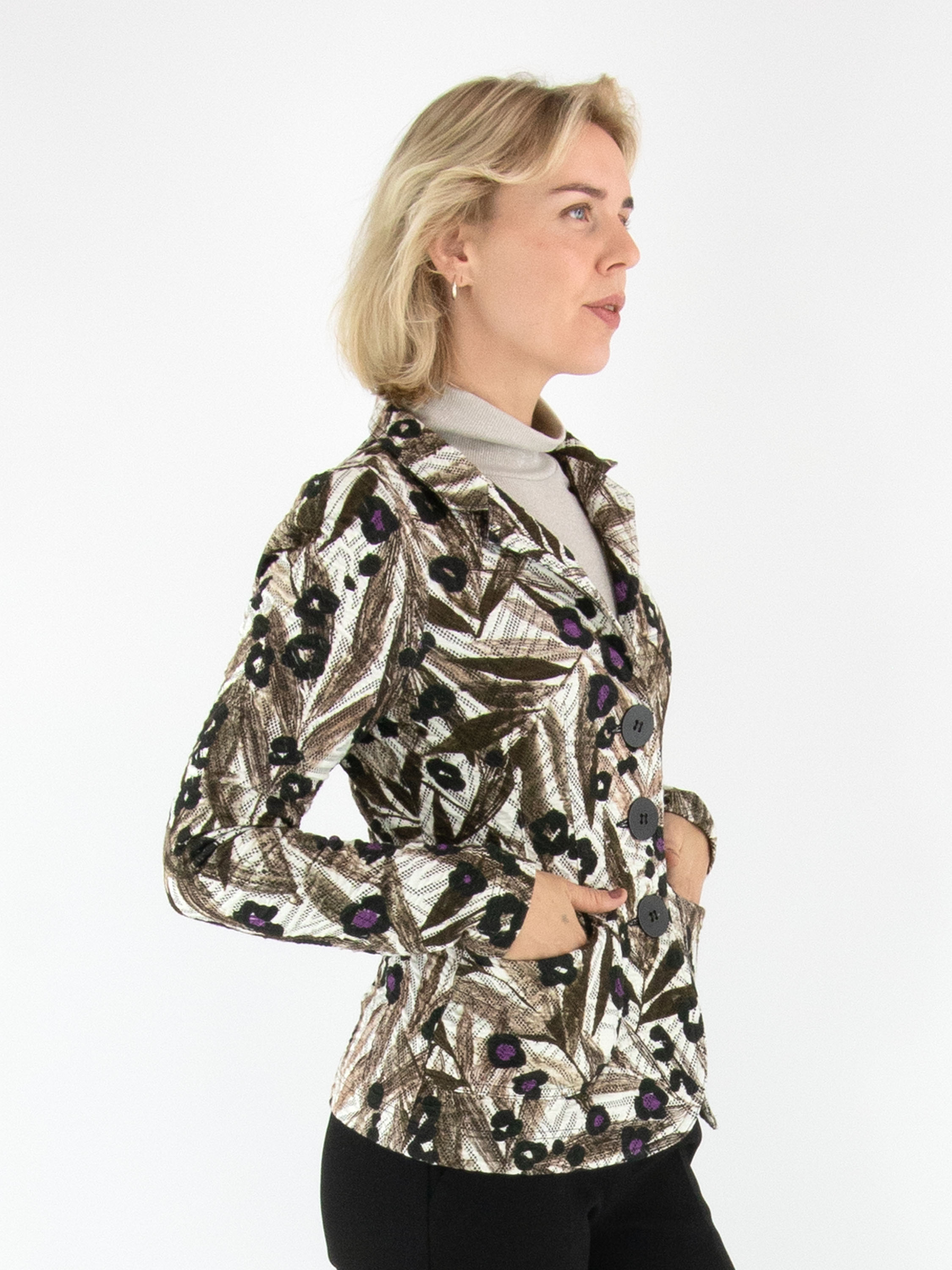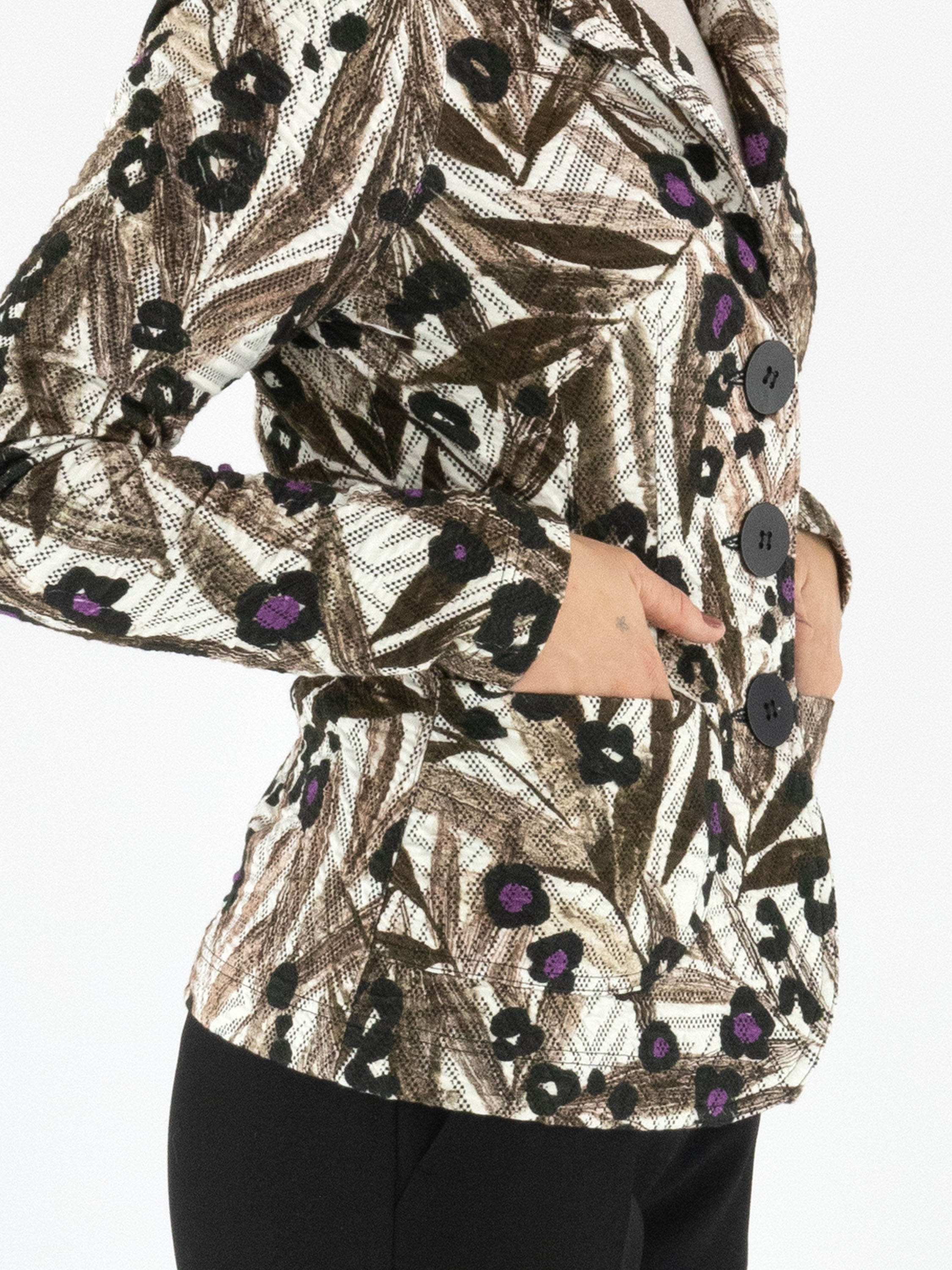 Blazer by ML Collections featuring an exclusive leaf-and-flower print in purple and black, set against an off-white background with brown accents. This elegant women’s blazer is unlined, giving it a graceful and stylish drape. Designed with a three-button closure, it enhances a refined and feminine silhouette. To preserve its premium quality, this blazer should not be washed.