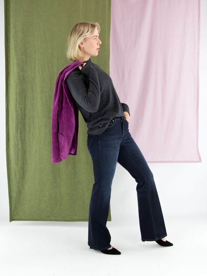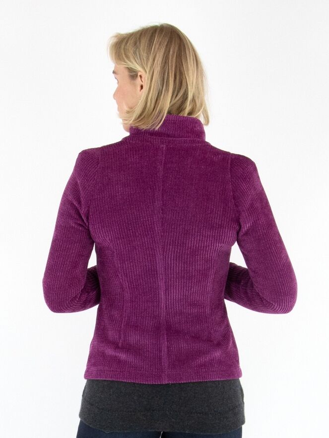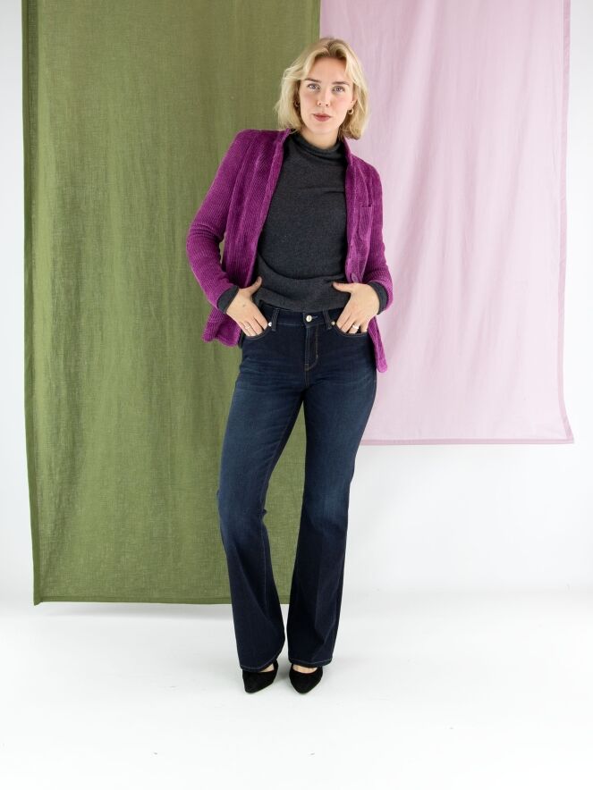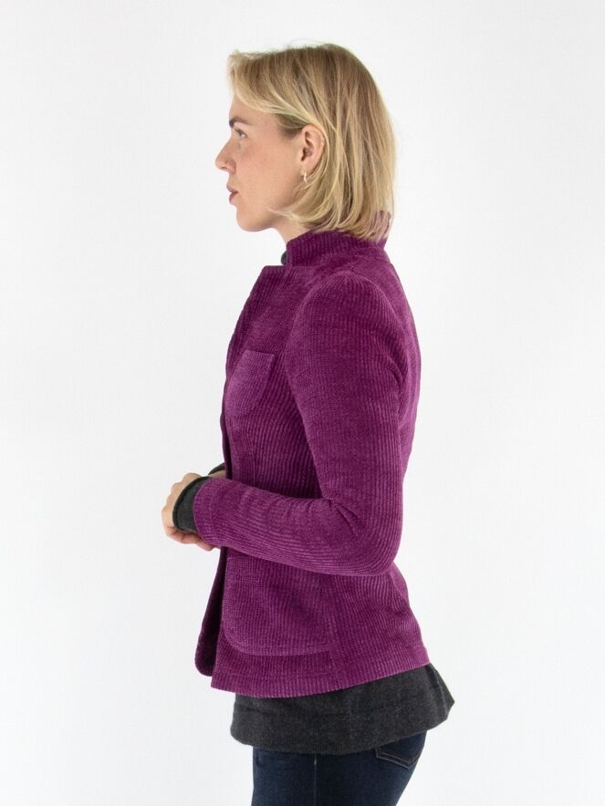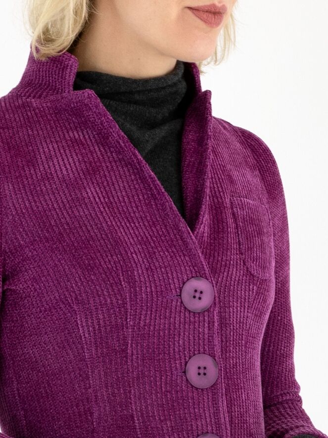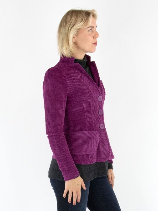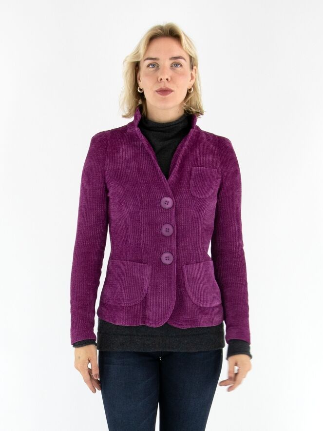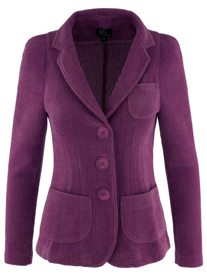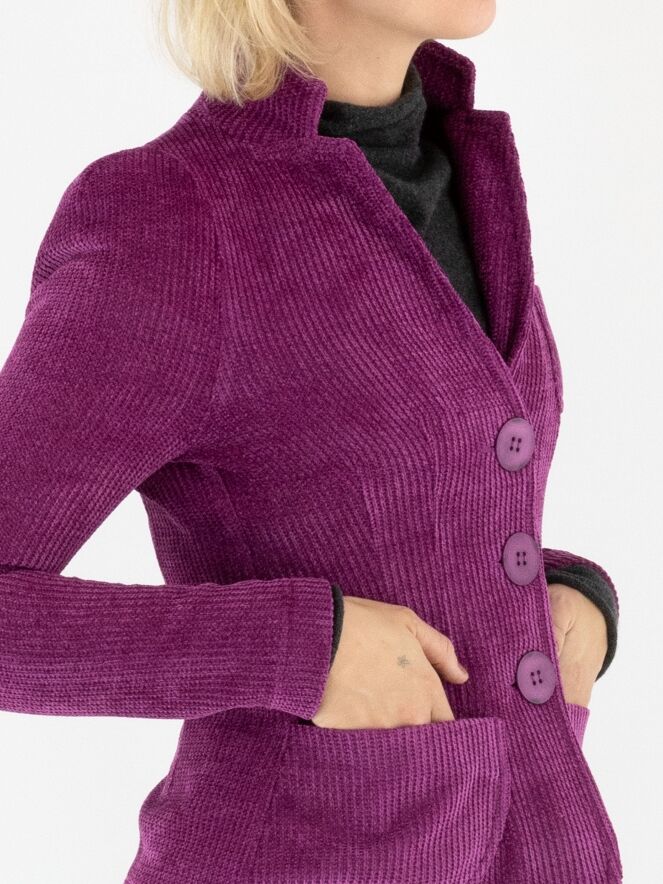 Blazer by ML Collections in a sophisticated purple shade. This designer blazer is crafted from luxurious ribcord fabric and designed without lining, giving it a fluid and refined look. The elegant womenswear piece closes with three buttons and highlights a timeless, feminine silhouette. For lasting quality, we recommend professional cleaning rather than washing.