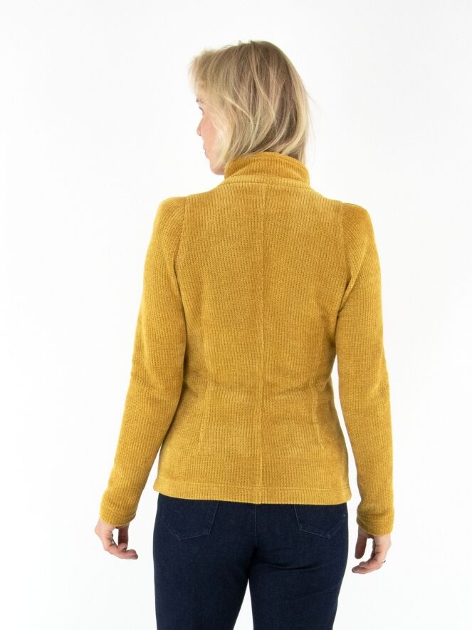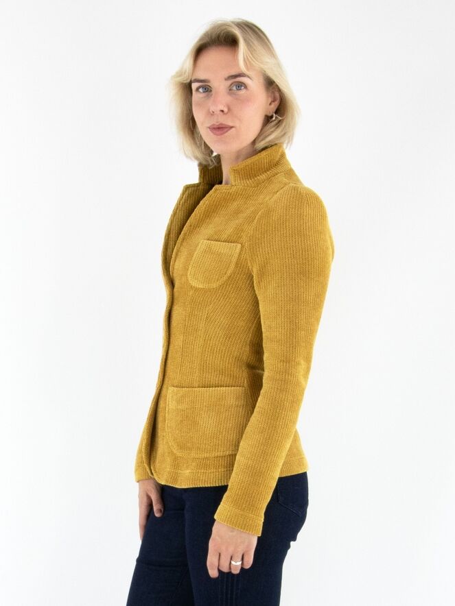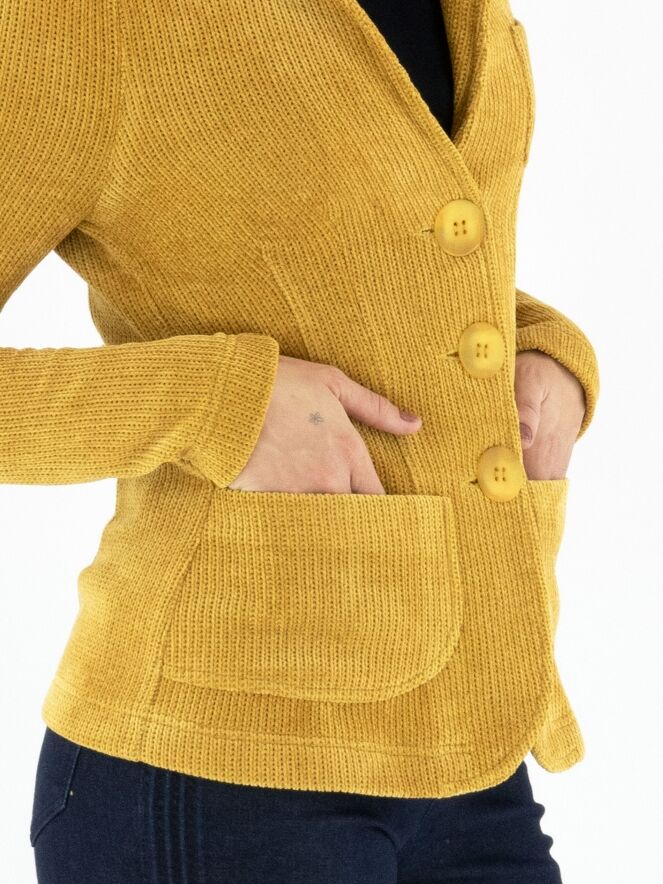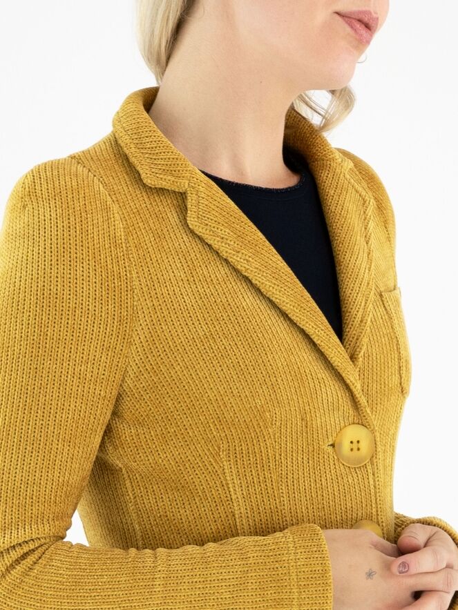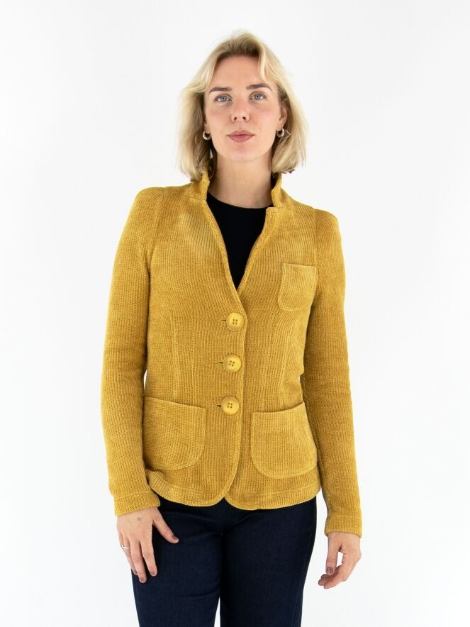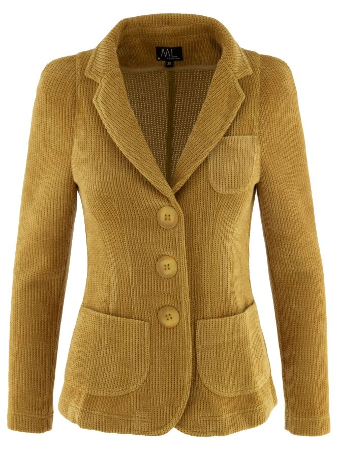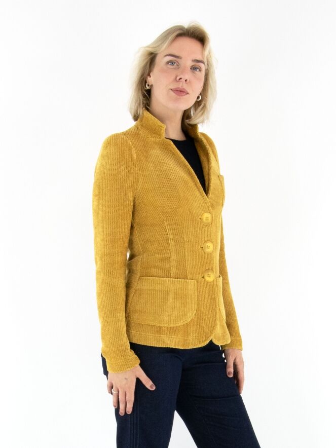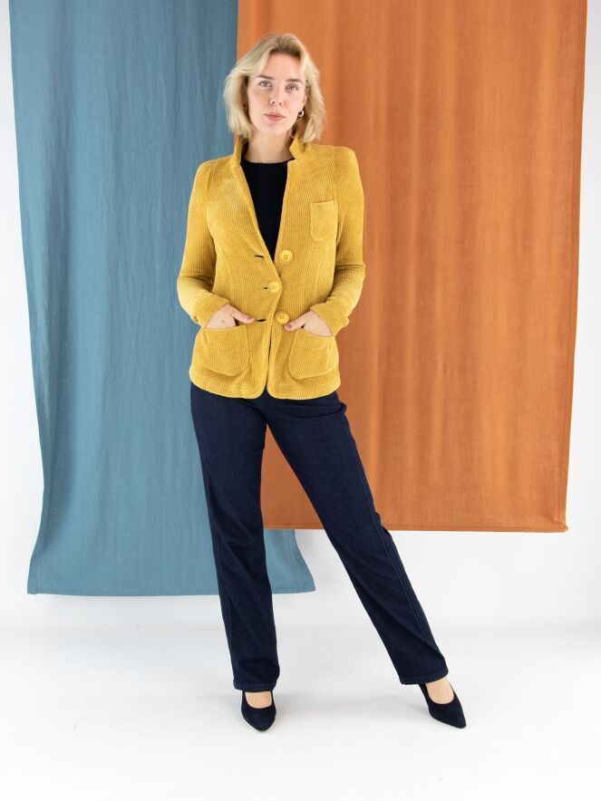 Blazer by ML Collections in a chic ochre yellow shade. This exclusive women’s blazer is crafted from luxurious ribcord fabric and designed without lining, giving it a graceful and refined drape. Featuring a three-button closure, this designer piece highlights a timeless and feminine silhouette. To maintain its premium quality, this blazer should not be washed.