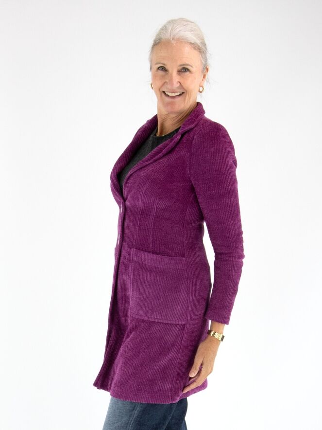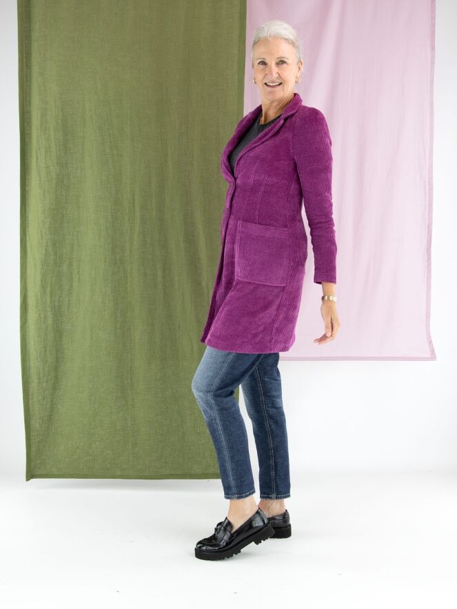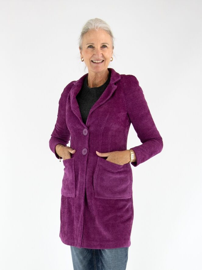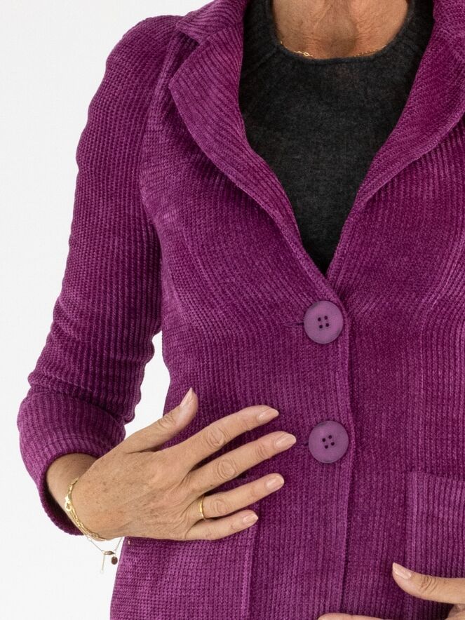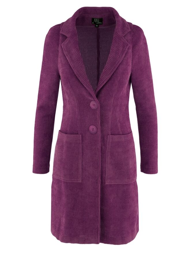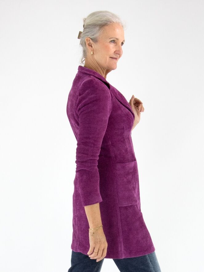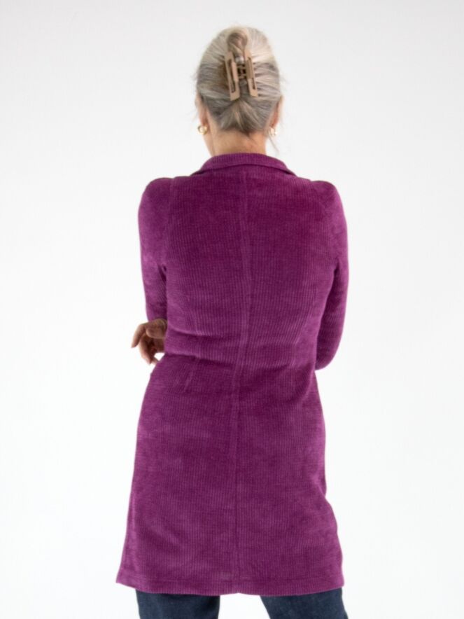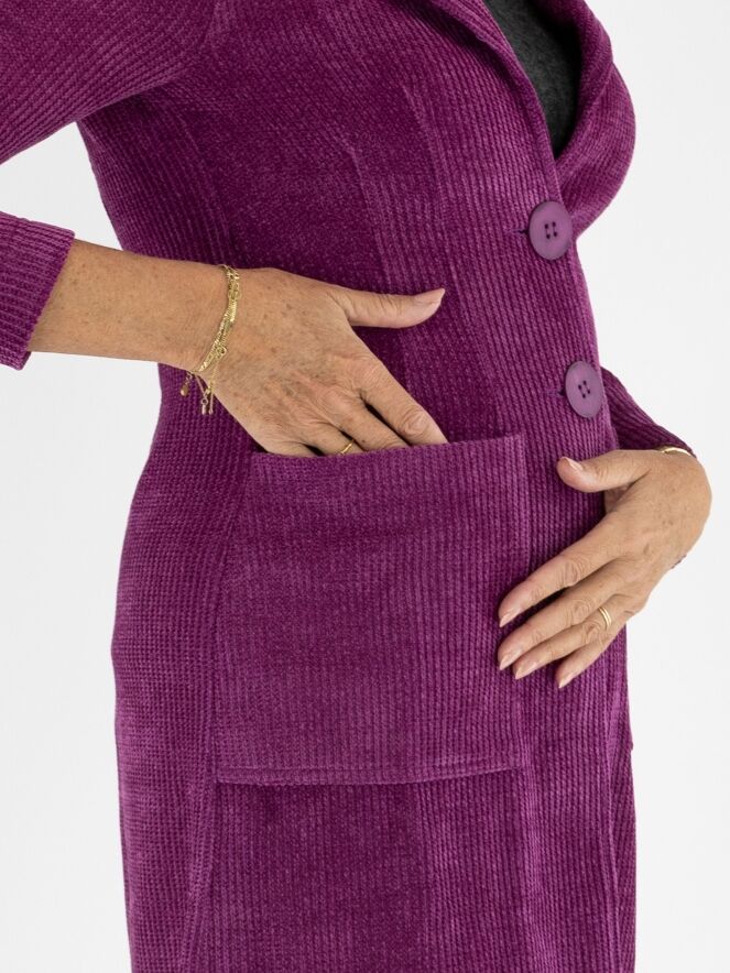 Long blazer by ML Collections in a sophisticated purple shade. Crafted from luxurious ribcord fabric and designed without lining, this blazer drapes gracefully with a refined elegance. Featuring a two-button closure, it highlights a timeless and feminine silhouette. To preserve its quality, this blazer should not be washed.