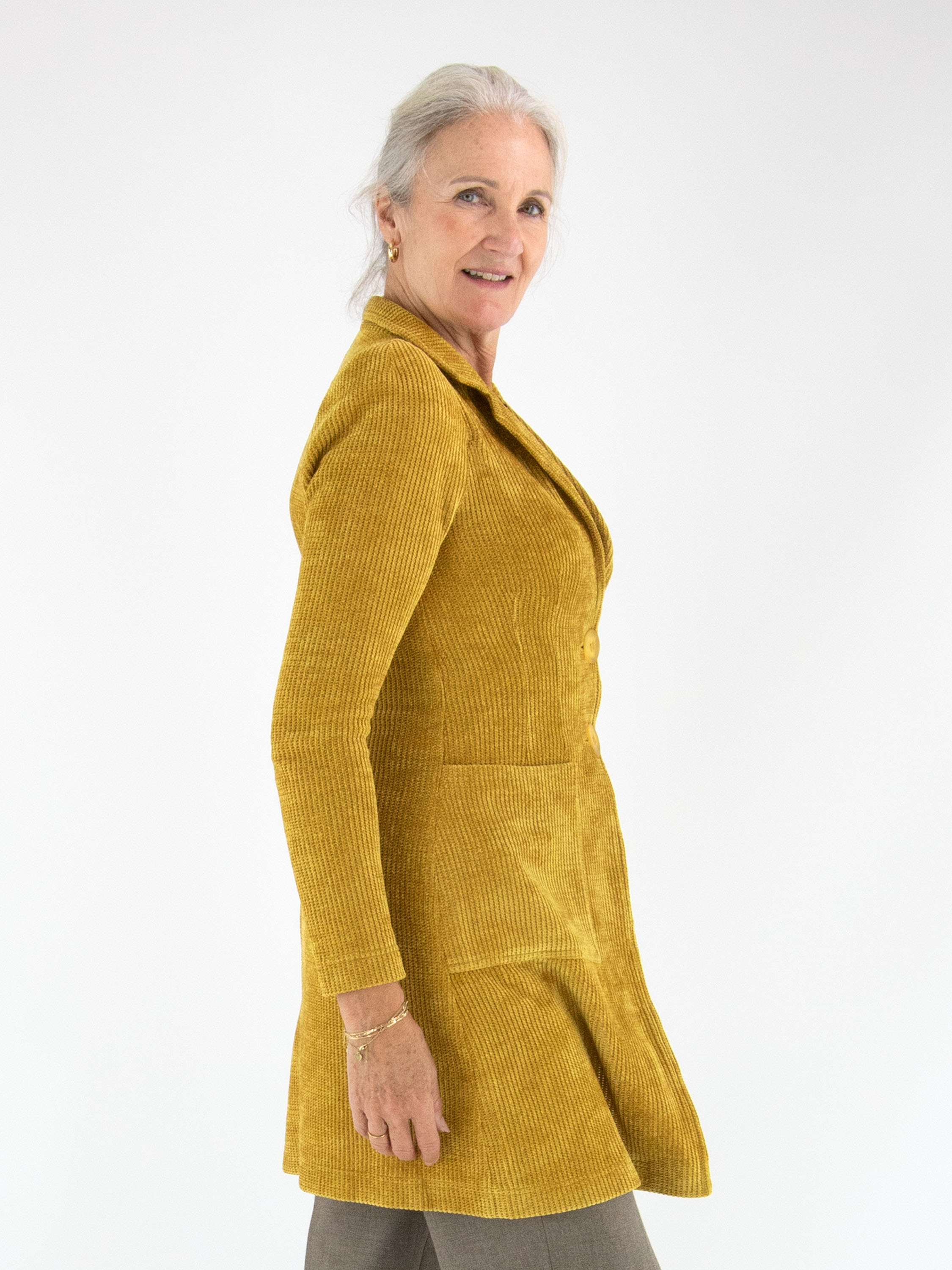 An elegant long blazer from ML Collections in a refined ochre yellow shade This blazer is crafted in a sophisticated ribcord quality and is deliberately unlined which makes it light and fluid The two button closure adds a touch of timeless elegance Please note this blazer must not be washed