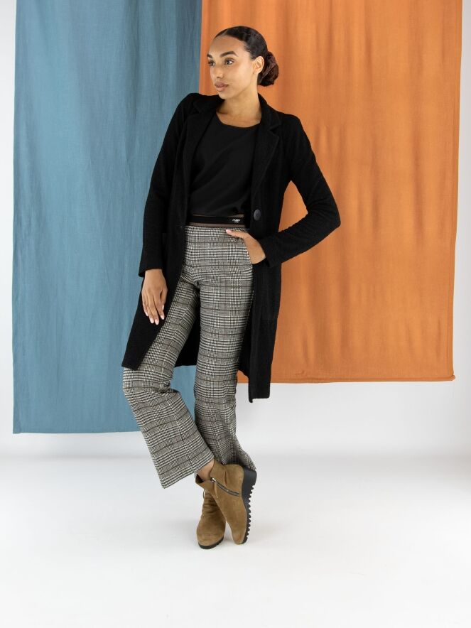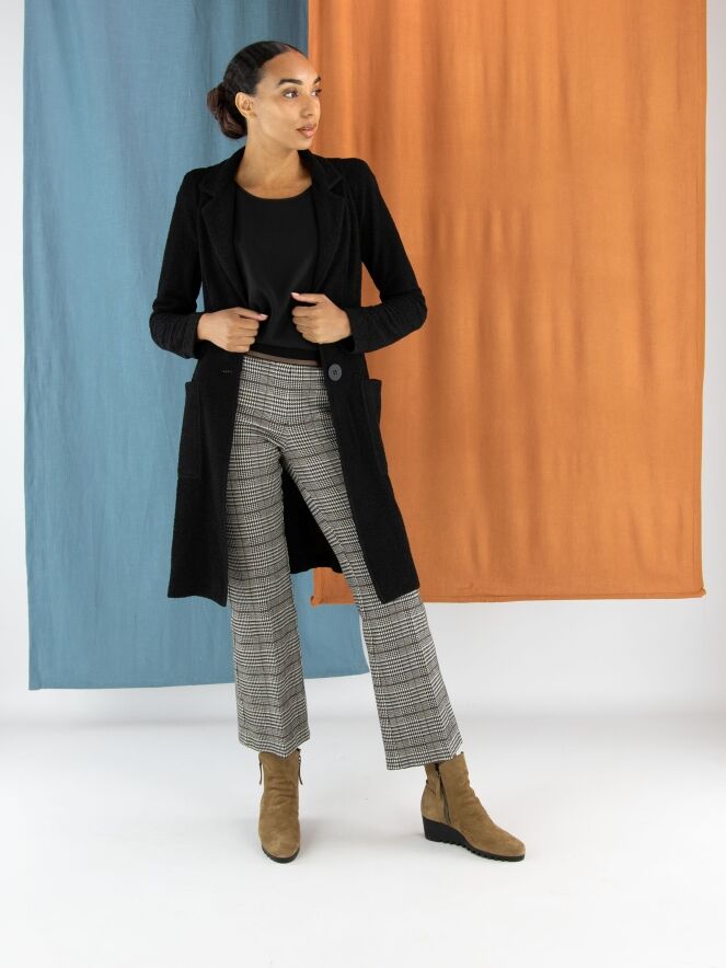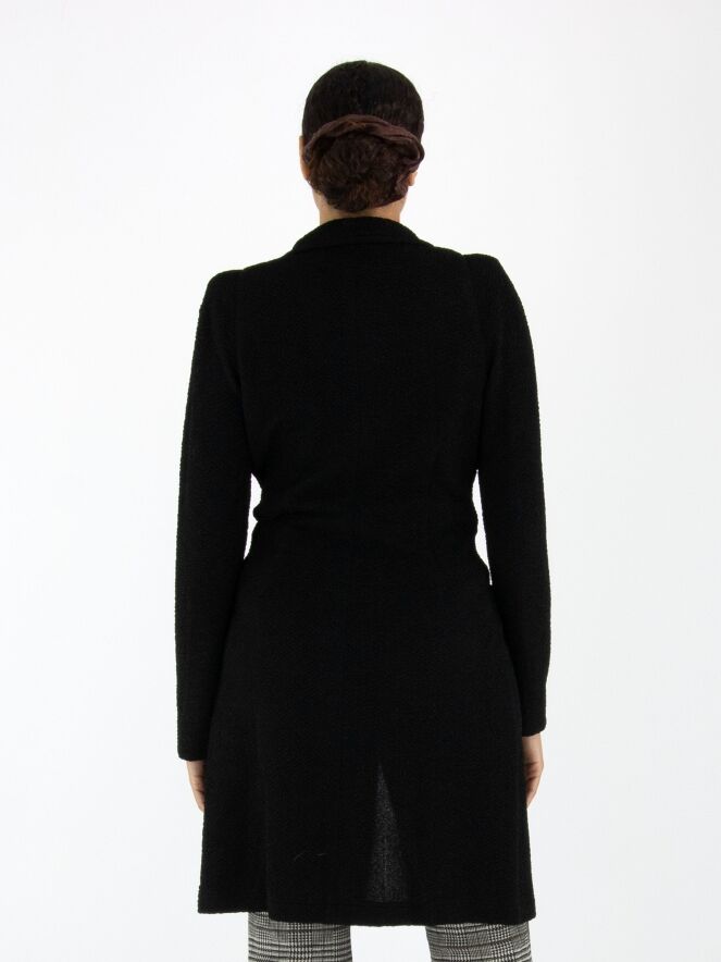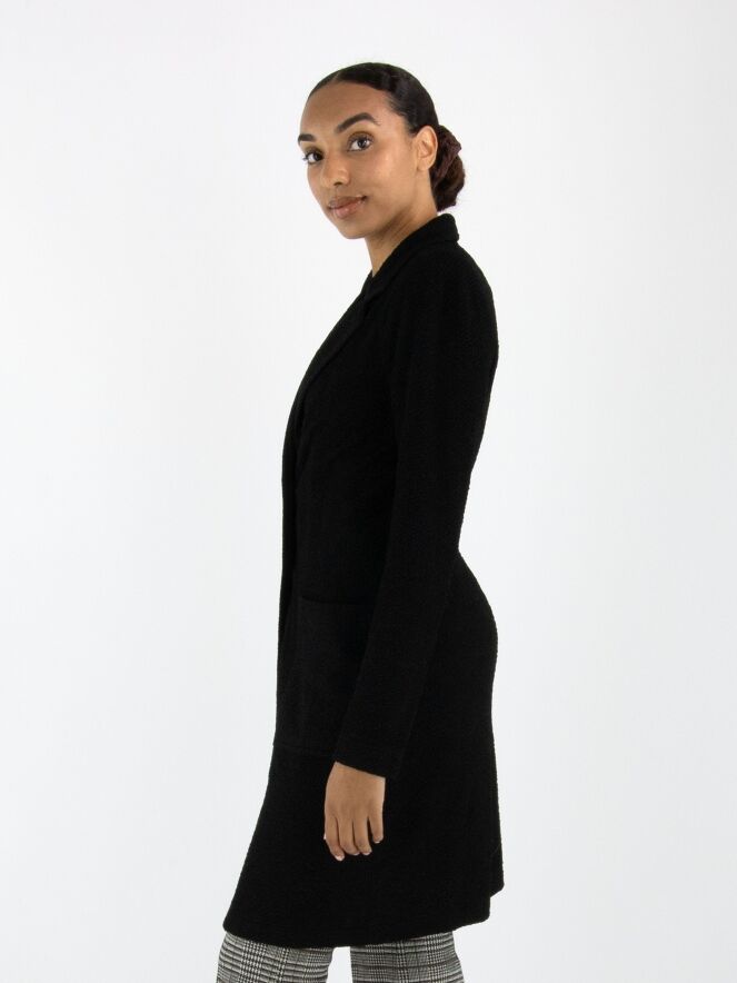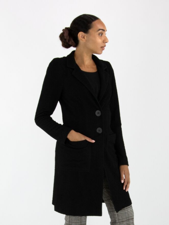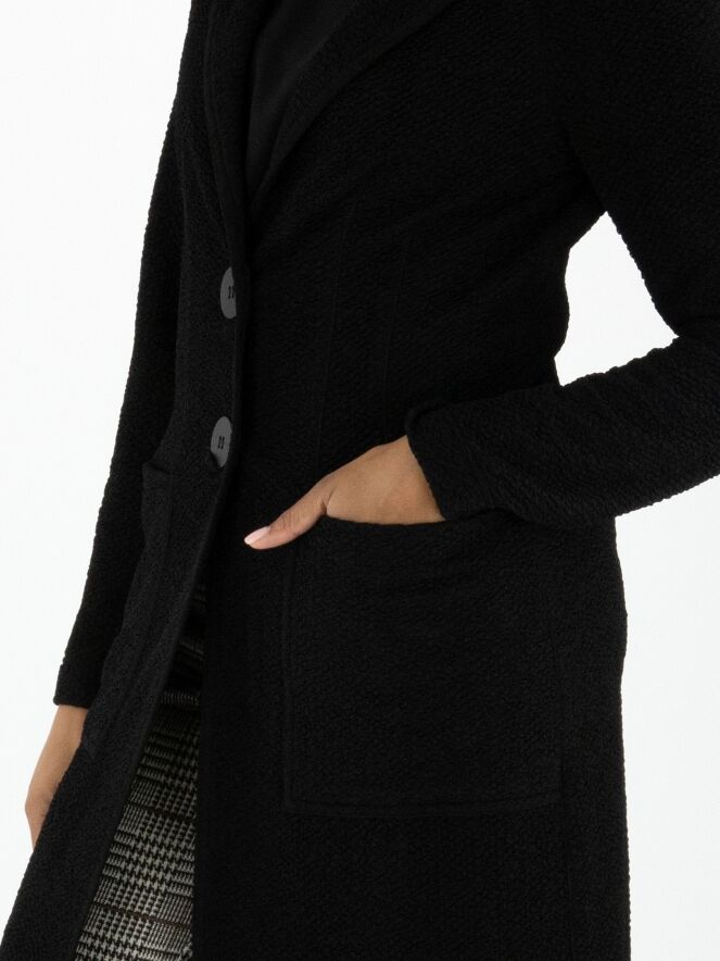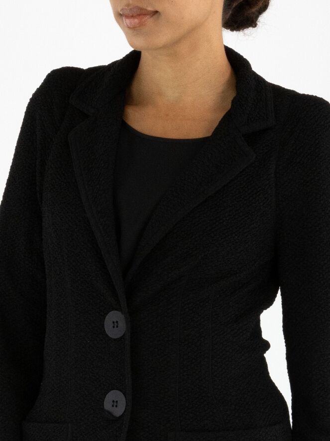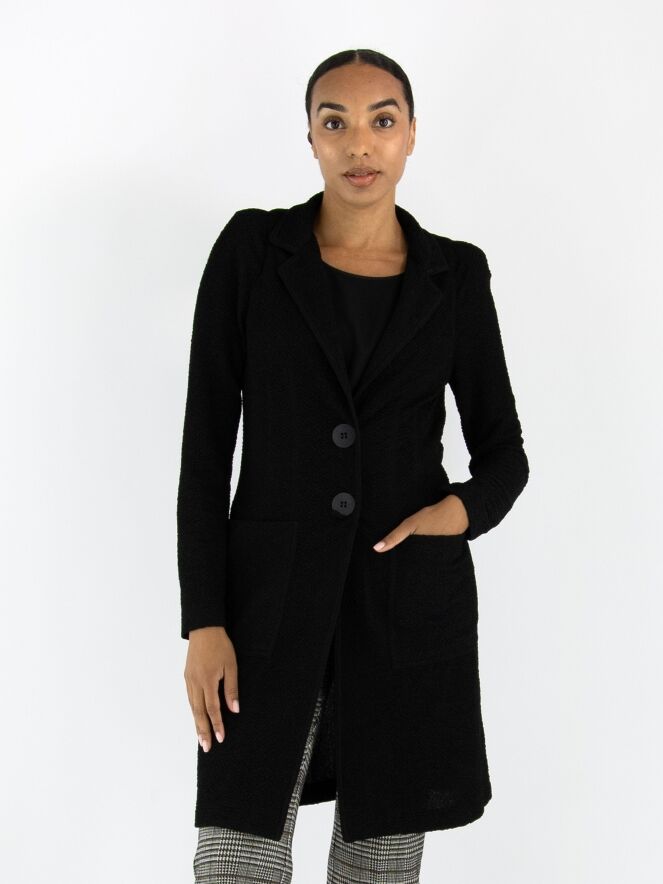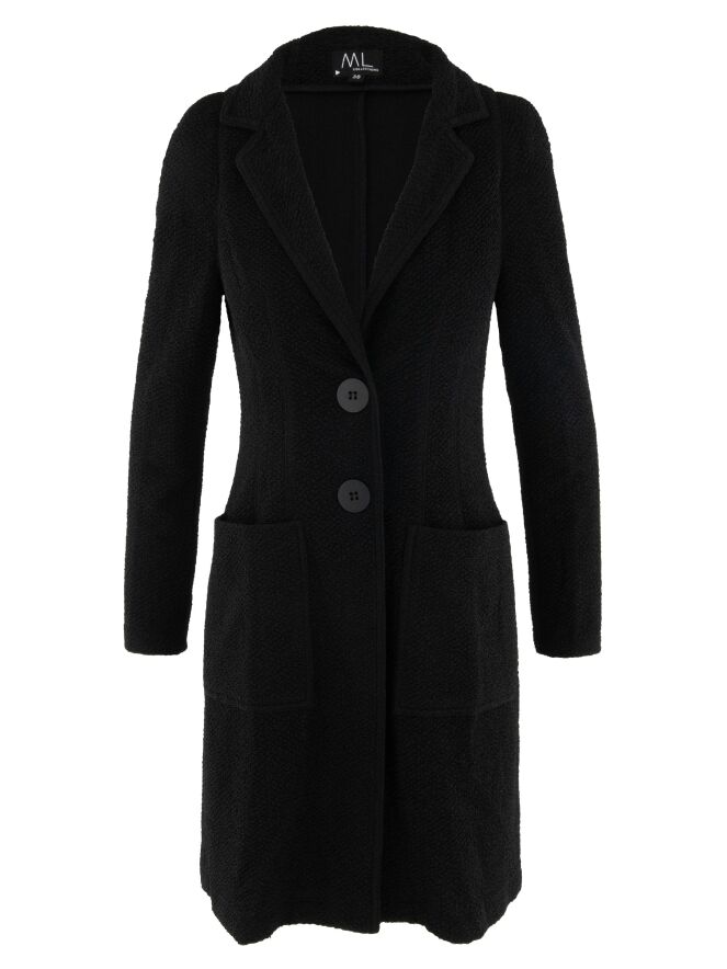 A long blazer by ML Collections in black. The fabric has a fine textured finish and is unlined. The blazer closes with two buttons. This blazer must not be washed.